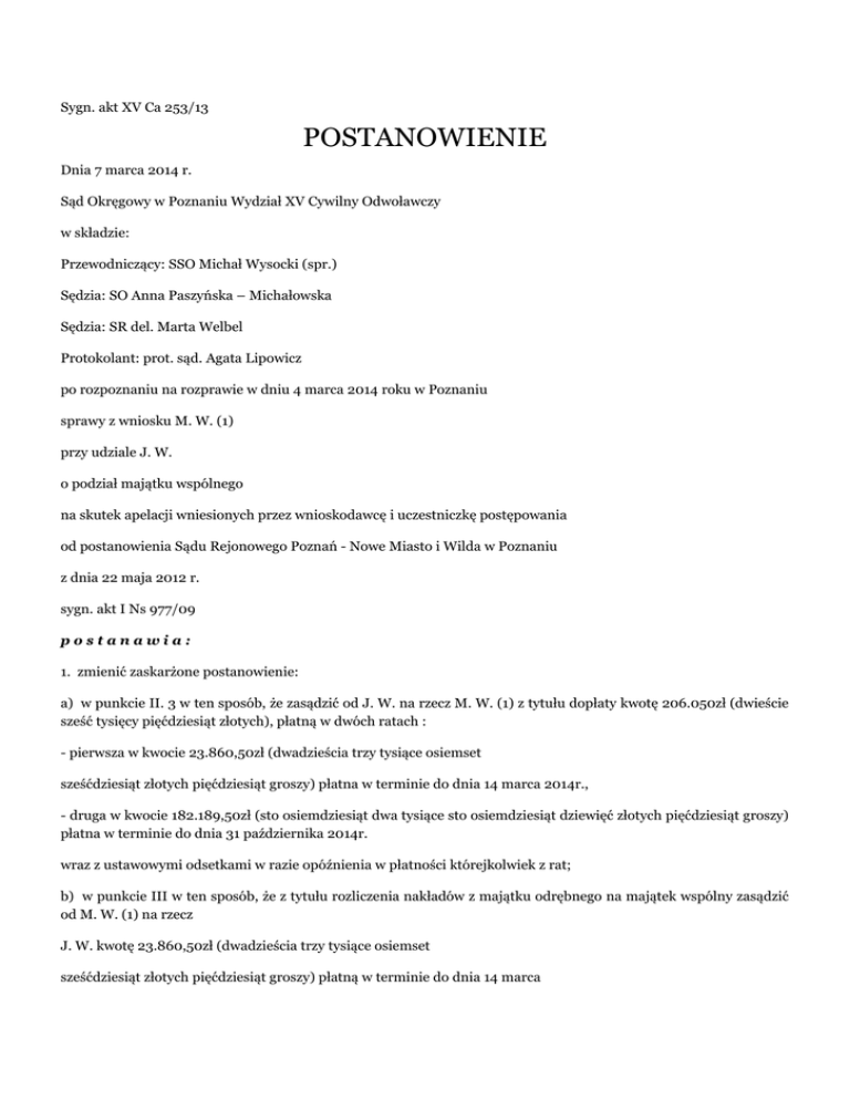 Sygn. akt XV Ca 253/13 POSTANOWIENIE Dnia 7 marca 2014 r. Sąd Okręgowy w Poznaniu Wydział XV Cywilny Odwoławczy w składzie: Przewodniczący: SSO Michał Wysocki (spr.) Sędzia: SO Anna Paszyńska – Michałowska Sędzia: SR del. Marta Welbel Protokolant: prot. sąd. Agata Lipowicz po rozpoznaniu na rozprawie w dniu 4 marca 2014 roku w Poznaniu sprawy z wniosku M. W. (1) przy udziale J. W. o podział majątku wspólnego na skutek apelacji wniesionych przez wnioskodawcę i uczestniczkę postępowania od postanowienia Sądu Rejonowego Poznań - Nowe Miasto i Wilda w Poznaniu z dnia 22 maja 2012 r. sygn. akt I Ns 977/09 postanawia: 1. zmienić zaskarżone postanowienie: a) w punkcie II. 3 w ten sposób, że zasądzić od J. W. na rzecz M. W. (1) z tytułu dopłaty kwotę 206.050zł (dwieście sześć tysięcy pięćdziesiąt złotych), płatną w dwóch ratach : - pierwsza w kwocie 23.860,50zł (dwadzieścia trzy tysiące osiemset sześćdziesiąt złotych pięćdziesiąt groszy) płatna w terminie do dnia 14 marca 2014r., - druga w kwocie 182.189,50zł (sto osiemdziesiąt dwa tysiące sto osiemdziesiąt dziewięć złotych pięćdziesiąt groszy) płatna w terminie do dnia 31 października 2014r. wraz z ustawowymi odsetkami w razie opóźnienia w płatności którejkolwiek z rat; b) w punkcie III w ten sposób, że z tytułu rozliczenia nakładów z majątku odrębnego na majątek wspólny zasądzić od M. W. (1) na rzecz J. W. kwotę 23.860,50zł (dwadzieścia trzy tysiące osiemset sześćdziesiąt złotych pięćdziesiąt groszy) płatną w terminie do dnia 14 marca 2014r. c) w punkcie VI w ten sposób, że wartość przedmiotu postępowania ustalić na kwotę 417.700zł, 2. dokonać sprostowania nazwisk wnioskodawcy i uczestniczki postępowania w zaskarżonym postanowieniu z (...) na (...) i z (...) na (...) 3. w pozostałym zakresie oddalić obie apelacje, 4. z tytułu nieuiszczonych kosztów sądowych nakazać ściągnąć od wnioskodawcy i uczestniczki na rzecz Skarbu Państwa – Sądu Okręgowego w Poznaniu kwoty po 750,84zł (siedemset pięćdziesiąt złotych osiemdziesiąt cztery grosze), 5. w pozostałym zakresie kosztami postępowania apelacyjnego obciążyć wnioskodawcę i uczestniczkę postępowania w zakresie przez nich poniesionym, 6. przyznać adwokatowi W. A. od Skarbu Państwa – Sądu Okręgowego w Poznaniu kwotę 6.642zł z tytułu kosztów nieopłaconej pomocy prawnej udzielonej uczestniczce z urzędu w postępowaniu apelacyjnym. /-/ A. Paszyńska – Michałowska/-/ M. Wysocki/-/ M. Welbel UZASADNIENIE Postanowieniem z dnia 22 maja 2012r. Sąd Rejonowy Poznań – Nowe Miasto i Wilda w Poznaniu, w sprawie z wniosku M. W. (1)przy udziale J. W.o podział majątku wspólnego, w pkt. I ustalił równe udziały w majątku wspólnym wnioskodawcy i uczestniczki postępowania; w pkt. II dokonał podziału majątku wspólnego w/w w ten sposób, że: 1) prawo własności nieruchomości położonej w P., przy ulicy (...), o pow. 0.0242 ha, stanowiącej działkę nr (...), dla której Sąd Rejonowy (...) w P.prowadzi księgę wieczystą nr (...)przyznał wyłącznie J. W.; 2) prawo własności zestawu mebli sypialnianych oraz pralki automatycznej A.przyznał wyłącznie M. W. (1); 3) zasądził od J. W.na rzecz M. W. (1)tytułem spłaty kwotę 288.121zł płatną w dwóch rocznych ratach w kwocie po 144.060,50zł, pierwsza rata płatna w terminie 1 roku od daty uprawomocnienia się postanowienia, wraz z ustawowymi odsetkami w razie opóźnienia w płatności którejkolwiek z rat; w pkt. III zasądził od wnioskodawcy na rzecz uczestniczki postępowania kwotę 29.782zł tytułem rozliczenia nakładów z majątku odrębnego na majątek wspólny; w pkt. IV w pozostałym zakresie wniosek o rozliczenie nakładów uczestniczki postępowania z jej majątku odrębnego na majątek wspólny oddalił; w pkt. V oddalił wniosek wnioskodawcy o rozliczenie pożytków; w pkt. VI wartość przedmiotu postępowania ustalił na kwotę 581.842zł; a w pkt. VII kosztami postępowania obciążył wnioskodawcę i uczestniczkę postępowania po połowie, szczegółowe wyliczenie pozostawiając referendarzowi sądowemu. Wydając powyższe rozstrzygnięcie Sąd Rejonowy ustalił następujący stan faktyczny: J. W. (zd. M.) oraz M. W. (1) zawarli związek małżeński w dniu 13 września 1980r. Nie zawierali między sobą żadnych umów majątkowych. W styczniu (...) urodził się syn stron – D.. Do lutego 1982r. J. mieszkała w K. - w domu rodzinnym swoich rodziców. W tym czasie M. W. (1) odbywał służbę wojskową. Po odbyciu służby wojskowej, w 1982r. małżeństwo wraz z synem zamieszkało w wynajmowanym domku w G. pod P.. W (...) urodził się młodszy syn - M.. W okresie od 1 lutego 1980r. do 31 lipca 1984r. J. W. zatrudniona była w Spółdzielni Pracy (...), przy czym po urodzeniu starszego syna przebywała na urlopach macierzyńskich bądź wychowawczych łącznie do 31 lipca 1984r. Następnie zatrudniona została w tzw. firmie polonijnej, pracując na akord. W latach 80-tych M. W. (1) pracował na 1 i 1/2 etatu, dorabiając jako palacz. Zarówno wnioskodawca jak i uczestniczka postępowania pracowali zawodowo przez cały okres wspólności majątkowej. Dnia 5 maja 1984r. rodzice uczestniczki postępowania M.i M. M.darowali J. W.do jej majątku odrębnego kwotę 50.000zł na zakup nieruchomości przy ul. (...)w P., a J. W.przyjęła darowiznę i zobowiązała się przeznaczyć darowaną kwotę na cel określony w umowie. Wnioskodawca i uczestniczka postępowania nie zwracali tych pieniędzy rodzicom. Umowę notarialną związaną z nabyciem prawa użytkowania wieczystego nieruchomości położonej w P. przy ul. (...) zawarto w dniu 17 maja 1984r. Opłata jednorazowa wyniosła 42.350zł i została ona w całości pokryta ze środków uzyskanych w formie darowizny od rodziców uczestniczki postępowania. Małżonkowie W. postanowili wybudować dom na nabytej działce. Budowa rozpoc
