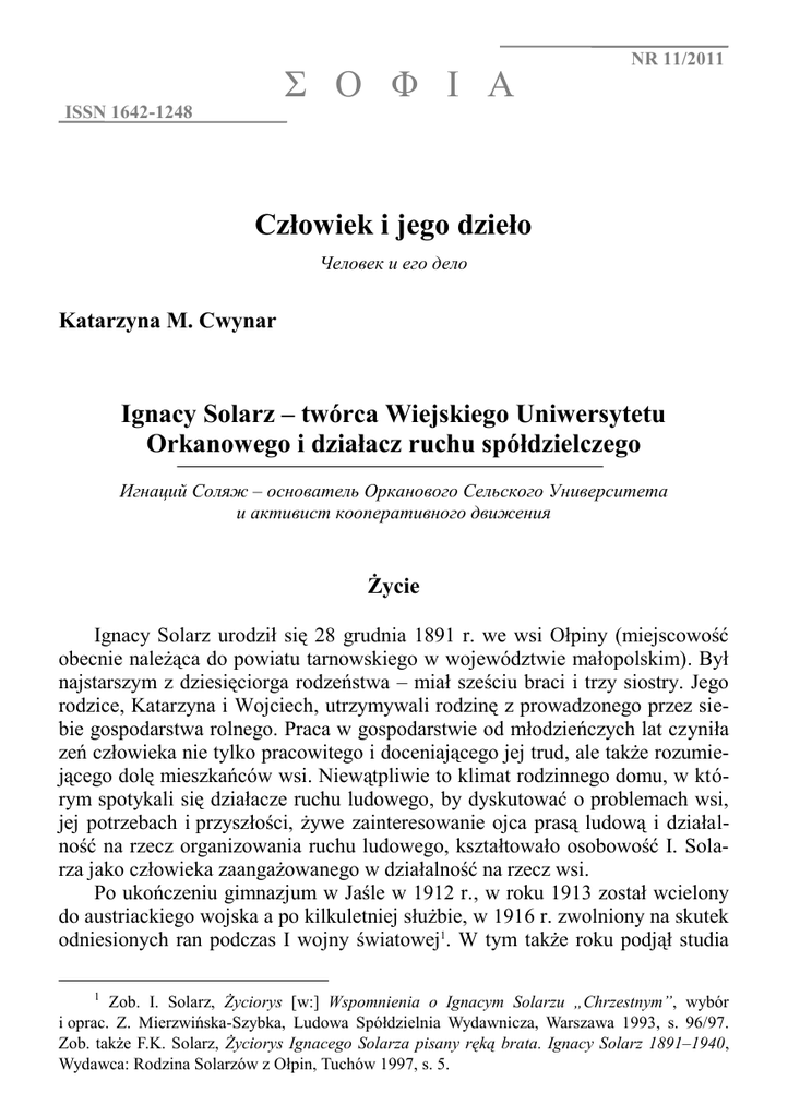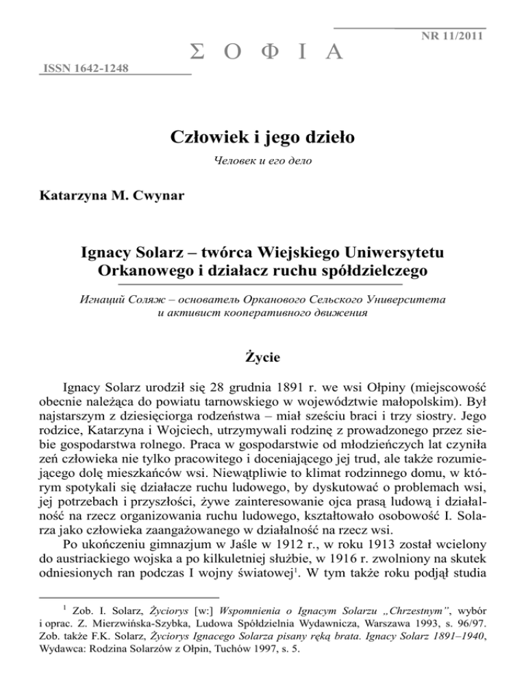 Σ Ο Φ Ι Α ISSN 1642-1248 NR11/2011 7/2007 NR ISSN 1642-1248 Człowiek i jego dzieło Человек и его дело Katarzyna M. Cwynar Ignacy Solarz – twórca Wiejskiego Uniwersytetu Orkanowego i działacz ruchu spółdzielczego Игнаций Соляж – основатель Орканового Сельского Университета и активист кооперативного движения Życie Ignacy Solarz urodził się 28 grudnia 1891 r. we wsi Ołpiny (miejscowość obecnie należąca do powiatu tarnowskiego w województwie małopolskim). Był najstarszym z dziesięciorga rodzeństwa – miał sześciu braci i trzy siostry. Jego rodzice, Katarzyna i Wojciech, utrzymywali rodzinę z prowadzonego przez siebie gospodarstwa rolnego. Praca w gospodarstwie od młodzieńczych lat czyniła zeń człowieka nie tylko pracowitego i doceniającego jej trud, ale także rozumiejącego dolę mieszkańców wsi. Niewątpliwie to klimat rodzinnego domu, w którym spotykali się działacze ruchu ludowego, by dyskutować o problemach wsi, jej potrzebach i przyszłości, żywe zainteresowanie ojca prasą ludową i działalność na rzecz organizowania ruchu ludowego, kształtowało osobowość I. Solarza jako człowieka zaangażowanego w działalność na rzecz wsi. Po ukończeniu gimnazjum w Jaśle w 1912 r., w roku 1913 został wcielony do austriackiego wojska a po kilkuletniej służbie, w 1916 r. zwolniony na skutek odniesionych ran podczas I wojny światowej1. W tym także roku podjął studia 1 Zob. I. Solarz, Życiorys [w:] Wspomnienia o Ignacym Solarzu „Chrzestnym”, wybór i oprac. Z. Mierzwińska-Szybka, Ludowa Spółdzielnia Wydawnicza, Warszawa 1993, s. 96/97. Zob. także F.K. Solarz, Życiorys Ignacego Solarza pisany ręką brata. Ignacy Solarz 1891–1940, Wydawca: Rodzina Solarzów z Ołpin, Tuchów 1997, s. 5. Человек и его дело 332 rolnicze na Uniwersytecie Jagiellońskim. W roku 1920 jako ochotnik wojska polskiego brał udział w wojnie polsko-bolszewickiej. Studia ukończył rok później, uzyskując dyplom inżyniera rolnego. Podczas studiów angażował się w działalność społeczną związaną z ruchem ludowym, wygłaszając odczyty dla młodzieży wiejskiej dotyczące gospodarczego i społeczno-kulturowego rozwoju wsi. Po podjęciu pracy w 1921 r. w Małopolskim Towarzystwie Rolniczym (MTR) jako instruktor rolny i inspektor kółek rolniczych, uświadomił sobie, iż wieś polska w większym stopniu niż doskonalenia uprawy roli potrzebuje wyzwolenia się z zakorzenionego poddaństwa i ciemnoty. Wyzwolenie to widział poprzez oświecenie i uświadomienie roli, jaką powinna pełnić społeczność wiejska w kształtowaniu demokracji. W tym duchu realizował się w swojej pracy przekazując mieszkańcom wsi nie tylko wiedzę rolniczą, ale przede wszystkim idee działania kooperatywnego jako odpowiedzialnego i samorządnego działania demokratycznego. Na skutek przekroczenia swoich kompetencji jako inspektora kółek rolniczych, I. Solarz został w 1922 roku skierowany przez MTR do pracy w żeńskiej szkole rolniczej w Sąsiadowicach, gdzie powierzono mu funkcję dyrektora. Po kilkumiesięcznej2 pracy dydaktycznej został następnie oddelegowany na czteromiesięczną praktykę do Danii, gdzie pracował w gospodarstwach rolnych, szkole rolniczej i mleczarni3. Tam też poznał idee Nicolai F.S. Grundtviga realizowane w tamtejszych uniwersytetach ludowych. Po powrocie do kraju włączył się w dyskusje nad projektem powołania przez Związek Nauczycielstwa Szkół Powszechnych uniwersytetu ludowego. W 1924 roku Wydział Oświaty Pozaszkolnej Związku Nauczycielstwa Szkół Powszechnych powierzył mu funkcję dyrektora Uniwersytetu Ludowego (UL) utworzonego w Szycach pod Krakowem. Tu poznał swoją przyszłą żonę i współpracownika, Zofię Michałowską (1902–1988)4 prowadzącą zajęcia z literatury i wychowania, instruktorkę teatralną amatorskich teatrów wiejskich. Oprócz działalności dydaktycznowychowawczej publikował artykuły dotyczące uniwersytetów ludowych, kultury ludowej i wychowania na łamach „Polskiej Oświaty Pozaszkolnej”, „Młodej Polski” oraz pisma „Siew”. Nawiązując współpracę z Centralnym Związkiem Młodzieży Wiejskiej, został wybrany w roku 1926 na wiceprezesa tej organizacji, pełniąc tę funkcję do 1928 roku. W roku 1927 pełnił funkcję starosty pierwszych ogólnopolskich dożynek – 28 sierpnia 1927 r. – w Spale, zapoczątkowanych 2 Powołuję się tu na opracowanie Tadeusza Pilcha. Zob. idem, Kalendarium życia i działalności Ignacego Solarza [w:] Wspomnienia o Ignacym Solarzu „Chrzestnym”, wybór i oprac. Z. Mierzwińska-Szybka, Ludowa Spółdzielnia Wydawnicza, Warszawa 1983, s. 415. Lucjan Turos natomiast pisze o kilku tygodniach. Zob. L. Turos, Patrzeć szeroko i daleko... Dziedzictwo pedagogiczne I. Solarza, Wydawnictwo Spółdzielcze, Warszawa 1983, s. 9. 3 Zob. I. Solarz, Życiorys [w:] Wspomnienia..., s. 96/97. Zob. także T. Pilch, Kalendarium życia..., s. 415. 4 Ignacy Solarz i Zofia Michałowska mieli troje dzieci: Jadwiga (1925–1931), Andrzej (1928–), Wojciech (1934–). Człowiek i jego dzieło 333 z inicjatywy prezydenta II RP Ignacego Mościckiego. Za działalność oświatową został w roku 1927 odznaczony Orderem Odrodzenia Polski („Polonia Restituta”). W 1928 r. na skutek rozłamu ideowego pomiędzy Centralnym Związkiem Młodzieży Wiejskiej a nadrzędnym Centralnym Związkiem Kółek Rolniczych, I. Solarz zainicjował powstanie samodzielnej organizacji o nazwie Związek Młodzieży Wiejskiej Rzeczpospolitej Polskiej „Wici”. Część członków aprobująca rządy sanacji utworzyła zaś Centralny Związek Młodzieży Wiejskiej „Siew”. W swym działaniu oświatowo-wychowawczym i społecznym realizowanym w Uniwersytecie Ludowym skierowanym przede wszystkim do młodego pokolenia na stałe związał się z ZMW „Wici”, będąc ta