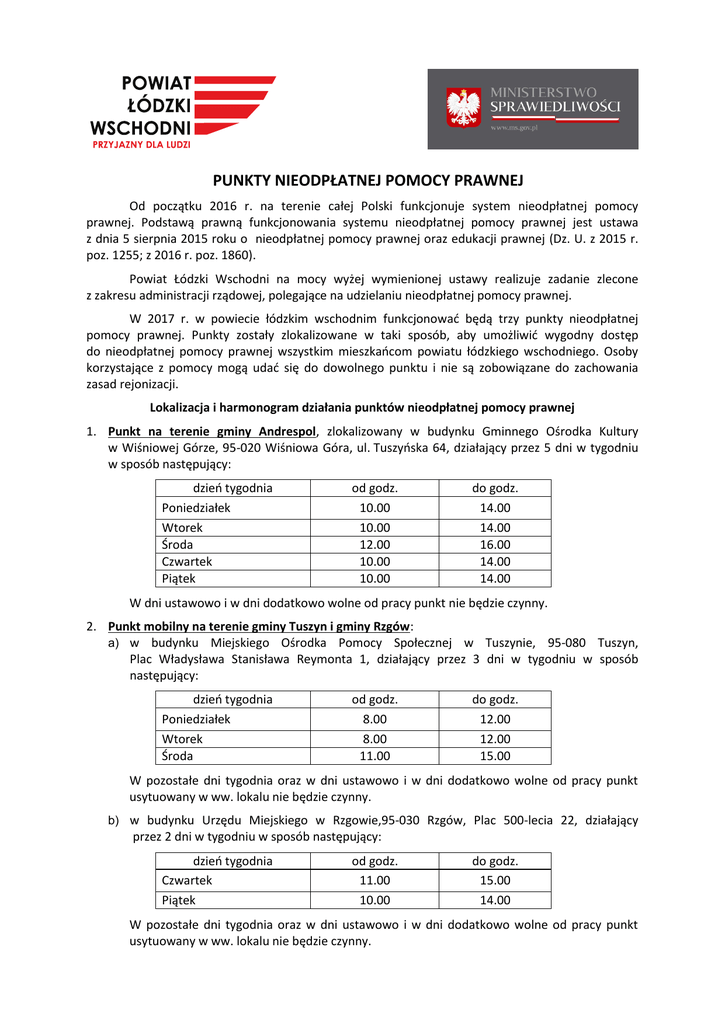PUNKTY NIEODPŁATNEJ POMOCY PRAWNEJ Od początku 2016 r. na terenie całej Polski funkcjonuje system nieodpłatnej pomocy prawnej. Podstawą prawną funkcjonowania systemu nieodpłatnej pomocy prawnej jest ustawa z dnia 5 sierpnia 2015 roku o nieodpłatnej pomocy prawnej oraz edukacji prawnej (Dz. U. z 2015 r. poz. 1255; z 2016 r. poz. 1860). Powiat Łódzki Wschodni na mocy wyżej wymienionej ustawy realizuje zadanie zlecone z zakresu administracji rządowej, polegające na udzielaniu nieodpłatnej pomocy prawnej. W 2017 r. w powiecie łódzkim wschodnim funkcjonować będą trzy punkty nieodpłatnej pomocy prawnej. Punkty zostały zlokalizowane w taki sposób, aby umożliwić wygodny dostęp do nieodpłatnej pomocy prawnej wszystkim mieszkańcom powiatu łódzkiego wschodniego. Osoby korzystające z pomocy mogą udać się do dowolnego punktu i nie są zobowiązane do zachowania zasad rejonizacji. Lokalizacja i harmonogram działania punktów nieodpłatnej pomocy prawnej 1. Punkt na terenie gminy Andrespol, zlokalizowany w budynku Gminnego Ośrodka Kultury w Wiśniowej Górze, 95-020 Wiśniowa Góra, ul. Tuszyńska 64, działający przez 5 dni w tygodniu w sposób następujący: dzień tygodnia Poniedziałek Wtorek Środa Czwartek Piątek od godz. 10.00 10.00 12.00 10.00 10.00 do godz. 14.00 14.00 16.00 14.00 14.00 W dni ustawowo i w dni dodatkowo wolne od pracy punkt nie będzie czynny. 2. Punkt mobilny na terenie gminy Tuszyn i gminy Rzgów: a) w budynku Miejskiego Ośrodka Pomocy Społecznej w Tuszynie, 95-080 Tuszyn, Plac Władysława Stanisława Reymonta 1, działający przez 3 dni w tygodniu w sposób następujący: dzień tygodnia Poniedziałek Wtorek Środa od godz. 8.00 8.00 11.00 do godz. 12.00 12.00 15.00 W pozostałe dni tygodnia oraz w dni ustawowo i w dni dodatkowo wolne od pracy punkt usytuowany w ww. lokalu nie będzie czynny. b) w budynku Urzędu Miejskiego w Rzgowie,95-030 Rzgów, Plac 500-lecia 22, działający przez 2 dni w tygodniu w sposób następujący: dzień tygodnia Czwartek Piątek od godz. 11.00 10.00 do godz. 15.00 14.00 W pozostałe dni tygodnia oraz w dni ustawowo i w dni dodatkowo wolne od pracy punkt usytuowany w ww. lokalu nie będzie czynny. 3. Punkt na terenie Gminy Koluszki, zlokalizowany w budynku Urzędu Miejskiego w Koluszkach,95-040 Koluszki, ul. 11-go Listopada 65, działający przez 5 dni w tygodniu w sposób następujący: dzień tygodnia Poniedziałek Wtorek Środa Czwartek Piątek od godz. 9.00 12.00 9.00 9.00 9.00 do godz. 13.00 16.00 13.00 13.00 13.00 W dni ustawowo i w dni dodatkowo wolne od pracy punkt nie będzie czynny Komu może być udzielana nieodpłatna pomoc prawna Nieodpłatna pomoc prawna, zgodnie z ustawą, przysługuje osobie fizycznej zwanej dalej „osobą uprawnioną”: 1) której w okresie 12 miesięcy poprzedzających zwrócenie się o udzielenie nieodpłatnej pomocy prawnej zostało przyznane świadczenie z pomocy społecznej na podstawie ustawy z dnia 12 marca 2004 r. o pomocy społecznej i wobec której w tym okresie nie wydano decyzji o zwrocie nienależnie pobranego świadczenia lub 2) która posiada ważną Kartę Dużej Rodziny, o której mowa w ustawie z dnia 5 grudnia 2014 r. o Karcie Dużej Rodziny, lub 3) która uzyskała zaświadczenie, o którym mowa w ustawie z dnia 24 stycznia 1991 r. o kombatantach oraz niektórych osobach będących ofiarami represji wojennych i okresu powojennego, lub 4) która posiada ważną legitymację weterana albo legitymację weterana poszkodowanego, o których mowa w ustawie z dnia 19 sierpnia 2011 r. o weteranach działań poza granicami państwa, lub 5) która nie ukończyła 26 lat, lub 6) która ukończyła 65 lat, lub 7) która w wyniku wystąpienia klęski żywiołowej, katastrofy naturalnej lub awarii technicznej znalazła się w sytuacji zagrożenia lub poniosła straty, lub 8) która jest w ciąży. Osoba ubiegająca się o nieodpłatną pomoc prawną zobowiązana jest udokumentować swoje uprawnienia zgodnie z art. 4 ust. 2 pkt 1-5 i 7 ustawy z dnia 5 sierpnia 2015 roku o nieodpłatnej pomocy prawnej oraz edukacji prawnej oraz okazać dokument stwierdzający tożsamość na żądanie osoby udzielającej pomocy prawnej. Na czym będzie polegać nieodpłatna pomoc prawna Nieodpłatna pomoc prawna, zgodnie z ustawą, obejmuje: 1) poinformowanie osoby uprawnionej o obowiązującym stanie prawnym, o przysługujących jej uprawnieniach lub o spoczywających na niej obowiązkach, lub 2) wskazaniu osobie uprawnionej sposobu rozwiązania dotyczącego jej problemu prawnego, lub 3) udzielenie pomocy w sporządzeniu projektu pisma w sprawach, o których mowa w pkt 1 i 2, z wyłączeniem pism procesowych w toczącym się postępowaniu przygotowawczym lub sądowym i pism w postępowaniu sądowoadministracyjnym, lub 4) sporządzenie projektu pisma o zwolnienie od kosztów sądowych lub o ustanowienie pełnomocnika z urzędu w postępowaniu sądowym lub ustanowienie adwokata, radcy prawnego, doradcy podatkowego lub rzecznika patentowego w postępowaniu sądowo administracyjnym. Jakiego zakresu prawa dotyczyć będzie nieodpłatna pomoc prawna Uprawnieni, zgodnie z ustawą, będą mogli uzyskać informacje w zakresie: 1) 2) 3) 4) 5) 6) 7) 8) prawa pracy, przygotowania do rozpoczęcia działalności gospodarczej, prawa cywilnego, spraw karnych, spraw administracyjnych, ubezpieczenia społecznego, spraw rodzinnych, prawa podatkowego z wyłączeniem spraw podatkowych związanych z prowadzeniem działalności gospodarczej, 9) kobietom w ciąży, nieodpłatna pomoc prawna udzielana jest w zakresie związanym z ciążą i urodzeniem dziecka, w szczególności praw rodzicielskich i uprawnień pracowniczych. Pomoc nie będzie obejmowała: 1) spraw podatkowych związanych z prowadzeniem działalności gospodarczej 2) z zakresu prawa celnego, dewizowego, handlowego 3) związanych z prowadzeniem działalności gospodarczej, z wyjątkiem przygotowania do rozpoczęcia tej działalności. Kto będ