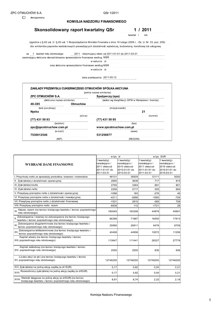 ZPC OTMUCHÓW S.A. QSr 1/2011 skorygowany KOMISJA NADZORU FINANSOWEGO Skonsolidowany raport kwartalny QSr 1 / 2011 kwartał / rok (zgodnie z § 82 ust. 2 i § 83 ust. 1 Rozporządzenia Ministra Finansów z dnia 19 lutego 2009 r. - Dz. U. Nr 33, poz. 259) dla emitentów papierów wartośc iowyc h prowadząc ych działalność wytwórczą, budowlaną, handlową lub usługową za 1 kwartał roku obrotowego 2011 obejmujący okres od 2011-01-01 do 2011-03-31 zawierając y skróc one skonsolidowane sprawozdanie finansowe według MSR w walucie zł oraz skróc one sprawozdanie finansowe według MSR w walucie zł data przekazania: 2011-05-12 ZAKŁADY PRZEMYSŁU CUKIERNICZEGO OTMUCHÓW SPÓŁKA AKCYJNA (pełna nazwa emitenta) ZPC OTMUCHÓW S.A. Spożywczy (spo) (skróc ona nazwa emitenta) 48-385 (sektor wg klasyfikacji GPW w Warszawie / branża) Otmuchów (kod poc ztowy) (miejscowość) Nyska 21 (ulica) (numer) (77) 431 50 83 (77) 431 50 85 (telefon) (fax) [email protected] www.zpcotmuchow.com.pl (e-mail) (www) 7530012546 531258977 (NIP) (REGON) w tys. zł 1 kwartał(y) narastająco / 2011 okres od 2011-01-01 do 2011-03-31 WYBRANE DANE FINANSOWE I. Przychody netto ze sprzedaży produktów, towarów i materiałów w tys. EUR 1 kwartał(y) narastając o / 2010 okres od 2010-01-01 do 2010-03-31 1 kwartał(y) narastając o / 2011 okres od 2011-01-01 do 2011-03-31 1 kwartał(y) narastająco / 2010 okres od 2010-01-01 do 2010-03-31 48131 36929 12111 9292 II. Zysk (strata) z działalnosci operacyjnej 2850 3638 717 915 III. Zysk (strata) brutto 2705 3383 681 851 IV. Zysk (strata) netto 2206 2717 555 684 V. Przepływy pieniężne netto z działalnośc i operacyjnej -1096 183 -276 46 VI. Przepływy pieniężne netto z działalności inwestycyjnej -4211 -2886 -1060 -726 VII. Przepływy pieniężne netto z działalności finansowej -1531 2815 -385 708 VIII. Przepływy pieniężne netto razem -6838 112 -1721 28 180045 183308 44878 45691 66398 71867 16550 17913 25990 26911 6478 6708 40408 44956 10072 11206 113647 111441 28327 27778 Kapitał zakładowy (na koniec bieżącego kwartału i koniec XIV. poprzedniego roku obrotowego) 2550 2550 636 636 Liczba akcji (w szt.) (na koniec bieżącego kwartału i koniec XV. poprzedniego roku obrotowego) 12748250 12748250 12748250 12748250 0,17 0,82 0,04 0,21 0,17 0,82 0,04 0,21 8,91 8,74 2,22 2,18 Aktywa, razem (na koniec bieżąc ego kwartału i koniec poprzedniego IX. roku obrotowego) X. Zobowiązania i rezerwy na zobowiązania (na koniec bieżąc ego kwartału i koniec poprzedniego roku obrotowego) Zobowiązania długoterminowe (na koniec bieżącego kwartału i koniec poprzedniego roku obrotowego) Zobowiązania krótkoterminowe (na koniec bieżąc ego kwartału i XII. koniec poprzedniego roku obrotowego) Kapitał własny (na koniec bieżąc ego kwartału i koniec XIII. poprzedniego roku obrotowego) XI. XVI. Zysk (strata) na jedną akcję zwykłą (w zł/ EUR) XVII. Rozwodniony zysk (strata) na jedną akcję zwykłą (w zł/EUR) Wartość księgowa na jedną akc ję (w zł/EUR) (na koniec XVIII. bieżącego kwartału i koniec poprzedniego roku obrotowego) Komisja Nadzoru Finansowego 1 ZPC OTMUCHÓW S.A. XIX. XX. QSr 1/2011 Rozwodniona wartość księgowa na jedną akcję (w zł/EUR) (na koniec bieżąc ego kwartału i koniec poprzedniego roku obrotowego) Zadeklarowana lub wypłacona dywidenda na jedną akc ję (w zł/EUR) 8,91 8,74 2,22 2,18 0 0 0 0 W przypadku prezentowania wybranyc h danyc h finansowyc h z kwartalnej informacji finansowej dane te należy odpowiednio opisać. Wybrane dane finansowe ze skonsolidowanego bilansu (skonsolidowanego sprawozdania z sytuac ji finansowej) lub odpowiednio z bilansu (sprawozdania z sytuac ji finansowej) prezentuje się na koniec bieżącego kwartału i koniec poprzedniego roku obrotowego, co należy odpowiednio opisać. Raport powinien zostać przekazany Komisji Nadzoru Finansowego, spółc e prowadząc ej rynek regulowany oraz do public znej wiadomośc i za pośrednic twem agenc ji informacyjnej zgodnie z przepisami prawa. ZAWARTOŚĆ RAPORTU Plik Opis QiJFS raport kwartalny QSr 1 2011 - ZPC 1.pdf PODPISY OSÓB REPREZENTUJĄCYCH SPÓŁKĘ Data Imię i Nazwisko Stanowisko/Funkc ja Podpis 2011-05-12 BERNARD WĘGIEREK PREZES ZARZĄDU Bernard Węgierek 2011-05-12 KRZYSZTOF DZIEWICKI WICEPREZES ZARZĄDU Krzysztof Dziewicki Komisja Nadzoru Finansowego 2