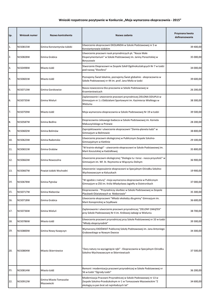 Wnioski rozpatrzone pozytywnie w Konkursie „Moja wymarzona ekopracownia - 2015” Lp. Wniosek numer Nazwa kontrahenta Nazwa zadania Przyznana kwota dofinansowania 1. N150815W Gmina Konstantynów Łódzki Utworzenie ekopracowni EKOLANDIA w Szkole Podstawowej nr 5 w Konstantynowie Łódzkim 39 400,00 2. N150828W Gmina Grabica Utworzenie pracowni nauk przyrodniczych pt. "Nasze Małe Eksperymentarium" w Szkole Podstawowej im. Janiny Porazińskiej w Boryszowie 35 000,00 3. N150498W Miasto Łódź Stworzenie Ekopracowni w Zespole Szkół Ogólnokształcących Nr 7 w Łodzi pod nazwą "Ekosfera" 34 000,00 4. N150601W Miasto Łódź Poznajemy Świat lokalnie, poznajemy Świat globalnie - ekopracownia w Szkole Podstawowej nr 44 im. prof. Jana Molla w Łodzi 39 600,00 5. N150713W Gmina Gorzkowice Nasza nowoczesna Eko-pracownia w Szkole Podstawowej w Krzemieniewicach 26 200,00 6. N150735W Gmina Wieluń Zaplanowanie i utworzenie pracowni przyrodniczej ZIELONA DZIUPLA w Gimnazjum nr 1 z Oddziałami Sportowymi im. Kazimierza Wielkiego w Wieluniu 38 300,00 7. N150759W Miasto Łódź Moja wymarzona ekopracownia w Szkole Podstawowej Nr 19 w Łodzi 39 500,00 8. N150587W Gmina Bedlno Ekopracownia ciekawego badacza w Szkole Podstawowej im. Kornela Makuszyńskiego w Pniewie 28 200,00 9. N150602W Gmina Bolimów Zaprojektowanie i utworzenie ekopracowni "Ziemia-planeta ludzi" w Gimnazjum w Bolimowie 38 800,00 10. N150623W Gmina Radomsko Utworzenie pracowni ekologicznej w Publicznym Zespole SzkolnoGimnazjalnym w Kietlinie 29 100,00 11. N150651W Gmina Grabów "W krainie ekologii" - utworzenie ekopracowni w Szkole Podstawowej im. Marii Koszutskiej w Kadzidłowej 35 800,00 12. N150663W Gmina Nowosolna Utworzenie pracowni ekologicznej "Ekologia tu i teraz - nasza przyszłość" w Gimnazjum im. Wł. St. Reymonta w Wiączyniu Dolnym 36 900,00 13. N150667W Powiat Łódzki Wschodni Utworzenie i wyposażenie ekopracowni w Specjalnym Ośrodku SzkolnoWychowawczym w Koluszkach 19 900,00 14. N150678W Gmina Pątnów "W zgodzie z naturą" -moja wymarzona ekopracownia w Publicznym Gimnazjum w ZSS im. Króla Władysława Jagiełły w Dzietrznikach 37 000,00 15. N150717W Gmina Nieborów Ekopracownia - "Przyrodniczy skarbiec w Szkole Podstawowej w Zespole Placówek Oświatowych w Nieborowie" 35 300,00 16. N150718W Gmina Grabica Utworzenie ekopracowni "Młodzi ekolodzy dla gminy" Gimnazjum im. Marii Konopnickiej w Szydłowie 36 600,00 17. N150736W Gmina Wieluń Zaplanowanie i utworzenie pracowni przyrodniczej "ZIELONY ZAKĄTEK" przy Szkole Podstawowej Nr 4 im. Królowej Jadwigi w Wieluniu 38 700,00 18. N150786W Miasto Łódź Utworzenie pracowni przyrodniczej przy Szkole Podstawowej nr 33 w Łodzi "Młody ekoprzyrodnik" 39 300,00 19. N150800W Gmina Nowy Kawęczyn Wymarzony EKOŚWIAT Publicznej Szkoły Podstawowej im. Jana Antoniego Grabowskiego w Nowym Dworze 34 300,00 20. N150804W Miasto Skierniewice "Dary natury na wyciągnięcie ręki" - Ekopracownia w Specjalnym Ośrodku Szkolno-Wychowawczym w Skierniewicach 37 500,00 21. N150814W Miasto Łódź Remont i modernizacja pracowni przyrodniczej w Szkole Podstawowej nr 56 w Łodzi "Ogrody Łodzi" 36 200,00 22. N150912W Gmina Miasto Tomaszów Mazowiecki Modernizacja Pracowni Przyrodniczej w Szkole Podstawowej nr 13 w Zespole Szkolno-Przedszkolnym nr 1 w Tomaszowie Mazowieckim "Z ekologią za pan brat od najmłodszych lat" 34 600,00 23. N150612W Miasto Łódź Utworzenie pracowni ekologicznej w Szkole Podstawowej nr 58 w Łodzi pod nazwą "Ekozakątek" 37 300,00 24. N150614W Gmina Godzianów "Odkrywam świat Eko z Pasją" - zaplanowanie i utworzenie pracowni przyrodniczej w Zespole Szkół Ogólnokształcących w Godzianowie 33 300,00 25. N150638W Gmina Zduńska Wola Jesteśmy EKO! - utworzenie pracowni przyrodniczej w Gminnym Gimnazjum im. ks. Jana Twardowskiego w Janiszewicach 38 700,00 26. N150648W Gmina Inowłódz Modernizacja pracowni ekologiczno-przyrodniczej w Publicznej Szkole Podstawowej im. Jana Pawła II w Brzustowie 37 000,00 27. N150761W Gmina Galewice Utworzenie ekopracowni "Biosfera" w Gimnazjum im. Jana Pawła II w Galewicach 38 100,00 28. N150765W Gmina Krzyżanów Ekopracownia "...gdy nie będzie lasu, nie będzie nas..." w Szkole Podstawowej im. Ireny Kosmowskiej w Kaszewach Dwornych 36 300,00 29. N150770W Gmina Rzeczyca "Zielony zakątek szkoły"-utworzenie ekopracowni w PSP w Rzeczycy Filia w Sadykierzu 35 300,00 30. N150774W Gmina Łask Moja wymarzona ekopracownia - Zielona przystań licealisty Liceum Ogólnokształcące w ZSO im. I. J. Paderewskiego w Łasku-Kolumnie 37 600,00 31. N150782W Gmina Opoczno Utworzenie pracowni przyrodniczej "Zielono mi. Las blisko Nas" przy Szkole Podstawowej nr 2 w Opocznie 33 800,00 32. N150785W Gmina Godzianów "EKO-ŚWIAT" - moja wymarzona ekopracownia w Szkole Podstawowej w Lniśnie 19 900,00 33. N150810W Miasto Piotrków Trybunalski Utworzenie ekopracowni w Zespole Szkół Ponadgimnazjalnych i Placówek Opiekuńczo-Wychowawczych Nr 3 w Piotrkowie Trybunalskim 30 400,00 34. N150830W Gmina Kiełczygłów Zaplanowanie i utworzenie Ekopracowni w Publicznym Gimnazjum Nr 1 W Kiełczygłowie 38 800,00 35. N150837W Gmina Łęczyca Moja wymarzona ekopracownia "Z ekologią w przyszłość" - Szkoła Podstawowa w Wilczkowicach 39 400,00 36. N150848W Gmina Łęczyca Moja wymarzona ekopracownia - "Poznaje Jaś prawa przyrody, by Jan mógł osiągnąć dobrobyt" w Szkole Podstawowej im. Orła Białego w Siedlcu 37 000,00 37. N150854W Miasto Łódź Utworzenie pracowni przyrodniczej przy Szkole Podstawowej nr 54 w Łodzi "Zielono mi, czyli śladami ekologii" 33 300,00 38. N150869W Gmina Kiełczygłów Zaplanowanie i utworzenie Ekopracowni w Szkole Podstawowej w Kiełczygłowie 38 200,00 39. N150598W Gmina Sadkowice "Odkrywamy tajemnice przyrody" - utworzenie ekopracowni w Szkole Podstawowej im. Marszałka Józefa Piłsudskiego w Zespole Szkół w Lubani 35 300,00 40. N150603W Gmina Bolimów Zaprojektowanie i utworzenie ekopracowni "Bliżej 