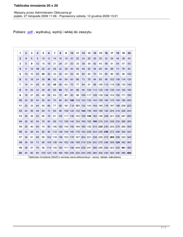 Tabliczka mnożenia 20 x 20 Wpisany przez Administrator Obliczenia.pl piątek, 27 listopada 2009 11:06 - Poprawiony sobota, 12 grudnia 2009 13:21 Pobierz pdf , wydrukuj, wytnij i wklej do zeszytu. 1/1