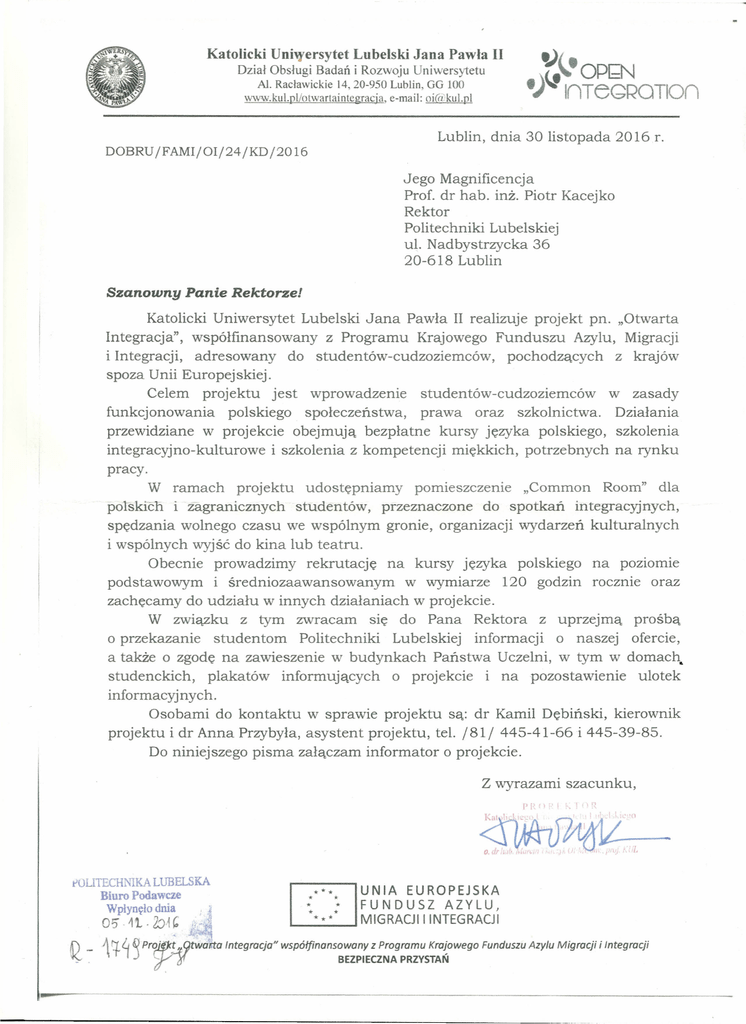 Katolicki Uniwersytet Lubelski Jana Pawła II ~~'OP[;N Dział Obsługi Badań i Rozwoju Uniwersytetu .)<J InTeGROTIOn Al. Racławickie 14,20-950 Lublin, GG 100 www.kul.pl/otwartaintegracja. e-mail: Oi<fl:kul.pl Lublin, dnia 30 listopada 2016 r. DOBRU/FAMI/OI/24/KD/2016 Jego Magnificencja Prof. dr hab. inż. Piotr Kacejko Rektor Politechniki Lubelskiej ul. Nadbystrzycka 36 20-618 Lublin Szanowny Panie Rektorze! Katolicki Uniwersytet Lubelski Jana Pawła II realizuje projekt pn. "Otwarta Integracja", współfinansowany z Programu Krajowego Funduszu Azylu, Migracji i Integracji, adresowany do studentów-cudzoziemców, pochodzących z krajów spoza Unii Europejskiej. Celem projektu jest wprowadzenie studentów-cudzoziemców w zasady funkcjonowania polskiego społeczeństwa, prawa oraz szkolnictwa. Działania przewidziane w projekcie obejmują bezpłatne kursy języka polskiego, szkolenia integracyjno-kulturowe i szkolenia z kompetencji miękkich, potrzebnych na rynku pracy. W ramach projektu udostępniamy pomieszczenie "Common Room" dla polskich i zagranicznych studentów, przeznaczone do spotkań integracyjnych, spędzania wolnego czasu we wspólnym gronie, organizacji wydarzeń kulturalnych i wspólnych wyjść do kina lub teatru. Obecnie prowadzimy rekrutację na kursy języka polskiego na pozrorrne podstawowym i średniozaawansowanym w wymiarze 120 godzin rocznie oraz zachęcamy do udziału w innych działaniach w projekcie. W związku z tym zwracam się do Pana Rektora z uprzejmą prośbą o przekazanie studentom Politechniki Lubelskiej informacji o naszej ofercie, a także o zgodę na zawieszenie w budynkach Państwa Uczelni, w tym w domach •. studenckich, plakatów informujących o projekcie i na pozostawienie ulotek informacyj nych. Osobami do kontaktu w sprawie projektu są: dr Kamil Debiński, kierownik projektu i dr Anna Przybyła, asystent projektu, tel. /81/ 445-41-66 i 445-39-85. Do niniejszego pisma załączam informator o projekcie. Z wyrazami szacunku, Hl L tlOLITECHl\'1KA LUBELSKA Biuro Podawcze Wpłynęło dnia 05 ·11-· hi' .,..ot 1t~Q prcp!p!.ll:.va'6t:a • A) _ ~ . - J r O' . . ••.• IUNIA EUROPEJSKA •• •. FUNDUSZ AZYLU, MIGRACJI I INTEGRACJI *:.:..:.* J~ Integracja" współfinansowany z Programu KrQ~owego Funduszu Azylu Migracji i Integracji BEZPIECZNA PRZYSTAN