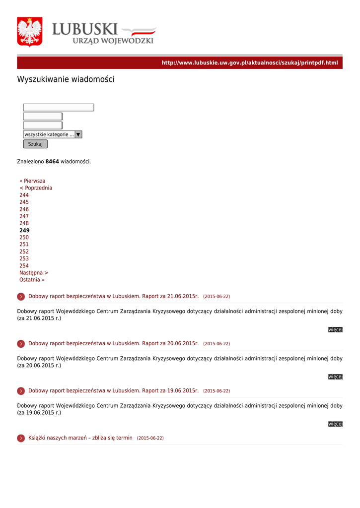 http://www.lubuskie.uw.gov.pl/aktualnosci/szukaj/printpdf.html Wyszukiwanie wiadomości wszystkie kategorie ... ▼ Szukaj Znaleziono 8464 wiadomości. « Pierwsza < Poprzednia 244 245 246 247 248 249 250 251 252 253 254 Następna > Ostatnia » Dobowy raport bezpieczeństwa w Lubuskiem. Raport za 21.06.2015r. (2015-06-22) Dobowy raport Wojewódzkiego Centrum Zarządzania Kryzysowego dotyczący działalności administracji zespolonej minionej doby (za 21.06.2015 r.) więcej Dobowy raport bezpieczeństwa w Lubuskiem. Raport za 20.06.2015r. (2015-06-22) Dobowy raport Wojewódzkiego Centrum Zarządzania Kryzysowego dotyczący działalności administracji zespolonej minionej doby (za 20.06.2015 r.) więcej Dobowy raport bezpieczeństwa w Lubuskiem. Raport za 19.06.2015r. (2015-06-22) Dobowy raport Wojewódzkiego Centrum Zarządzania Kryzysowego dotyczący działalności administracji zespolonej minionej doby (za 19.06.2015 r.) więcej Książki naszych marzeń – zbliża się termin (2015-06-22) Jeszcze do 24 czerwca dyrektorzy szkół mogą złożyć wniosek do organu prowadzącego w sprawie nowego programu „Książki naszych marzeń”. więcej Zaświeć się na niebiesko (2015-06-22) To hasło happeningu, który 24 czerwca 2015 r. organizuje Specjalny Ośrodek Szkolno-Wychowawczy w Lubsku, aby promować wiedzę na temat autyzmu. więcej Święto Czekolady w Kargowej (2015-06-22) W Kargowej odbyło się V Święto Czekolady. Wojewoda Katarzyna Osos skierowała życzenia do mieszkańców i gości. więcej Uczniowie i absolwenci świętowali jubileusze (2015-06-22) W sobotę 70-lecie świętowali Zespół Szkół Ponadgimnazjalnych w Krośnie Odrzańskim i Zespół Szkół w Otyniu. Wojewoda Katarzyna Osos skierowała do kadry i uczniów życzenia. więcej Instytut im. Papuszy – nowe miejsce na mapie województwa (2015-06-19) Powołanie Instytutu im. Papuszy zapowiedzieli podczas wspólnej konferencji prasowej Minister Administracji i Cyfryzacji Andrzej Halicki i Wojewoda Lubuski Katarzyna Osos. Nowe przedsięwzięcie ma służyć popularyzacji dorobku kultury romskiej i innych mniejszości narodowych. więcej Co i jak załatwić w urzędzie, czyli gra miejska (2015-06-19) Uczniowie szkół gimnazjalnych i ponadgimnazjalnych oraz studentki politologii 19 czerwca 2015 r. wzięli udział w grze miejskiej „Lato z administracją”. więcej Żandarmeria Wojskowa w Żaganiu ma 25 lat (2015-06-19) W piątek, 19 czerwca 2015 r. medale państwowe i resortowe odebrali najbardziej zasłużeni żołnierze ŻW z Żagania. Okazją był jubileusz 25-lecia funkcjonowania. więcej « Pierwsza < Poprzednia 244 245 246 247 248 249 250 251 252 253 254 Następna > Ostatnia »