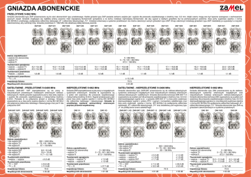 GniazdA abonenckie przelotowe 5÷862 mHz Gniazda abonenckie typu ZAP przeznaczone są do sieci abonenckich typu przelotowego. Każde gniazdo typu ZAP posiada zarówno wejście jak i wyjście dla przewodu współosiowego o średnicy max. 8,3 mm, dzięki czemu mogą one być łączone szeregowo z zachowaniem pewnych zasad. Gniazdo znajdujące się najbliżej anteny powinno mieć największą tłumienność sprzężenia a na końcu instalacji najmniejszą tłumienność, tak aby sygnał w każdym gnieździe był na porównywalnym poziomie. Dwa porty wyjściowe zgodne z normą IEC 60169-2 umożliwiają podłączenie odbiornika radiowego „R” i odbiornika telewizyjnego „TV”. Instalacji antenowej w systemie przelotowym nie można zakończyć samym gniazdem typu ZAP. Chcąc zakończyć instalację gniazdem typu ZAP należałoby je wyposażyć w rezystor zakończeniowy aby zamknąć linię. Gniazda przelotowe 5 ÷ 862 Mhz dla składowej stałej stanowią zwarcie. ZAP 9/k ZAP 10/1 Zakres częstotliwości: • wejście linii abonenckiej • wyjście TV • wyjście R Tłumienność sprzężenia: • wejście → wyjście TV 8,2 ÷ 9,4 dB • wejście → wyjście R 8,5 ÷ 9,2 dB Tłumienność przelotowa: • wejście → wyjście 1,8 dB Tłumienność przenikowa: • TV ↔ R Impedancja falowa: Współczynnik ekranowania: ZAP 10/O Zakres częstotliwości: • dla wyjścia SAT • dla wyjścia TV • dla wyjścia R Tłumienność sprzężenia: • dla wyjścia SAT • dla wyjścia TV • dla wyjścia R Tłumienność przelotowa • wejście → wyjście Tłumienność przenikowa: • TV ↔ SAT • TV ↔ R Impedancja falowa: Współczynnik ekranowania: ZAP 14/O ZAP 15/K ZAp 16/1 ZAp 16/O ZAp 18/1 ZAp 18/O ZAp 20/1 ZAp 20/O ZAp 23/1 ZAp 23/O 10,2 ÷ 11,5 dB 11,3 ÷ 11,6 dB 12,4÷13,2 dB 12,6÷13,2 dB 13,1 ÷ 14,8 dB 14,3 ÷ 15,0 dB 15,1 ÷ 15,8 dB 15,3 ÷ 15,8 dB 16,1 ÷ 17,8 dB 17,3 ÷ 17,8 dB 17,1 ÷ 18,8 dB 18,4 ÷ 18,8 dB 18,3 ÷ 19,8 dB 19,2 ÷ 19,3 dB 22,3 ÷ 22,8 dB 22,2 ÷ 23,3 dB 1,6 dB 1,5 dB 1,5 dB 1,1 dB 1,1 dB 1,1 dB 1,1 dB 1,1 dB ≥ 13,3 dB 75 Ω ≥ 83 dB Gniazda ZAR-SAT 10/P zaprojektowane są do pracy w indywidualnych przelotowych instalacjach antenowych radiowotelewizyjnych. Każde gniazdo wyposażone jest w dwa sloty wejścia i wyjścia dla przewodu współosiowego o maksymalnej średnicy 8,3mm. Pozwala to na połączenie gniazd w szeregu. Gniazda wyposażone są w dwa porty wyjścia zgodne z normą IEC 60169-2 dla połączenia odbiornika radiowego i telewizyjnego oraz port F dla połączenia SAT. ZAr-SAT 10/p2 ZAp 14/1 5 ÷ 862 MHz 5 ÷ 70, 120 ÷ 862 MHz 87,5 ÷ 108 MHz SAtelitarne - przelotowe 5÷2400 Mhz ZAr-SAT 10/p1 ZAp 12/k ZAr-SAT 10/p3 ZAr-SAT 10/p4 NIEprzelotowe 5÷862 mHz Gniazda ZAR zaprojektowane są do pracy w rozgałęźnych systemach antenowych. Gniazda te wyposażone są w jeden slot wejściowy dla przewodu współosiowego maksymalnej średnicy 8,3mm. Sygnał przekazywany jest przez dwa porty wyjścia zgodne z normą IEC 60169-2 dla odbiornika radiowego i telewizyjnego. Gniazda te umożliwiają zasilanie wzmacniaczy antenowych poprzez przewód współosiowy. ZAr 1/1 ZAr 1/k ZAr 1/O 950 ÷ 2400 MHz 5 ÷ 70, 118 ÷ 862 MHz 87 ÷ 108 MHz 6,6 ÷ 9,3 dB 10,4 ÷ 16 dB 11,7 ÷ 12,1 dB ≤ 8,5 dB ≥ 24,6 dB ≥ 11,9 dB 75 Ω ≥ 95 dB Zakres częstotliwości: • wejście linii abonenckiej • wyjście TV • wyjście R Tłumienność sprzężenia: • wejście → wyjście TV • wejście → wyjście R Tłumienność przenikowa: • TV ↔ R Impedancja falowa: Współczynnik ekranowania: 5 ÷ 862 MHz 5 ÷ 70, 120 ÷ 862 MHz 87,5 ÷ 108 MHz ≤ 1,9 dB ≤ 1,8 dB ≥ 27,7 dB 75 Ω ≥ 81 dB SAtelitarne - NIEprzelotowe 5÷2400 Mhz Gniazda abonenckie typu ZAR-SAT przeznaczone są do radiowo-telewizyjnych systemów antenowych rozgałęźnych oraz indywidualnych instalacji antenowych radiowo-telewizyjnych i satelitarnych. Gniazda abonenckie końcowe ZAR-SAT 1.X wyposażone są w jeden port dla przewodu współosiowego o średnicy max. 8,3 mm doprowadzającego sygnał w.cz., a gniazdo ZAR-SAT 2.1 w dwa porty wejściowe doprowadzające sygnał z anteny RTV i sygnał z konwertera satelitarnego oraz dwa porty wyjściowe zgodne z normą IEC 60169-2 do podłączenia odbiornika radiowego „R” i odbiornika telewizyjnego „TV” oraz dodatkowy port wyjściowy typu „F” do podłączenia tunera satelitarnego. ZAr-SAT 1.1/O ZAr-SAT 1.2/O Zakres częstotliwości: • dla wyjścia SAT • dla wyjścia TV • dla wyjścia R Tłumienność sprzężenia: • wejście → wyjście TV • wejście → wyjście R • wejście → wyjście SAT Tłumienność przenikowa: • TV ↔ SAT • TV ↔ R Impedancja falowa: Współczynnik ekranowania: ZAr-SAT 1.3 ZAr-SAT 1.4/k ZAr-SAT 2.1/PX 950 ÷ 2400 MHz 5 ÷ 70, 120 ÷ 862 MHz 88 ÷ 108 MHz ≤ 2,5 dB ≤ 1,9 dB ≤ 1,7 dB ≤ 1,2 dB ≤ 1,8 dB ≤ 1,7 dB ≥ 11,2 dB ≥ 32,3 dB ≥ 26,8 dB ≥ 8,5 dB 75 Ω ≥ 81 dB ≥ 95 dB NIEprzelotowe 5÷862 mHz Gniazda abonenckie typu ZAK przeznaczone są do radiowotelewizyjnych systemów antenowych rozgałęźnych oraz indywidualnych instalacji antenowych radiowo-telewizyjnych. Gniazda abonenckie-końcowe ZAK wyposażone są w jeden port wejściowy dla przewodu współosiowego o średnicy max. 8,3 mm doprowadzającego sygnał w.cz. oraz dwa porty wyjściowe zgodne z normą IEC 60169-2 do podłączenia odbiornika radiowego „R” i odbiornika telewizyjnego „TV”. Gniazda abonenckie typu ZAK są gniazdami zakończeniowymi w systemie przelotowym. ZAK 10/1 ZAK 10/O ZAK 6/K Zakres częstotliwości: • wejście linii abonenckiej 5 ÷ 862 MHz • wyjście TV 5 ÷ 70, 120 ÷ 862 MHz • wyjście R 87,5 ÷ 108 MHz Tłumienność sprzężenia: • wejście → wyjście TV 10,3 ÷ 11,9 dB 6,3 ÷ 6,8 dB • wejście → wyjście R 11,4 ÷ 11,8 dB 6,7 ÷ 7,2 dB Tłumienność przenikowa: • TV ↔ R ≥ 10,7 dB Impedancja falowa: 75 Ω Współczynnik ekranowania: ≥ 83 dB