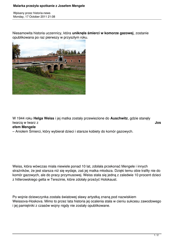 Malarka przeżyła spotkanie z Josefem Mengele Wpisany przez historia-news Monday, 17 October 2011 21:08 Niesamowita historia uczennicy, która uniknęła śmierci w komorze gazowej, zostanie opublikowana po raz pierwszy w przyszłym roku. W 1944 roku Helga Weiss i jej matka zostały przewiezione do Auschwitz, gdzie stanęły twarzą w twarz z efem Mengele – Aniołem Śmierci, który wybierał dzieci i starsze kobiety do komór gazowych. Jos Weiss, która wówczas miała niewiele ponad 10 lat, zdołała przekonać Mengele i innych strażników, że jest starsza niż się wydaje, zaś jej matka młodsza. Dzięki temu obie trafiły nie do komór gazowych, ale do pracy przymusowej. Weiss stała się jedną z zaledwie 10 procent dzieci z hitlerowskiego getta w Terezinie, które zdołały przeżyć Holokaust. Po wojnie dziewczynka została światowej sławy artystką znaną pod nazwiskiem Weissova-Hoskova. Mimo to przez lata historia jej ocalenia stała w cieniu sukcesu zawodowego i jej pamiętniki z czasów wojny nigdy nie zostały opublikowane. 1/2 Malarka przeżyła spotkanie z Josefem Mengele Wpisany przez historia-news Monday, 17 October 2011 21:08 Sytuacja zmieniła się w roku ubiegłym, gdy Venetia Butterfield z wydawnictwa Viking, które opublikowało także dzienniki Anny Frank, usłyszała o tej historii i spotkała się z Helgą Weiss najpierw w Londynie a potem w Pradze, gdzie obecnie mieszka malarka. Helga została poproszona o próbkę pisma z jednego z jej zeszytów, aby można było ją wysłać do analizy. Podsumowania przeszłości są zwykle kształtowane przez znajomość tego, co później się wydarzyło. W dzienniku najważniejsze jest to, że dla Helgi była to rzeczywistość. Dzięki temu znacznie różni się od wspomnień. - opisała swoje wrażenia z lektury przedstawicielka wydawnictwa. Viking opublikuje dzienniki Helgi Weiss w czerwcu przyszłego roku. Czytaj artykuł źródłowy 2/2