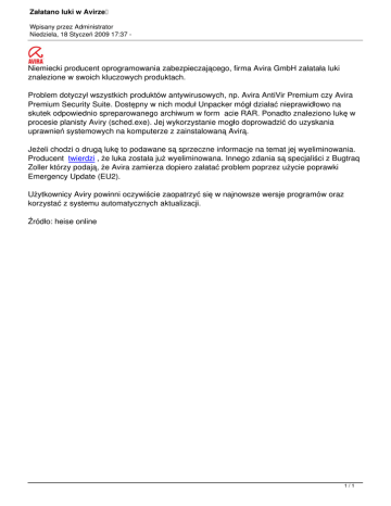 Załatano luki w Avirze Wpisany przez Administrator Niedziela, 18 Styczeń 2009 17:37 - Niemiecki producent oprogramowania zabezpieczającego, firma Avira GmbH załatała luki znalezione w swoich kluczowych produktach. Problem dotyczył wszystkich produktów antywirusowych, np. Avira AntiVir Premium czy Avira Premium Security Suite. Dostępny w nich moduł Unpacker mógł działać nieprawidłowo na skutek odpowiednio spreparowanego archiwum w form acie RAR. Ponadto znaleziono lukę w procesie planisty Aviry (sched.exe). Jej wykorzystanie mogło doprowadzić do uzyskania uprawnień systemowych na komputerze z zainstalowaną Avirą. Jeżeli chodzi o drugą lukę to podawane są sprzeczne informacje na temat jej wyeliminowania. Producent twierdzi , że luka została już wyeliminowana. Innego zdania są specjaliści z Bugtraq Zoller którzy podają, że Avira zamierza dopiero załatać problem poprzez użycie poprawki Emergency Update (EU2). Użytkownicy Aviry powinni oczywiście zaopatrzyć się w najnowsze wersje programów oraz korzystać z systemu automatycznych aktualizacji. Źródło: heise online 1/1