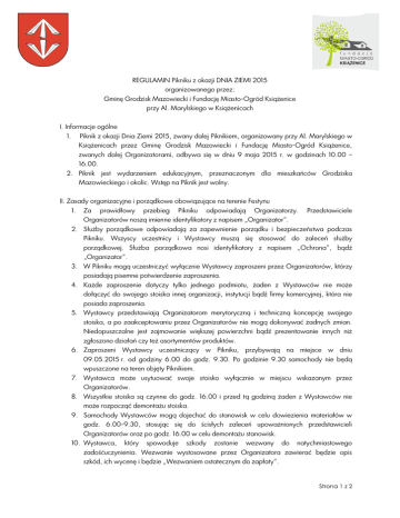 REGULAMIN Pikniku z okazji DNIA ZIEMI 2015 organizowanego przez: Gminę Grodzisk Mazowiecki i Fundację Miasto-Ogród Książenice przy Al. Marylskiego w Książenicach I. Informacje ogólne 1. Piknik z okazji Dnia Ziemi 2015, zwany dalej Piknikiem, organizowany przy Al. Marylskiego w Książenicach przez Gminę Grodzisk Mazowiecki i Fundację Miasto-Ogród Książenice, zwanych dalej Organizatorami, odbywa się w dniu 9 maja 2015 r. w godzinach 10.00 – 16.00. 2. Piknik jest wydarzeniem edukacyjnym, przeznaczonym dla mieszkańców Grodziska Mazowieckiego i okolic. Wstęp na Piknik jest wolny. II. Zasady organizacyjne i porządkowe obowiązujące na terenie Festynu 1. Za prawidłowy przebieg Pikniku odpowiadają Organizatorzy. Przedstawiciele Organizatorów noszą imienne identyfikatory z napisem „Organizator”. 2. Służby porządkowe odpowiadają za zapewnienie porządku i bezpieczeństwa podczas Pikniku. Wszyscy uczestnicy i Wystawcy muszą się stosować do zaleceń służby porządkowej. Służba porządkowa nosi identyfikatory z napisem „Ochrona”, bądź „Organizator”. 3. W Pikniku mogą uczestniczyć wyłącznie Wystawcy zaproszeni przez Organizatorów, którzy posiadają pisemne potwierdzenie zaproszenia. 4. Każde zaproszenie dotyczy tylko jednego podmiotu, żaden z Wystawców nie może dołączyć do swojego stoiska innej organizacji, instytucji bądź firmy komercyjnej, która nie posiada zaproszenia. 5. Wystawcy przedstawiają Organizatorom merytoryczną i techniczną koncepcję swojego stoiska, a po zaakceptowaniu przez Organizatorów nie mogą dokonywać żadnych zmian. Niedopuszczalne jest zajmowanie większej powierzchni bądź prezentowanie innych niż zgłoszono działań czy też asortymentów produktów. 6. Zaproszeni Wystawcy uczestniczący w Pikniku, przybywają na miejsce w dniu 09.05.2015 r. od godziny 6.00 do godz. 9.30. Po godzinie 9.30 samochody nie będą wpuszczone na teren objęty Piknikiem. 7. Wystawca może usytuować swoje stoisko wyłącznie w miejscu wskazanym przez Organizatorów. 8. Wszystkie stoiska są czynne do godz. 16.00 i przed tą godziną żaden z Wystawców nie może rozpocząć demontażu stoiska. 9. Samochody Wystawców mogą dojechać do stanowisk w celu dowiezienia materiałów w godz. 6.00-9.30, stosując się do ścisłych zaleceń upoważnionych przedstawicieli Organizatorów oraz po godz. 16.00 w celu demontażu stanowisk. 10. Wystawca, który spowoduje szkody zostanie wezwany do natychmiastowego zadośćuczynienia. Wezwanie wystosowane przez Organizatora zawierać będzie opis szkód, ich wycenę i będzie „Wezwaniem ostatecznym do zapłaty”. Strona 1 z 2 11. Parkowanie samochodów dozwolone jest tylko na wyznaczonych parkingach. W żadnym przypadku nie dopuszczalne jest parkowanie na miejscach do tego niewyznaczonych. 12. Na terenie Pikniku obowiązują przepisy wydane przez zarządcę terenu – Zarząd Oczyszczania Miasta. III. Wprowadza się zakaz: 1. Wnoszenia na niebezpiecznych teren Pikniku przedmiotów broni, i materiałów narzędzi, wybuchowych wyrobów i łatwopalnych, pirotechnicznych, środków odurzających, środków trujących i promieniotwórczych, substancji psychotropowych. 2. Niszczenia tablic informacyjnych, koszy na śmieci i wszelkich obiektów małej architektury. 3. Łamania, wyrywania, wykopywania i niszczenia zieleni. 4. Palenia ognisk na terenie. 5. Wrzucania jakichkolwiek przedmiotów do stawów. 6. Sprzedaży alkoholu na Pikniku. 7. Wnoszenia alkoholu na Piknik. 8. Spożywania alkoholu na terenie Pikniku. 9. Wprowadzania psów. 10. Prowadzenia działalności handlowej bez zgody Organizatora. Warunkiem zapewnienia porządku i bezpieczeństwa wszystkich uczestników Pikniku i Wystawców jest respektowanie postanowień zawartych w niniejszym regulaminie, wykonywanie poleceń porządkowych służb odpowiedzialnych za utrzymanie porządku, przestrzeganie przepisów prawa karnego i prawa wykroczeń. Osoby nie stosujące się do powyższych zaleceń będą usuwane poza teren Pikniku. UDZIAŁ WYSTAWCÓW W PIKNIKU JEST NIEODPŁATNY. WYSTAWCY MOGĄ UZNANIOWO WPŁACIĆ DOWOLNĄ KWOTĘ NA KONTO FUNDACJI. DOCHÓD UZYSKANY W TEN SPOSÓB PRZEZNACZONY ZOSTANIE NA ZAKUP ROŚLIN, KTÓRE POSADZIMY WOKÓŁ SIEDZIBY FUNDACJI W KSIĄŻENICACH. Wpłata taka powinna zostać opisana w następujący sposób: darowizna na cele statutowe Fundacji-realizacja projektu „Zielono Nam”. Konto Fundacji nr 47 9678 0002 0013 4183 2000 0001 Strona 2 z 2