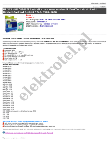 Informacje o produkcie Utworzono 04-03-2017 HP 343 - HP C8766EE kartridż - tusz kolor zamiennik DrukTech do drukarki Hewlett-Packard DeskJet 5740, 5940, 6620 Cena : 55,00 zł zamiennik Tusz HP 343 HP C8766EE tusz hp343 HP C8766 HP C8766E l.p l Nr katalogowy : tusz do drukarek HP 8765 Producent : DRUKTECH Stan magazynowy : bardzo wysoki Średnia ocena : brak recenzji Charakterystyka: Pojemność 9 ml Wymiary 141 x 113 x 37 mm Ilość w opakowaniu - 1 szt Wydajność 260 stron A4 przy 15% pokryciu Wydajność 90 zdjęć 10 x 15 cm Waga netto 40,3 g Ilość w opakowaniu - 1 szt el ek tr o Ten produkt jest kompatybilny z następującymi urządzeniami: Hewlett Packard (HP) DeskJet 5740 DeskJet 5940 DeskJet 6520 DeskJet 6540 DeskJet 6543 DeskJet 6620 DeskJet 6840 DeskJet 6940 DeskJet 6980 DeskJet 9800 OfficeJet 6210 OfficeJet 7210 OfficeJet 7310 OfficeJet 7410 PhotoSmart 325 PhotoSmart 335 PhotoSmart 375 PhotoSmart 385 PhotoSmart 428 PhotoSmart 475 PhotoSmart 2610 PhotoSmart 2710 PhotoSmart 8150 PhotoSmart 8450 PhotoSmart 8750 PSC 1510 (większa pojemność od startowego 342) PSC 1610 PSC 2355 PSC 2610 PSC 2710 te Trójkolorowy kartridż atramentowy refabrykowany zamiennik DrukTech nr. HP 343, kod C8766EE, został opracowany z myślą o użytkownikach domowych i entuzjastach fotografii cyfrowej oczekujących wysokiej jakości i bezproblemowej pracy i drukujących praktycznie wszystko, począwszy od projektów szkolnych i zawodowych po kolorowe zdjęcia. Wszystkie produkty objęte są następującą gwarancją jakości: Ilość stron wydruku, zgodna z ilością wymienioną w ofercie Jakość wydruku co najmniej taka jak oryginalnych kartridży Bezpieczeństwo użytkowania drukarki przy zastosowaniu kartridży DrukTech * Dane te są danymi przybliżonymi i opierają się na liczbie arkuszy wydrukowanych w ramach ciągłego druku. Przy korzystaniu okresowym, podna liczba stron może być mniejsza. Informacje o wydajności kartridży do drukarek Hewlett-Packard Wygenerowano w programie www.oscGold.com ek el l.p l te tr o
