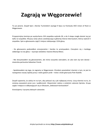 Zagrają w Węgorzewie! To już pewne. Zespół Spin z Borów Tucholskich wystąpi 9 lipca na Festiwalu EKO Union of Rock w Węgorzewie. Przypomnijmy komisja po wysłuchaniu 333 zespołów wybrała 30, a do II etapu mogło dostad się już tylko 12 zespołów. Muzycy swój sukces zawdzięczają w głównej mierze internautom, którzy wybrali 5 zespołów. Spin w głosowaniu zajął 2 miejsce zdobywając 1554 głosy. - Do głosowania podszedłem emocjonalnie i bardzo to przeżywałem. Cieszyłem się z każdego oddanego na nas głosu – wyznaje wokalista i basista Maciej Mews. - Nie ekscytowałem się głosowaniem, ale mimo wszystko wierzyłem, że uda nam się tam dostad stwierdza perkusista Sebastian Fierek. - Spodziewałem się tego, że zagramy w Węgorzewie. Chciałem powiedzied również o tym, że jest to następstwo naszej ciężkiej pracy i wielu godzin prób – mówi z kolei gitarzysta Piotr Budnik. Zespół zapewnia, że zależy im na tym, aby pokazad się z jak najlepszej strony. Liczą również na to, że zostaną zauważeni przez jury i publicznośd. Wspomnied należy o ostatnim sukcesie Spinów. Grupa zajęła I miejsce w odbywających się w Olsztynie „Debiutach Kortowskich”. Gratulujemy i życzymy dalszych sukcesów. Artykuł pochodzi ze strony http://www.wizjalokalna.pl Zespół Spin podczas próby, w składzie: gitarzysta-Piotr Budnik, wokalista i basista-Maciej Mews, perkusista-Sebastian Fierek (na zdjęciach zabrakło gitarzysty Piotra Borowca). Artykuł pochodzi ze strony http://www.wizjalokalna.pl Artykuł pochodzi ze strony http://www.wizjalokalna.pl