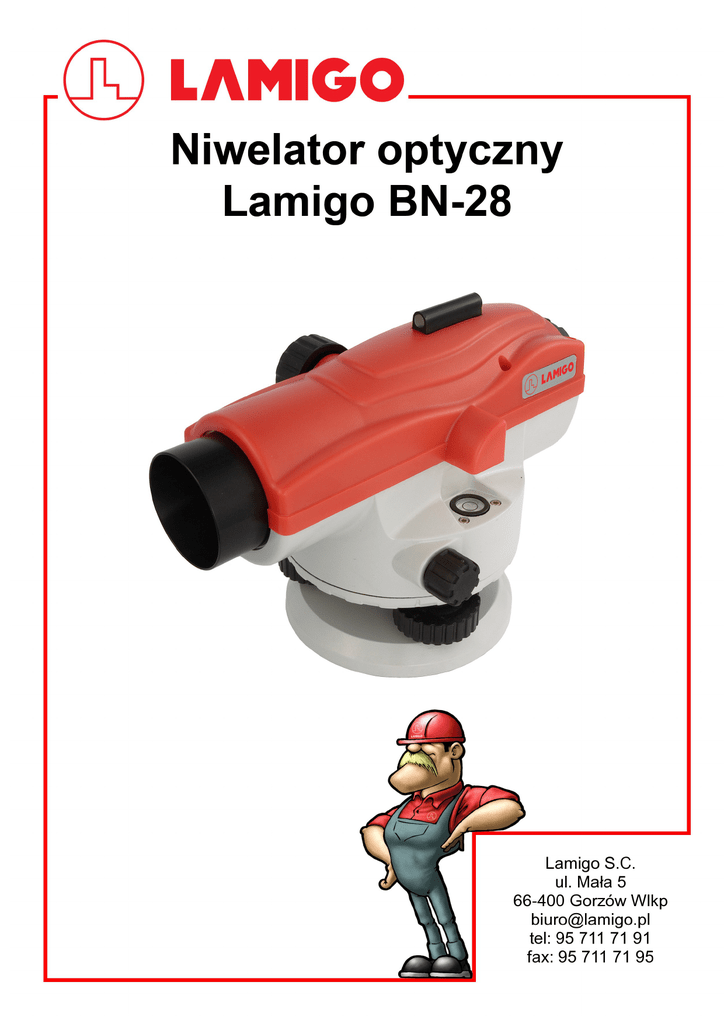 OPIS NIWELATORA tora 1. Lusterko libelli 2. Libella pudełkowa 3. Śruba ustawcza libelli pudełkowej 4. Śruba mikroruchu 5. Śruba ustawcza spodarki 6. Płyta spodarki 7. Kolimator 8. Obiektyw 9. 10. 11. 12. 13. 2 Pokrętło ustawiania ostrości Okienko kątomierza Kątomierz Okular Pierścień okularu PRZYGOTOWANIE DO PRACY Aby rozpocząć pracę, należy: Ustawić statyw na ziemi i zacisnąć klamry / lub śruby zaciskowe. Wbić nogi statywu w ziemię i spoziomować wstępnie głowicę statywu Umieścić niwelator na głowicy statywu i przykręcić za pomocą śruby mocującej. Spoziomować niwelator przy pomocy libelli pudełkowej i śrub ustawczych spodarki. Celowanie i nastawianie ostrości Spojrzeć przez okular lunety i wycelować niwelator na łatę. Przy pomocy pierścienia wyregulować ostrość krzyża nitek. Za pomocą pokrętła 9 ustawić ostrość obrazu w niwelatorze. Przy pomocy pokrętła (4) ustawić centralnie wzdłuż pionowej nitki obraz łaty w lunecie. METODY POMIARU Pomiar wysokości Ustawić instrument pomiędzy punktami A i B. Ustawić pionowo łatę na punkcie A. Wartość odczytu z łaty oznaczyć jako „a”. Ustawić pionowo łatę na punkcie B. Wartość odczytu z łaty oznaczyć jako „b”. Odczyt wysokości pomiędzy punktami A i B wynosi a-b h = a-b = 1.735-1.224 = 0.511m 3 Pomiar odległości Wycelować na łatę, odczytać różnicę wysokości w cm pomiędzy górną i dolną kreską dalmierczą. Odległość pomiędzy instrumentem a łatą obliczyć jako iloczyn różnicy odczytów górnej i dolnej kreski w metrach x 100 Odczyt: Górna linia dalmiercza: 3.238m Dolna linia dalmiercza: 3.091m ------------------------------------------Różnica L: 0.147m Odległość d=100xL: 14.7m 4 Pomiar kąta Wycelować pionowa nitkę krzyża nitek na punkt A. Z pierścienia z podziałem gradowym odczytać kierunek Obrócić instrument i wycelować na punkt B. Odczytać drugi kierunek Obliczyć wartość kąta jako różnicę kierunków na punkty A i B ∡A0B = α-β SPRAWDZANIE I REKTYFIKACJA INSTRUMENTU Sprawdzanie libelli pudełkowej 1. Przy pomocy śrub poziomujących (5) ustawić instrument tak aby bańka powietrzna znalazła się w centrum libelli pudełkowej. 2. Obrócić instrument o 180º. Bańka powietrzna powinna pozostać w centrum libelli. W przeciwnym wypadku należy wyjustować libellę zgodnie z przedstawionym sposobem postępowania: 1. Przy pomocy śrub poziomujących (5) ostawić bańkę powietrzna w połowie drogi do centrum libelli . 2. Używając klucza imbusowego ustawić śruby libelli tak aby bańka powietrzna znalazła się w jej centrum. 3. Powtarzać czynności (I) i (II) aż do momentu w którym bańka będzie pozostawała w centrum libelli pomimo obracania instrumentu w dowolną stronę. Sprawdzenie równoległości osi celowej 1.Ustawić instrument w połowie odległości pomiędzy punktami A i B. Łaty A i B powinny być oddalone od siebie o około 30m~40m. 5 Wykonane odczyty należy oznaczyć jako a1 i b1 2. Przenieść instrument na odległość 2m od punktu A i wykonać odczyty a2 i b2 (rys. 13) 3. Obliczyć równanie b’2=a2-(a1-b1). Jeżeli |b’2-b2| < 3mm wówczas oś celowa nie wymaga korekty. 4. Jeżeli |b’2-b2| > 3mm wówczas ustawienie osi celowej należy skorygować. 5. Wycelować instrument na łatę B. Odkręcić pokrywkę okularu. Przy pomocy śrub krzyża nitek wyregulować go tak, aby środkowa nitka dawała poprawny odczyt b’2. 6. Powtarzać czynność a2 |b’2-b2| < 3mm. 6 CZYSZCZENIE I KONSERWACJA Aby chronić wszystkie części i zapobiec utracie dokładności należy przestrzegać następujących zasad: 1. Po zakończeniu pomiarów instrument powinien zostać wyczyszczony i umieszczony w oryginalnym opakowaniu. 2. Do czyszczenia soczewek należy używać miękkiego pędzelka lub papieru do czyszczenia soczewek. Nie dotykać soczewek palcami. 3. Jeżeli instrument jest niesprawny lub uszkodzony musi zostać oddany do autoryzowanego serwisu w celu sprawdzenia i naprawy. 4. Instrument powinien być przechowywany w suchym, wentylowanym pomieszczeniu. 5. Nie należy zamykać w pojemniku zawilgoconego niwelatora. 6. Po pracy na deszczu niwelator należy wytrzeć suchą szmatką i pozostawić do wyschnięcia w otwartym pojemniku. DANE TECHNICZNE Powiększenie lunety Średnica obiektywu Pole widzenia Najkrótsza celowa Stała mnożenia Stała dodawania Zakres pracy kompensatora Dokładność kompensatora Przewaga libelli Podział koła poziomego Bład średni na kilometr podwójnej niwelacji Masa instrumentu Mocowanie 7 28x 40mm 1°20’ 0,6m 100 0 ±15’ 0.5” 8’/2mm 1 gon 1,5mm 2 kg 5/8” WAŻNE INFORMACJE DLA UŻYTKOWNIKA Producent i Serwis Fabryczny LAMIGO S.C. Jacek Mickowski i Rafał Mickowski ul. Mała 5 66-400 Gorzów Wlkp [email protected] www.lamigo.pl tel: 957117191 do 94 fax:957117195 SPIS TREŚCI Opis niwelatora................................................................................... 2 Przygotowanie do pracy..................................................................... 3 Celowanie i nastawianie ostrości....................................................... 3 Pomiar wysokości............................................................................... 3 Pomiar odległości............................................................................... 4 Pomiar kąta........................................................................................ 5 Sprawdzenie i rektyfikacja.................................................................. 5 Sprawdzenie libelli pudełkowej........................................................... 5 Sprawdzenie równoległości osi celowej............................................. 5 Czyszczenie i konserwacja................................................................. 7 Dane techniczne................................................................................ 7 Ważne informacje.............................................