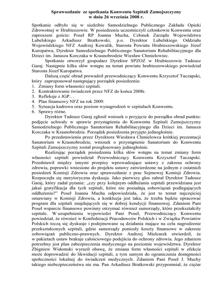 Sprawozdanie ze spotkania Konwentu Szpitali Zamojszczyzny w dniu 26 września 2008 r. Spotkanie odbyło się w siedzibie Samodzielnego Publicznego Zakładu Opieki Zdrowotnej w Hrubieszowie. W posiedzeniu uczestniczyli członkowie Konwentu oraz zaproszeni goście: Poseł RP Joanna Mucha, Członek Zarządu Województwa Lubelskiego Arkadiusz Bratkowski, p.o. Dyrektor Lubelskiego Oddziału Wojewódzkiego NFZ Andrzej Kowalik, Starosta Powiatu Hrubieszowskiego Józef Kuropatwa, Dyrektor Samodzielnego Publicznego Sanatorium Rehabilitacyjnego dla Dzieci im. Janusza Korczaka w Krasnobrodzie Wiesław Chmielowiec. Spotkanie otworzył gospodarz Dyrektor SPZOZ w Hrubieszowie Tadeusz Garaj. Następnie kilka słów wstępu na temat powiatu hrubieszowskiego powiedział Starosta Józef Kuropatwa. Dalszą część obrad prowadził przewodniczący Konwentu Krzysztof Tuczapski, który zaproponował następujący porządek posiedzenia: 1. Zmiany form własności szpitali. 2. Kontraktowanie świadczeń przez NFZ do końca 2008r. 3. Refleksje z JGP… 4. Plan finansowy NFZ na rok 2009. 5. Sytuacja kadrowa oraz poziom wynagrodzeń w szpitalach Konwentu. 6. Sprawy róŜne. Dyrektor Tadeusz Garaj zgłosił wniosek o przyjęcie do porządku obrad punktu: podjęcie uchwały w sprawie przystąpienia do Konwentu Szpitali Zamojszczyzny Samodzielnego Publicznego Sanatorium Rehabilitacyjnego dla Dzieci im. Janusza Korczaka w Krasnobrodzie. Porządek posiedzenia przyjęto jednogłośnie. Po przedstawieniu przez Dyrektora Wiesława Chmielowca krótkiej prezentacji Sanatorium w Krasnobrodzie, wniosek o przystąpienie Sanatorium do Konwentu Szpitali Zamojszczyzny został przegłosowany jednogłośnie. Realizując porządek posiedzenia kilka słów wstępu na temat zmiany form własności szpitali powiedział Przewodniczący Konwentu Krzysztof Tuczapski. Przedstawił między innymi przepisy wprowadzające ustawy z zakresu ochrony zdrowia, poprawki wniesione do projektu ustawy zatwierdzone na jednym z ostatnich posiedzeń Komisji Zdrowia oraz sprawozdanie z prac Sejmowej Komisji Zdrowia. Rozpoczęła się merytoryczna dyskusja. Jako pierwszy głos zabrał Dyrektor Tadeusz Garaj, który zadał pytanie: „czy przy kolejnym oddłuŜaniu szpitali przewidziana jest jakaś gratyfikacja dla tych szpitali, które nie posiadają zobowiązań podlegających oddłuŜeniu?” Poseł Joanna Mucha odpowiedziała, Ŝe jest to temat najczęściej omawiany w Komisji Zdrowia, a konkluzja jest taka, Ŝe trzeba będzie opracować program dla szpitali znajdujących się w dobrej kondycji finansowej. Zdaniem Pani Poseł wsparcie finansowe powinny otrzymać równieŜ samorządy, które przekształciły szpitale. W uzupełnieniu wypowiedzi Pani Poseł, Przewodniczący Konwentu powiedział, Ŝe równieŜ w Konfederacji Pracodawców Polskich i w Związku Powiatów Polskich toczą się dyskusje i podejmowane są działania mające na celu nagrodzenie przekształconych szpitali, gdzie samorządy poniosły koszty finansowe w zakresie zobowiązań publiczno-prawnych. Dyrektor Andrzej Mielcarek stwierdził, Ŝe w pakietach ustaw brakuje całościowego podejścia do ochrony zdrowia. Jego zdaniem potrzebny jest plan zabezpieczenia medycznego na poziomie województwa. Dyrektor Zbigniew Widomski wyraził obawę, Ŝe zmiana form własności szpitali w efekcie moŜe doprowadzić do likwidacji szpitali, a tym samym do ograniczenia dostępności społeczności lokalnej do świadczeń medycznych. Zdaniem Pani Poseł J. Muchy takiego niebezpieczeństwa nie ma. Pan Arkadiusz Bratkowski przypomniał, Ŝe cięŜar zabezpieczenia medycznego spada na samorządy, dlatego teŜ wskazane byłoby, aby na poziomie województwa był jeden organ zarządzający, wtedy moŜna byłoby mówić o efektywności zarządzania. Przewodniczący Konwentu zaproponował zorganizowanie konferencji na szczeblu wojewódzkim z udziałem przedstawicieli szpitali na temat potrzeb w zakresie opieki medycznej na terenie Lubelszczyzny. Pan A. Bratkowski przyjął propozycję Przewodniczącego. Dyrektor Andrzej Kaczor uwaŜa, Ŝe kierunek jest dobry. NaleŜy jednak przy tworzeniu spółek stworzyć równe pole do startu dla wszystkich szpitali, w stosunku do funduszu, do posiadania i do stanu finansowego, z którego startujemy. NaleŜy zastanowić się nad formą płatności przez fundusz, umowy półroczne, zmieniające się katalogi, zasady płatności, wydłuŜanie okresu sprawozdawczości to wszystko daje duŜo większy zamęt niŜ to jakie i gdzie będą łóŜka szpitalne. Na zakończenie dyskusji Poseł J. Mucha poprosiła o przesłanie obaw związanych z wejściem w Ŝycie ustawy, a jeśli chodzi o szpitale juŜ przekształcone rzeczy, które były najbardziej problematyczne w trakcie przekształcania. Na temat zmiany planu finansowego NFZ w 2008 roku oraz zasad kontraktowania świadczeń medycznych na rok 2009 wypowiedział się Dyrektor Andrzej Kowalik. W wyniku zmiany planu finansowego NFZ, oddział lubelski uzyska kwotę ok. 82 mln zł., z czego na lecznictwo szpitalne zostanie przeznaczone 53 mln zł. W pozostałych zakresach dodatkowe środki finansowe pozwolą na zwiększenie ilości świadczeń w ambulatoryjnej opiece specjalistycznej, opiece długoterminowej, rehabilitacji i hemodializoterapii. W przeciągu najbliŜszego tygodnia odbędzie się spotkanie z dyrektorami wszystkich szpitali w celu podjęcia wspólnej decyzji o podziale w/w środków. Rok 2009 będzie kolejnym rokiem obowiązywania zawartych umów trzyletnich. Zatwierdzony plan finansowy na rok 2009 został zwiększony o 5,5% w stosunku do planu na rok bieŜący. W planie nie ma skutków finansowych ustawy „wedlowskiej”, wejdą one do wartości zobowiązania finansowego poprzez zwiększenie wartości punktu rozliczeniowego. Powołane komisje negocjacyjne odrębne dla kaŜdego rodzaju świadczeń zaproponują zobowiązania finansowe na rok 2009, do których naleŜy się ustosunkować i przesłać swoje stanowisko do f