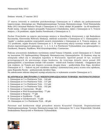Matematyk Roku 2012 Dodano: wtorek, 27 marzec 2012 27 marca (wtorek) w siedzibie piotrkowskiego Gimnazjum nr 5 odbyło się podsumowanie tegorocznego, dziesiątego już, Międzygimnazjalnego Turnieju Matematycznego. Tytuł Matematyka Roku 2012 otrzymał Mateusz Olczyk z Gimnazjum nr 5, który zdobył 36 punktów - na 40 możliwych. Punkt mniej, i drugie miejsce przypadło Tomaszowi Urbańskiemu, także z Gimnazjum nr 5. Trzecie miejsce, z 34 punktami, zajęła Sandra Pawełoszek z Gimnazjum nr 3. Puchar Przechodni za zajęcie pierwszego miejsca w klasyfikacji drużynowej z rąk Radosława Kaczmarka, Kierownika Referatu Edukacji, odebrali uczniowie z Gimnazjum nr 5. Gimnazjaliści z "piątki" o siedem punktów wyprzedzili swoich rówieśników z Gimnazjum nr 4. Trzecie miejsce, ze 112 punktami, zajęła drużyna Gimnazjum nr 3. W tegorocznej edycji turnieju wzięło udział 10 drużyn reprezentujących gimnazja nr: 1, 2, 3, 4, 5 w Piotrkowie Trybunalskim oraz gimnazjaliści z Gorzkowic, Rozprzy, Szydłowa, Woli Krzysztoporskiej i Czarnocina. Podczas uroczystości dodatkowo wyróżniony został Tomasz Urbański, uczeń Gimnazjum nr 5. Został on laureatem VII Ogólnopolskiej Olimpiady Matematycznej Gimnazjalistów. III finałowy etap tej olimpiady odbył się w ubiegłym tygodniu w Warszawie. Spośród ponad 14 tys. uczniów przystępujących do pierwszego etapu konkursu, do trzeciego dotarło nieco ponad 200 gimnazjalistów, a laureatami zostało 149 uczniów – wśród nich Tomasz Urbański. - Osiągnięcie jest tym większe, że Tomek jest dopiero uczniem drugiej klasy – podkreślała Ewa Sipa, dyrektor Gimnazjum nr 5. – Sukces tej jest wynikiem ciężkiej i systematycznej pracy ucznia oraz opiekuna, pana Bogumiła Pęciny – podsumowała dyrektor Sipa. Na zakończenie zebrani obejrzeli występ artystyczny w wykonaniu uczniów Gimnazjum nr 5. KLASYFIKACJA DRUŻYNOWA X MIĘDZYGIMNAZJALNEGO TURNIEJU MATEMATYCZNEGO 1. Gimnazjum nr 5 w Piotrkowie Tryb. - 144 pkt 2. Gimnazjum nr 4 w Piotrkowie Tryb. - 137 pkt 3. Gimnazjum nr 3 w Piotrkowie Tryb. - 112 pkt 4. Gimnazjum nr 1 w Piotrkowie Tryb. - 102 pkt 5. Gimnazjum w Czarnocinie - 98 pkt 6 Gimnazjum w Woli Krzysztoporskiej - 77 pkt Gimnazjum w Rozprzy - 77 pkt 8. Gimnazjum w Szydłowie - 73 pkt 9 Gimnazjum w Gorzkowicach - 72 pkt 10. Gimnazjum nr 2 w Piotrkowie Tryb. - 48 pkt Patronat nad konkursem objął prezydent miasta Krzysztof Chojniak. Organizatorami Międzygimnazjalnego Turnieju Matematycznego byli: Gimnazjum Nr 5 oraz Wojewódzki Ośrodek Doskonalenia Nauczycieli w Piotrkowie Trybunalskim. tagi: Międzygimnazjalny Turniej Matematyczny, Matematyk Roku, matematyka, olimpiada,