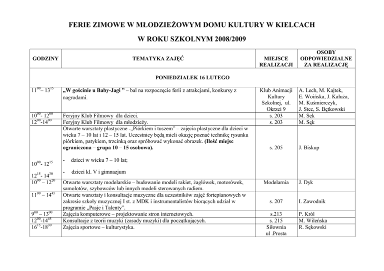 FERIE ZIMOWE W MŁODZIEśOWYM DOMU KULTURY W KIELCACH W ROKU SZKOLNYM 2008/2009 GODZINY TEMATYKA ZAJĘĆ MIEJSCE REALIZACJI OSOBY ODPOWIEDZIALNE ZA REALIZACJĘ Klub Animacji Kultury Szkolnej, ul. Okrzei 9 s. 203 s. 203 A. Lech, M. Kajtek, E. Woińska, J. KałuŜa, M. Kuśmierczyk, J. Stec, S. Bętkowski M. Sęk M. Sęk PONIEDZIAŁEK 16 LUTEGO 1100– 1315 „W gościnie u Baby-Jagi ” – bal na rozpoczęcie ferii z atrakcjami, konkursy z nagrodami. 1000- 1200 1200-1400 Feryjny Klub Filmowy dla dzieci. Feryjny Klub Filmowy dla młodzieŜy. Otwarte warsztaty plastyczne -„Piórkiem i tuszem” – zajęcia plastyczne dla dzieci w wieku 7 – 10 lat i 12 – 15 lat. Uczestnicy będą mieli okazję poznać technikę rysunku piórkiem, patykiem, trzcinką oraz spróbować wykonać obrazek. (Ilość miejsc ograniczona – grupa 10 – 15 osobowa). 1000- 1215 - dzieci w wieku 7 – 10 lat; 1215- 1430 1000 – 1220 - dzieci kl. V i gimnazjum 1100 – 1445 900 – 1300 1200-1445 1615-1830 Otwarte warsztaty modelarskie – budowanie modeli rakiet, Ŝaglówek, motorówek, samolotów, szybowców lub innych modeli sterowanych radiem. Otwarte warsztaty i konsultacje muzyczne dla uczestników zajęć fortepianowych w zakresie szkoły muzycznej I st. z MDK i instrumentalistów biorących udział w programie „Pasje i Talenty”. Zajęcia komputerowe – projektowanie stron internetowych. Konsultacje z teorii muzyki (zasady muzyki) dla początkujących. Zajęcia sportowe – kulturystyka. s. 205 Modelarnia J. Biskup J. Dyk s. 207 I. Zawodnik s.213 s. 215 Siłownia ul .Prosta P. Król M. Wileńska R. Sękowski 900 – 1300 1000-1300 Inauguracja zajęć, wzajemne poznanie, burza mózgów – propozycje programowo repertuarowe zgłaszanych przez uczestników zajęć, podział na zastępy, ustalenie wspólnych zwyczajów. ZAJĘCIA WOKALNE: Kształcenie emisji głosu. Śpiewanie prostych ćwiczeń emisyjnych. Uczymy się rozgrzewać struny głosowe. Nauka piosenki pt. „Niewidzialna plastelina”. Historia muzyki rozrywkowej „Od reggae do rocka” – wykład w połączeniu z prezentacją filmową i muzyczną. Dom Harcerza Białogon G. Maliniak, M. Leśnik s. 108 M. Ziąber Klub Animacji Kultury L. Samson WTOREK 17 LUTEGO IV Konkurs Rozwiązywania Zadań Szachowych 1000- 1100 - grupa młodsza 1100- 1230 - grupa starsza 1000- 1200 Feryjny Klub Filmowy dla dzieci. s. 203 M. Sęk 1200-1400 Feryjny Klub Filmowy dla młodzieŜy. s. 203 M. Sęk 1030 - 1330 Dziecięce Biesiada Literacka „Z Pyzą na polskich dróŜkach” cz. I - poznanie przygód Pyzy, wykonanie figurki Pyzy w formie kukiełki w stroju ludowym, która posłuŜy do tworzenia przygód Pyzy na ziemi świętokrzyskiej, nauka tańców i piosenek ludowych, poczęstunek w postaci misy z gorącymi kraszonymi pyzami oraz pieczywa ze słodką pierzynką. 1100- 1210 Wyjście do Teatru Lalki i Aktora „Kubuś” na spektakl pt. „Mały Tygrys Pietrek”. 15 zbiórka 10 , Zapisy do 16 lutego. Ilość miejsc ograniczona -20 dzieci w wieku 5-10 lat. powrót ok. 1300 1000 – 1220 Otwarte warsztaty modelarskie – budowanie modeli rakiet, Ŝaglówek, motorówek, samolotów, szybowców lub innych modeli sterowanych radiem. 1100 – 1445 Otwarte warsztaty i konsultacje muzyczne dla uczestników zajęć fortepianowych w zakresie szkoły muzycznej I st. z MDK i instrumentalistów biorących udział w programie „Pasje i Talenty”. Szkolnej, ul. Okrzei 9 Galeria „Ślad” B. Wałek, O. Hildebrandt-Ryczek, J. Stec, G. Budziasz, A. Drzonek, M. Kuśmierczyk M. Kajtek, J. KałuŜa, E. Woińska Modelarnia J. Dyk s.207 I. Zawodnik 900 – 1300 900 – 1300 1200-1445 1000-1300 1100-1300 zbiórka 1000 powrót 1345 Zajęcia komputerowe – automaty komórkowe – binarne Ŝycie. Muzyka rockowa z wykorzystaniem instrumentów dętych na przykładzie twórczości kieleckich zespołów. Słuchanie muzyki. Gry i zabawy z muzyką. Spotkanie z muzykiem zespołu rockowego. Konsultacje z gry na pianinie dla początkujących. Historia muzyki rozrywkowej – kierunki rozwoju stylów wokalnych i muzycznych – swing, rock and roll, jazz, country, pop. Konsultacje z zakresu wykonawstwa piosenek w języku angielskim. Krótkie prezentacje solistek śpiewających piosenki angielskie przeplatane występami gitarzystów z pracowni S. Bętkowskiego. Wizyta w „Azylu dla dzikich zwierząt” w Ostrowie k. Chęcin (zwiedzanie wolier ze zwierzętami, konkurs odgłosów ptasich). Ilość miejsc ograniczona. s.213 Dom Harcerza Białogon s. 215 P. Król G. Maliniak, M. Leśnik M. Wileńska M. Ziąber s. 108 P. Surma S. Bętkowski S. Bętkowski, A. Lech, J. Gajek ŚRODA 18 LUTEGO 1000- 1300 1100- 1315 zbiórka 945 powrót 1400 1100-1315 1100-1400 1100- 1300 1000- 1200 1200- 1400 1000 – 1200 Zajęcia taneczne Formacji „Takt”. Warsztaty akrobatyczno-taneczne – nauka Ŝonglerki. Dziecięca Biesiada Literacka „Z Pyzą na polskich dróŜkach” cz. II – wyjazd do gospodarstwa agroturystycznego w Anatolce – kulig, ognisko, biesiada przy kominku, gry i zabawy plenerowe, tańce i śpiewy z Pyzą, poznanie dalszych przygód „Pyzy na polskich dróŜkach”. Ilość miejsc ograniczona. Otwarte warsztaty plastyczne – „Kielce wczoraj, dziś, jutro” (gr. I i II – podstawówka) Otwarte warsztaty plastyczne – „Kielce wczoraj, dziś, jutro” gr. III - gimnazjum Otwarte warsztaty fotografii i grafiki komputerowej w ramach konkursu fotograficznego „Tryptyk Kielecki - Kielce wczoraj, dziś, jutro” – „Pasje i Talenty 2009”. Feryjny Klub Filmowy dla dzieci. Feryjny Klub Filmowy dla młodzieŜy. Otwarte warsztaty modelarskie – budowanie modeli rakiet, Ŝaglówek, motorówek, samolotów, szybowców lub innych modeli sterowanych radiem. s.208 s. 108 Wycieczka do Anatolki s. 205 M. Sęk G. Rem - Kret Hildebrandt-Ryczek, J. Stec, G. Budziasz, A. Drzonek, M. Kuśmierczyk J. Biskup s. 105 L. Niciński s. 213 P. Król s. 203 s. 203 Modelarnia J. KałuŜa, B. Misztal J. KałuŜa