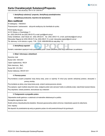 Karta Charakterystyki Substancji/Preparatu Data utworzenia / data aktualizacji: 2007-01-26 / 2008-06-01 1. Identyfikacja substancji / preparatu, identyfikacja przedsiębiorstwa Identyfikacja producenta, importera lub dystrybutora Baru nadtlenek Nr katalogowy: -159242421; Przeznaczenie / zastosowanie: odczynnik analityczny lub chemikalia do syntez. POCH Spółka Akcyjna 44-101 Gliwice, ul. Sowińskiego 11 tel.: (032) 239-20-00; fax (032) 239-23-70; e-mail: [email protected] Osoby kontaktowe: Józef Deryło tel.: (032) 239-22-51, fax: (032) 239-21-15, e-mail: [email protected]; Mieczysław Węgrzyk tel.:(032) 239-24-73, fax: (032) 239-21-15, e-mail: [email protected] Tel. alarmowy: w dni robocze, w godz.: 7.00 - 15.00: +606-659-006 lub całą dobę: 112 2. Identyfikacja zagrożeń Kontakt z materiałami zapalnymi może spowodować pożar. Działa szkodliwie przez drogi oddechowe i po połknięciu. 3. Skład / informacja o składnikach Synonimy: brak Numer CAS: 1304-29-6 Ciężar cząsteczkowy: 169,34 Wzór chemiczny: BaO2 Numer WE: 215-128-4 Numer indeksowy: 056-001-00-1 4. Pierwsza pomoc Przy kontakcie z oczami: przepłukać dużą ilością wody, przez co najmniej 10 minut przy szeroko odchylonej powiece, skorzystać z pomocy okulisty. Przy kontakcie ze skórą: zmyć dużą ilością wody, zmienić zanieczyszczone ubranie. Przy spożyciu: wypić możliwie dużą ilość wody, następnie podać sodu siarczan(1 łyżka na szklankę wody), natychmiast wezwać lekarza. Przy wdychaniu: świeże powietrze, skonsultować się z lekarzem. 5. Postępowanie w przypadku pożaru Odpowiednie środki gaśnicze: w zależności od materiałów składowanych w pobliżu. Szczególne zagrożenia: brak. Środki ochrony indywidualnej dla strażaków: Stosować gazoszczelną odzież ochronną i indywidualny aparat do oddychania. Inne: niepalny. Nie dopuścić do przedostania się wody po gaszeniu pożaru do wód powierzchniowych lub gruntowych. POCH S.A. Karta Charakterystyki Substancji/Preparatu. Strona 1/4 Baru nadtlenek 6. Postępowanie w przypadku niezamierzonego uwolnienia do środowiska Ostrożnie zebrać na sucho, przekazać do likwidacji. Oczyścić zanieczyszczony teren. Nie dopuścić do dostania się do wód, ścieków i gleby. 7. Postępowanie z substancją / preparatem i jej / jego magazynowanie Obchodzenie się z substancją: Zapewnić skuteczną wymianę powietrza (wentylacja). Postępować zgodnie z zasadami dobrej praktyki przemysłowej oraz ogólnymi zasadami bezpieczeństwa i higieny pracy z substancjami chemicznymi. Stosować środki ochrony osobistej zgodnie z pkt.8. Nie opróżniać do kanalizacji. Przy manipulowaniu unikać tworzenia się pyłu/aerozolu. Magazynowanie: szczelne opakowania, suche pomieszczenie. Temperatura pokojowa (zalecana +15 do +25°C). Rozporządzenie Ministra Zdrowia z dnia 14 marca 2003 r. w sprawie sposobu oznakowania miejsc, rurociągów oraz pojemników i zbiorników służących do przechowywania lub zawierających substancje niebezpieczne lub preparaty niebezpieczne (Dz.U.03.61.552) 8. Kontrola narażenia i środki ochrony indywidualnej Paramerty kontroli (NDS, NDSCh, NDSP): bar i jego związki nieorganiczne w przel. na Ba - NDS: 0,5 mg/m3, NDSCh: 1,5 mg/m3. Stosować odpowiednią wentylację wywiewną, miejscową i ogólną zapewniającą utrzymanie stężenia produktu w powietrzu poniżej określonych limitów. Zaleca się wyposażenie miejsca pracy w wodny natrysk do płukania oczu oraz prysznic. Środki ochrony indywidualnej powinny być tak zaprojektowane i wykonane aby wykluczały zagrożenie i inne niedogodności w przewidywanych warunkach użytkowania, chroniące przed chemikaliami. Środki ochrony indywidualnej: ochrona dróg oddechowych: konieczna gdy tworzą się pyły - respirator ochrona oczu: konieczna - okulary ochronne typu gogle ochrona rąk: konieczna - rękawice ochronne odporne na działanie chemikaliów wykonane z gumy nitrylowej lub inne dopuszczone przez producenta rękawic do kontaktu z tym produktem. Czas wytrzymałości materiału określa producent rękawic. ochrona ciała: konieczna - ubranie ochronne środki ochronne i higieny: zmienić zanieczyszczone ubranie. Wymyć ręce po pracy z tą substancją. Rozporządzenie Ministra Zdrowia z dnia 30 grudnia 2004 r. w sprawie bezpieczeństwa i higieny pracy związanej z występowaniem w miejscu pracy czynników chemicznych (Dz.U.05.11.86). Rozporządzenie Ministra Pracy i Polityki Społecznej z dnia 30 sierpnia 2007 (Dz. U. nr 161, poz. 1142) 9. Właściwości fizyczne i chemiczne Forma: ciało stałe lepkość dynamiczna: nie dotyczy Kolor: biały do jasnożółtego lepkość kinematyczna: nie dotyczy Zapach: bez zapachu Ciśnienie par: brak danych pH: ~12 (10g/l H2O 20°C) Gęstość: 4,96g/cm3 (20°C) Temperatura topnienia: 450°C Ciężar nasypowy: 1700-2000 kg/m3 Temperatura wrzenia: rozkład w 800°C Rozpuszczalność: Temperatura samozapłonu: nie dotyczy w wodzie: rozkład Temperatura zapłonu: nie dotyczy w rozpuszczalnikach organicznych: brak danych Granice wybuchowości: nie dotyczy log P(w/o): dolna: górna: POCH S.A. Karta Charakterystyki Substancji/Preparatu. Strona 2/4 Baru nadtlenek 10. Stabilność i reaktywność Warunki których należy unikać: wilgoć Materiały których należy unikać: silne kwasy, woda, glin w proszku, materiały palne, sbstancje organiczne Niebezpieczne produkty rozkładu: brak. Następne dane: możliwość wybuchu w mieszaninie: woda i substancja organiczna 11. Informacje toksykologiczne Informacje toksykologiczne: brak danych ilościowych. Pozostałe dane: przy wdychaniu: podrażnienia błon śluzowych oczu i gardła; przy spożyciu: podrażnienie dróg pokarmowych; kontakt ze skórą: podrażnienia; kontakt z oczami: podrażnienia; przy przewlekłym narażeniu: uszkodzenie centralnego układu nerwowego, śledziony, wątroby, szpiku kostnego 12. Informacje ekologiczne Szkodliwy dla organizmów wodnych. Nie dopuścić do dostania się do wód, 
