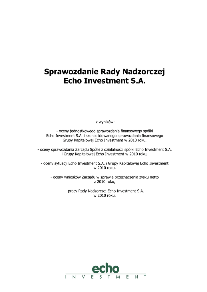 Sprawozdanie Rady Nadzorczej Echo Investment S.A. z wyników: - oceny jednostkowego sprawozdania finansowego spółki Echo Investment S.A. i skonsolidowanego sprawozdania finansowego Grupy Kapitałowej Echo Investment w 2010 roku, - oceny sprawozdania Zarządu Spółki z działalności spółki Echo Investment S.A. i Grupy Kapitałowej Echo Investment w 2010 roku, - oceny sytuacji Echo Investment S.A. i Grupy Kapitałowej Echo Investment w 2010 roku, - oceny wniosków Zarządu w sprawie przeznaczenia zysku netto z 2010 roku, - pracy Rady Nadzorczej Echo Investment S.A. w 2010 roku. Sprawozdanie Rady Nadzorczej Echo Investment S.A. za 2010 rok ____________________________________________________________________________________________ 1. Wnioski z oceny jednostkowego i skonsolidowanego sprawozdania finansowego, sprawozdań Zarządu z działalności Spółki i Grupy Kapitałowej Echo Investment w 2010 roku oraz sytuacji Spółki i Grupy Kapitałowej Echo Investment w 2010 roku Rada Nadzorcza spółki Echo Investment S.A., działając na podstawie art. 382 par. 3 Kodeksu spółek handlowych, dokonała oceny: a) jednostkowego sprawozdania finansowego za rok 2010 obejmującego: jednostkowy bilans sporządzony na dzień 31 grudnia 2010 roku, który po stronie aktywów i pasywów wykazuje sumę 1.458.194 tys. zł, jednostkowy rachunek zysków i strat za okres 1 stycznia 2010 do 31 grudnia 2010 roku, wykazujący zysk netto, w kwocie 38.672 tys. zł, jednostkowe sprawozdanie z przepływów środków pieniężnych za okres 1 stycznia 2010 roku do 31 grudnia 2010 roku, wykazujące bilansowe zwiększenie stanu środków pieniężnych netto w kwocie 11.949 tys. zł, jednostkowe zestawienie zmian w kapitale własnym za okres od 1 stycznia 2010 roku do 31 grudnia 2010 roku wykazujące zwiększenie kapitału własnego w kwocie 38.672 tys. zł, informację dodatkową, w zakresie zgodności z księgami i dokumentami, jak i ze stanem faktycznym; b) sprawozdania Zarządu z działalności Echo Investment S.A. w 2010 roku; c) skonsolidowanego sprawozdania finansowego za rok 2010 obejmującego: skonsolidowany bilans sporządzony na dzień 31 grudnia 2010 roku, który po stronie aktywów i pasywów wykazuje sumę 4.490.959 tys. zł, skonsolidowany rachunek zysków i strat za okres 1 stycznia 2010 do 31 grudnia 2010 roku, wykazujący zysk netto w kwocie 147.644 tys. zł, skonsolidowane sprawozdanie z przepływów środków pieniężnych za okres 1 stycznia 2010 roku do 31 grudnia 2010 roku, wykazujące bilansowe zwiększenie stanu środków pieniężnych w kwocie 210.188 tys. zł, skonsolidowane zestawienie zmian w kapitale własnym za okres od 1 stycznia 2010 roku do 31 grudnia 2010 roku wykazujące zwiększenie kapitału własnego w kwocie 141.838 tys. zł, informację dodatkową, w zakresie zgodności z księgami i dokumentami, jak i ze stanem faktycznym; d) sprawozdania Zarządu z działalności Grupy Kapitałowej Echo Investment w 2010 roku. Do badania zarówno jednostkowego, jak i skonsolidowanego sprawozdania finansowego, Zarząd spółki Echo Investment S.A. zatrudnił firmę audytorską Pricewaterhouse Coopers Sp. z o. o. z siedzibą w Warszawie, w imieniu której działał Piotr Wyszogrodzki – Biegły Rewident, nr ewid. 90091. Rada Nadzorcza zapoznała się z opiniami i raportami biegłych rewidentów dotyczącymi jednostkowego i skonsolidowanego sprawozdania finansowego. Rada Nadzorcza po zapoznaniu się z jednostkowym oraz skonsolidowanym sprawozdaniem finansowym oraz w oparciu o treść opinii i raportu biegłego rewidenta, stwierdza, że dane zawarte w jednostkowym sprawozdaniu ____________________________________________________________________________________________ …………………. …………………. …………………. …………………. …………………. …………………. Wojciech Ciesielski Przewodniczący RN Andrzej Majcher Wiceprzewodniczący RN Mariusz Waniołka Członek RN Robert Oskard Członek RN Karol Żbikowski Członek RN Tomasz Kalwat Członek RN 2 Sprawozdanie Rady Nadzorczej Echo Investment S.A. za 2010 rok ____________________________________________________________________________________________ finansowym Echo Investment S.A. i skonsolidowanym sprawozdaniu finansowym Grupy Kapitałowej Echo Investment – prawidłowo i rzetelnie charakteryzują sytuację majątkową, finansową oraz odzwierciedlają rzetelnie i jasno wszystkie informacje istotne dla oceny wyniku działalności gospodarczej, rentowności i przepływów pieniężnych w badanym okresie. Informacje finansowe zawarte w sprawozdaniach Zarządu jednostki dominującej z działalności Echo Investment S.A. jak i Grupy Kapitałowej Echo Investment w roku 2010, zaczerpnięte są bezpośrednio ze zbadanych sprawozdań finansowych i są z nimi zgodne. Opinia biegłego rewidenta potwierdza, że sprawozdania sporządzone zostały w sposób prawidłowy, we wszystkich istotnych aspektach, zgodnie z zasadami rachunkowości, wynikającymi z Międzynarodowych Standardów Sprawozdawczości Finansowej oraz związanych z nimi interpretacji ogłoszonych w formie rozporządzeń Komisji Europejskiej, a w zakresie nieuregulowanym w tych Standardach – stosownie do wymogów, zgodnie z przepisami ustawy o rachunkowości z dn. 29 września 1994 roku i wydanych na jej podstawie przepisów wykonawczych oraz na podstawie prawidłowo prowadzonych ksiąg rachunkowych. Sprawozdania są zgodne z wpływającymi na treść sprawozdania finansowego przepisami prawa i postanowieniami statutu Spółki Echo Investment S.A. Analiza przedstawionych w sprawozdaniach finansowych za rok 2010 wielkości oraz wskaźników finansowych nasuwa następujące wnioski: Grupa Kapitałowa Echo Investment osiągnęła zysk netto w wysokości 147,6 mln zł, co stanowi 42% wzrostu w stosunku do 2009 roku, zysk operacyjny Grupy Kapitałowej Echo Investment wyniósł 168,7 mln zł i był o 14% niższy niż w roku 2009 (spowodowany przede wsz