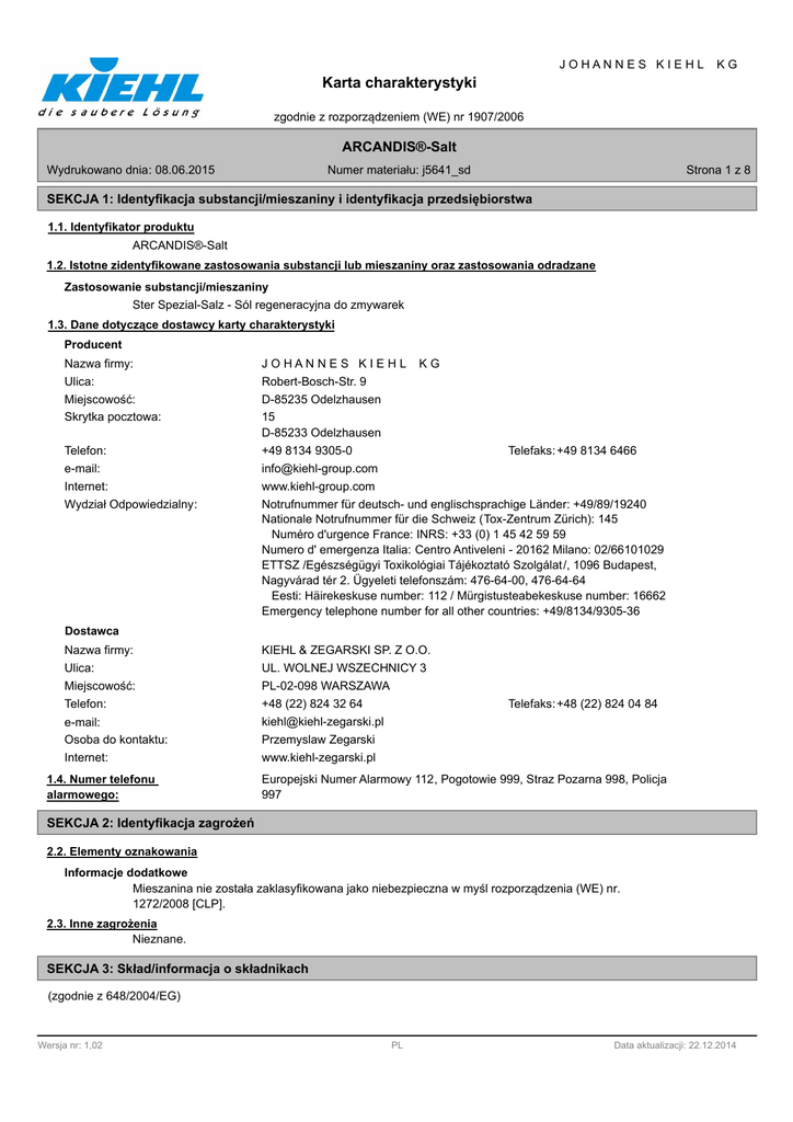 JOHANNES KIEHL KG Karta charakterystyki zgodnie z rozporządzeniem (WE) nr 1907/2006 ARCANDIS®-Salt Wydrukowano dnia: 08.06.2015 Strona 1 z 8 Numer materiału: j5641_sd SEKCJA 1: Identyfikacja substancji/mieszaniny i identyfikacja przedsiębiorstwa 1.1. Identyfikator produktu ARCANDIS®-Salt 1.2. Istotne zidentyfikowane zastosowania substancji lub mieszaniny oraz zastosowania odradzane Zastosowanie substancji/mieszaniny Ster Spezial-Salz - Sól regeneracyjna do zmywarek 1.3. Dane dotyczące dostawcy karty charakterystyki Producent Nazwa firmy: Ulica: Miejscowość: Skrytka pocztowa: Telefon: e-mail: Internet: Wydział Odpowiedzialny: JOHANNES KIEHL Robert-Bosch-Str. 9 D-85235 Odelzhausen 15 D-85233 Odelzhausen +49 8134 9305-0 [email protected] KG Telefaks: +49 8134 6466 www.kiehl-group.com Notrufnummer für deutsch- und englischsprachige Länder: +49/89/19240 Nationale Notrufnummer für die Schweiz (Tox-Zentrum Zürich): 145 Numéro d'urgence France: INRS: +33 (0) 1 45 42 59 59 Numero d' emergenza Italia: Centro Antiveleni - 20162 Milano: 02/66101029 ETTSZ /Egészségügyi Toxikológiai Tájékoztató Szolgálat/, 1096 Budapest, Nagyvárad tér 2. Ügyeleti telefonszám: 476-64-00, 476-64-64 Eesti: Häirekeskuse number: 112 / Mürgistusteabekeskuse number: 16662 Emergency telephone number for all other countries: +49/8134/9305-36 Dostawca Nazwa firmy: Ulica: KIEHL & ZEGARSKI SP. Z O.O. UL. WOLNEJ WSZECHNICY 3 Miejscowość: PL-02-098 WARSZAWA Telefon: +48 (22) 824 32 64 e-mail: Osoba do kontaktu: [email protected] Przemyslaw Zegarski Internet: www.kiehl-zegarski.pl 1.4. Numer telefonu alarmowego: Telefaks: +48 (22) 824 04 84 Europejski Numer Alarmowy 112, Pogotowie 999, Straz Pozarna 998, Policja 997 SEKCJA 2: Identyfikacja zagrożeń 2.2. Elementy oznakowania Informacje dodatkowe Mieszanina nie została zaklasyfikowana jako niebezpieczna w myśl rozporządzenia (WE) nr. 1272/2008 [CLP]. 2.3. Inne zagrożenia Nieznane. SEKCJA 3: Skład/informacja o składnikach (zgodnie z 648/2004/EG) Wersja nr: 1,02 PL Data aktualizacji: 22.12.2014 JOHANNES KIEHL KG Karta charakterystyki zgodnie z rozporządzeniem (WE) nr 1907/2006 ARCANDIS®-Salt Wydrukowano dnia: 08.06.2015 Strona 2 z 8 Numer materiału: j5641_sd 3.1. Substancje Charakterystyka chemiczna Sodium chloride SEKCJA 4: Środki pierwszej pomocy 4.1. Opis środków pierwszej pomocy Wskazówki ogólne Jeśli objawy utrzymują się, wezwać lekarza. W przypadku wdychania Przenieść na świeże powietrze. W przypadku kontaktu ze skórą Zmyć dużą ilością wody. W przypadku kontaktu z oczami Płukać starannie dużą ilością wody, również pod powiekami. W przypadku połknięcia Przemyć usta wodą i następnie wypić dużą ilość wody. Jeśli to możliwe nie dopuścić do wymiotów. Jeśli zajdzie potrzeba zasięgnij porady lekarza. 4.2. Najważniejsze ostre i opóźnione objawy oraz skutki narażenia Informacje te nie są dostępne. 4.3. Wskazania dotyczące wszelkiej natychmiastowej pomocy lekarskiej i szczególnego postępowania z poszkodowanym Przedstawić lekarzowi dołączoną Kartę Charakterystyki Substancji Niebezpiecznej. SEKCJA 5: Postępowanie w przypadku pożaru 5.1. Środki gaśnicze Odpowiednie środki gaśnicze Użycie środków gaśniczych odpowiednich dla lokalnych warunków i dla środowiska. Produkt niepalny. 5.2. Szczególne zagrożenia związane z substancją lub mieszaniną Chlorowodór gazowy (HCl) 5.3. Informacje dla straży pożarnej W razie pożaru i/lub wybuchu nie wdychać dymu. Informacja uzupełniająca Zebrać oddzielnie zanieczyszczoną wodę gaśniczą. Nie można jej usuwać do kanalizacji. SEKCJA 6: Postępowanie w przypadku niezamierzonego uwolnienia do środowiska 6.1. Indywidualne środki ostrożności, wyposażenie ochronne i procedury w sytuacjach awaryjnych Unikać tworzenia się pyłu. 6.2. Środki ostrożności w zakresie ochrony środowiska Nie wylewać do wód powierzchniowych. 6.3. Metody i materiały zapobiegające rozprzestrzenianiu się skażenia i służące do usuwania skażenia Użyj sprzętu mechanicznego. Po oczyszczeniu, pozostałości spłukać wodą. 6.4. Odniesienia do innych sekcji Sprawdź środki ochronne w sekcjach 7 i 8. SEKCJA 7: Postępowanie z substancjami i mieszaninami oraz ich magazynowanie Wersja nr: 1,02 PL Data aktualizacji: 22.12.2014 JOHANNES KIEHL KG Karta charakterystyki zgodnie z rozporządzeniem (WE) nr 1907/2006 ARCANDIS®-Salt Wydrukowano dnia: 08.06.2015 Strona 3 z 8 Numer materiału: j5641_sd 7.1. Środki ostrożności dotyczące bezpiecznego postępowania Wskazówki odnośnie bezpiecznego obchodzenia się z substancją Nie są wymagane specjalne środki ostrożności. Wskazówki na wypadek pożaru i wybuchu Brak specjalnych wymagań dotyczących środków ochrony przeciwpożarowej. 7.2. Warunki bezpiecznego magazynowania, łącznie z informacjami dotyczącymi wszelkich wzajemnych niezgodności Wymagania względem pomieszczeń i pojemników magazynowych Przechowywać w temperaturze pokojowej w oryginalnym opakowaniu. Przechowywać w miejscu dostępnym tylko dla upoważnionych osób. Wskazówki dotyczące wspólnego magazynowania Nie przechowywać z silnymi kwasami i utleniaczami. Inne informacje o warunkach przechowywania Przechowywać pojemnik szczelnie zamkniety. Nigdy nie zwracaj nieużywanego materiału do magazynu. Przechowywać w suchym miejscu. 7.3. Szczególne zastosowanie(-a) końcowe Informacje te nie są dostępne. SEKCJA 8: Kontrola narażenia/środki ochrony indywidualnej 8.1. Parametry dotyczące kontroli 8.2. Kontrola narażenia Stosowne techniczne środki kontroli Nie wymagalne. Indywidualne środki ochrony, takie jak indywidualny sprzęt ochronny Ogólne zasady higieny przemysłowej. Nie wymagane specjalne wyposażenie ochronne. Kontrola narażenia środowiska Stosować zgodnie z zasadami bezpieczeństwa i higieny pracy. SEKCJA 9: Właściwości fizyczne i chemiczne 9.1. Informacje na temat podstawowych właściwości fizycznych i chemi