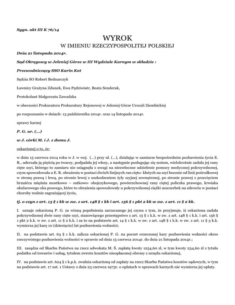 Sygn. akt III K 76/14 WYROK W IMIENIU RZECZYPOSPOLITEJ POLSKIEJ Dnia 21 listopada 2014r. Sąd Okręgowy w Jeleniej Górze w III Wydziale Karnym w składzie : Przewodniczący SSO Karin Kot Sędzia SO Robert Bednarczyk Ławnicy Grażyna Zdunek, Ewa Pędziwiatr, Beata Senderak, Protokolant Małgorzata Zawadzka w obecności Prokuratora Prokuratury Rejonowej w Jeleniej Górze Urszuli Ziembickiej po rozpoznaniu w dniach: 13 października 2014r. oraz 14 listopada 2014r. sprawy karnej P. G. ur. (...) w J. córki M. i J. z domu J. oskarżonej o to, że: w dniu 15 czerwca 2014 roku w J. w woj. (...) przy ul. (...), działając w zamiarze bezpośrednim pozbawienia życia E. R., uderzała ją pięścią po twarzy, podpalała jej włosy, a następnie posługując się nożem, wielokrotnie zadała jej rany cięte szyi, którego to zamiaru nie osiągnęła z uwagi na niezwłoczne udzielenie pomocy medycznej pokrzywdzonej, czym spowodowała u E. R. obrażenia w postaci dwóch linijnych ran cięto- kłutych na szyi bocznie od linii pośrodkowej w stronę prawą i lewą, po stronie lewej z uszkodzeniem żyły szyjnej zewnętrznej, po stronie prawej z przecięciem brzuśćca mięśnia mostkowo – sutkowo- obojczykowego, powierzchownej rany ciętej policzka prawego, krwiaka okularowego oka prawego, które to obrażenia spowodowały u pokrzywdzonej ciężki uszczerbek na zdrowiu w postaci choroby realnie zagrażającej życiu, tj. o czyn z art. 13 § 1 kk w zw. z art. 148 § 1 kk i art. 156 § 1 pkt 2 kk w zw. z art. 11 § 2 kk. I. uznaje oskarżoną P. G. za winną popełnienia zarzucanego jej czynu z tym, że przyjmuje, iż oskarżona zadała pokrzywdzonej dwie rany cięte szyi, stanowiącego przestępstwo z art. 13 § 1 k.k. w zw. z art. 148 § 1 k.k. i art. 156 § 1 pkt 2 k.k. w zw. z art. 11 § 2 k.k. i za to na podstawie art. 14 § 1 k.k. w zw. z art. 148 § 1 k.k. w zw. z art. 11 § 3 k.k. wymierza jej karę 10 (dziesięciu) lat pozbawienia wolności; II. na podstawie art. 63 § 1 k.k. zalicza oskarżonej P. G. na poczet orzeczonej kary pozbawienia wolności okres rzeczywistego pozbawienia wolności w sprawie od dnia 15 czerwca 2014r. do dnia 21 listopada 2014r.; III. zasądza od Skarbu Państwa na rzecz adwokata M. Ś. zapłatę kwoty 1254,60 zł, w tym kwoty 234,60 zł z tytułu podatku od towarów i usług, tytułem zwrotu kosztów nieopłaconej obrony z urzędu oskarżonej, IV. na podstawie art. 624 § 1 k.p.k. zwalnia oskarżoną od zapłaty na rzecz Skarbu Państwa kosztów sądowych, w tym na podstawie art. 17 ust. 1 Ustawy z dnia 23 czerwca 1973r. o opłatach w sprawach karnych nie wymierza jej opłaty. UZASADNIENIE P. G. mieszka w J. na ulicy (...). W miesiącu maju 2014r., po opuszczeniu jednostki penitencjarnej, w której została osadzona w związku z tymczasowym aresztowaniem, przebywała w różnych lokalach mieszkalnych. Począwszy od dnia 13 czerwca 2014r. P. G. zamieszkała u M. P. (1) w, należącym do jego matki, lokalu usytuowanym w J. przy ulicy (...). Podczas pobytu u M. P. (1) kobieta spożywała alkohol, którym częstował ją M. P. (1). (dowód: wyjaśnienia oskarżonej P. G. k. 47-50, k. 77-79, k. 86, k. 183-185, k. 326-327). W dniu 14 czerwca 2014r. na terenie miasta J. P. G. spotkała znaną uprzednio E. R.. (dowód: wyjaśnienia oskarżonej P. G. k. 47-50, k. 77-79, k. 86, k. 183-185, k. 326-327, zeznania świadka E. R. k. 69-71, k. 327-328). Kobieta wcześniej została wyeksmitowana ze swojego mieszkania. (dowód: zeznania świadka E. R. k. 69-71, k. 327-328). P. G. i E. R. udały się do mieszkania zajmowanego przez M. P. (1). (dowód: wyjaśnienia oskarżonej P. G. k. 47-50, k. 77-79, k. 86, k. 183-185, k. 326-327, zeznania świadka E. R. k. 69-71, k. 327-328, zeznania świadka M. P. (1) k. 57-61, k. 331). W tym czasie P. G. posiadała widoczne zasinienie pod lewym okiem. (dowód: zeznania świadka M. P. (1) k. 57-61, k. 331). Podczas pobytu w mieszkaniu u M. P. (1) kobiety spożywały alkohol w postaci wódki, którą kupował M. P. (1). Mężczyzna kilkakrotnie udawał się do okolicznych sklepów po zakup alkoholu. Towarzyszyła mu wówczas P. G.. W tym czasie E. R. pozostawała w mieszkaniu przy ulicy (...) w J.. (dowód: wyjaśnienia oskarżonej P. G. k. 47-50, k. 77-79, k. 86, k. 183-185, k. 326-327, zeznania świadka M. P. (1) k. 57-61, k. 331). W dniu 15 czerwca 2014r. około godziny 13:30 do, położonego w J. przy ulicy (...), mieszkania przyszła J. M.. Kobieta dysponowała kluczami od mieszkania przekazanymi jej przez matkę M. P. (1). Zamierzała ona zabrać z lokalu należące go M. P. (2) rzeczy, w tym odzież, kule oraz buty. Po wejściu do mieszkania J. M. zapukała do drzwi pokoju zajmowanego przez M. P. (1). Mężczyzna otworzył drzwi. J. M. zauważyła, że jest on „kompletnie pijany”. W tym czasie w pokoju tym przebywała także P. G. oraz E. R.. Kobiety siedziały na fotelach. Na stole stał alkohol w postaci wódki. W tym momencie M. P. (1) oświadczył, iż J. M. jest sąsiadką w związku z czym towarzyszące mu kobiety „nie mają prawa (jej) ruszać”. Kiedy J. M. opuszczała pokój wyszyła za nią P. G., która złapała ją od tyłu za ramiona i zaczęła krzyczeć wyrzucając J. M., iż weszła do mieszkania nie zapukawszy. W tym momencie zarówno M. P. (1), jak i E. R. mówili do P. G., że kobieta jest sąsiadką i aby jej „nie ruszała”. Po opuszczeniu mieszkania, z którego J. M. zabrała należącą do M. P. (2) odzież oraz kule, kobieta zatelefonowała do synowej M. P. (2) - K. P., którą poinformowała, że w mieszkaniu M. P. (2) jest głośno, są krzyki. (dowód: zeznania świadka J. M. k. 54-55, k. 328-329). W tym czasie K. P. wraz z mężem powracali ze (...) dokąd udali się w dniu 13 czerwca 2014r. (dowód: zeznania świadka K. P. k. 39-40, k. 329-330, zeznania świadka T. P. k. 41-42, k. 329). W godzinach popołudniowych M. P. (1) położył się spać w swoim pokoju. W tym czasie P. G. przebywała w, zajmowan