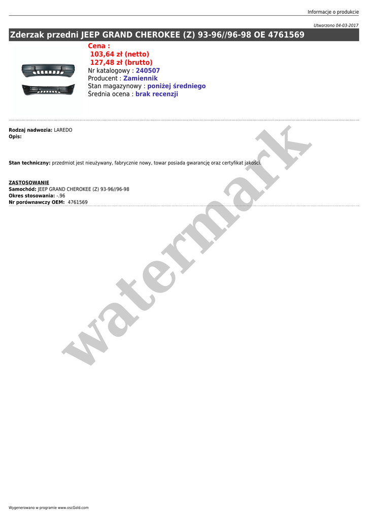 Informacje o produkcie Utworzono 04-03-2017 Zderzak przedni JEEP GRAND CHEROKEE (Z) 93-96//96-98 OE 4761569 Cena : 103,64 zł (netto) 127,48 zł (brutto) Nr katalogowy : 240507 Producent : Zamiennik Stan magazynowy : poniżej średniego Średnia ocena : brak recenzji er m ar k Rodzaj nadwozia: LAREDO Opis: Stan techniczny: przedmiot jest nieużywany, fabrycznie nowy, towar posiada gwarancję oraz certyfikat jakości. w at ZASTOSOWANIE Samochód: JEEP GRAND CHEROKEE (Z) 93-96//96-98 Okres stosowania: -.96 Nr porównawczy OEM: 4761569 Wygenerowano w programie www.oscGold.com
