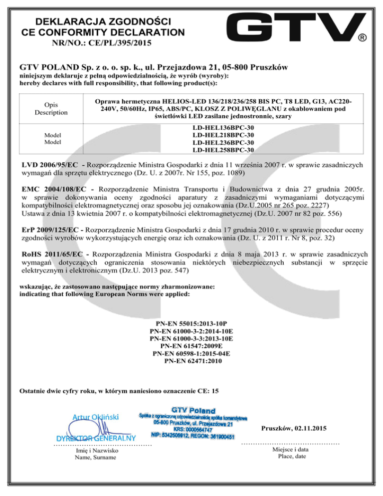 DEKLARACJA ZGODNOŚCI CE CONFORMITY DECLARATION NR/NO.: CE/PL/395/2015 GTV POLAND Sp. z o. o. sp. k., ul. Przejazdowa 21, 05-800 Pruszków niniejszym deklaruje z pełną odpowiedzialnością, że wyrób (wyroby): hereby declares with full responsibility, that following product(s): Opis Description Oprawa hermetyczna HELIOS-LED 136/218/236/258 BIS PC, T8 LED, G13, AC220240V, 50/60Hz, IP65, ABS/PC, KLOSZ Z POLIWĘGLANU z okablowaniem pod świetlówki LED zasilane jednostronnie, szary Model Model LD-HEL136BPC-30 LD-HEL218BPC-30 LD-HEL236BPC-30 LD-HEL258BPC-30 LVD 2006/95/EC - Rozporządzenie Ministra Gospodarki z dnia 11 września 2007 r. w sprawie zasadniczych wymagań dla sprzętu elektrycznego (Dz. U. z 2007r. Nr 155, poz. 1089) EMC 2004/108/EC - Rozporządzenie Ministra Transportu i Budownictwa z dnia 27 grudnia 2005r. w sprawie dokonywania oceny zgodności aparatury z zasadniczymi wymaganiami dotyczącymi kompatybilności elektromagnetycznej oraz sposobu jej oznakowania (Dz.U.2005 nr 265 poz. 2227) Ustawa z dnia 13 kwietnia 2007 r. o kompatybilności elektromagnetycznej (Dz.U. 2007 nr 82 poz. 556) ErP 2009/125/EC - Rozporządzenie Ministra Gospodarki z dnia 17 grudnia 2010 r. w sprawie procedur oceny zgodności wyrobów wykorzystujących energię oraz ich oznakowania (Dz. U. z 2011 r. Nr 8, poz. 32) RoHS 2011/65/EC - Rozporządzenia Ministra Gospodarki z dnia 8 maja 2013 r. w sprawie zasadniczych wymagań dotyczących ograniczenia stosowania niektórych niebezpiecznych substancji w sprzęcie elektrycznym i elektronicznym (Dz.U. 2013 poz. 547) wskazując, że zastosowano następujące normy zharmonizowane: indicating that following European Norms were applied: PN-EN 55015:2013-10P PN-EN 61000-3-2:2014-10E PN-EN 61000-3-3:2013-10E PN-EN 61547:2009E PN-EN 60598-1:2015-04E PN-EN 62471:2010 Ostatnie dwie cyfry roku, w którym naniesiono oznaczenie CE: 15 Pruszków, 02.11.2015 …………………………………… Imię i Nazwisko Name, Surname …………………………………… Miejsce i data Place, date