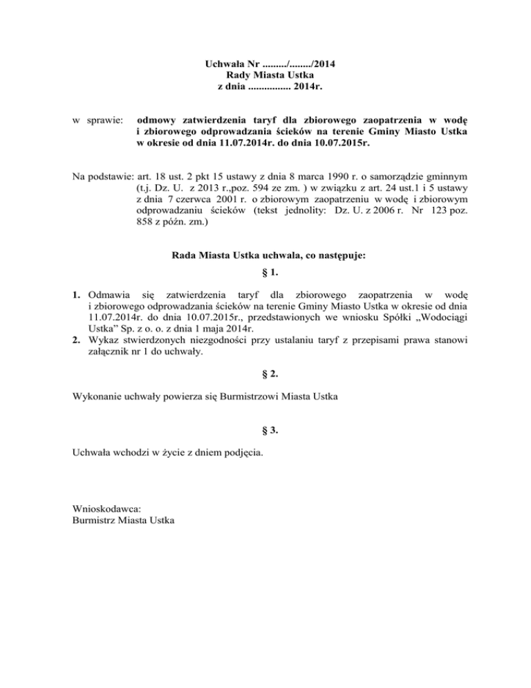 Uchwała Nr ........./......../2014 Rady Miasta Ustka z dnia ................ 2014r. w sprawie: odmowy zatwierdzenia taryf dla zbiorowego zaopatrzenia w wodę i zbiorowego odprowadzania ścieków na terenie Gminy Miasto Ustka w okresie od dnia 11.07.2014r. do dnia 10.07.2015r. Na podstawie: art. 18 ust. 2 pkt 15 ustawy z dnia 8 marca 1990 r. o samorządzie gminnym (t.j. Dz. U. z 2013 r.,poz. 594 ze zm. ) w związku z art. 24 ust.1 i 5 ustawy z dnia 7 czerwca 2001 r. o zbiorowym zaopatrzeniu w wodę i zbiorowym odprowadzaniu ścieków (tekst jednolity: Dz. U. z 2006 r. Nr 123 poz. 858 z późn. zm.) Rada Miasta Ustka uchwala, co następuje: § 1. 1. Odmawia się zatwierdzenia taryf dla zbiorowego zaopatrzenia w wodę i zbiorowego odprowadzania ścieków na terenie Gminy Miasto Ustka w okresie od dnia 11.07.2014r. do dnia 10.07.2015r., przedstawionych we wniosku Spółki „Wodociągi Ustka” Sp. z o. o. z dnia 1 maja 2014r. 2. Wykaz stwierdzonych niezgodności przy ustalaniu taryf z przepisami prawa stanowi załącznik nr 1 do uchwały. § 2. Wykonanie uchwały powierza się Burmistrzowi Miasta Ustka § 3. Uchwała wchodzi w życie z dniem podjęcia. Wnioskodawca: Burmistrz Miasta Ustka Uzasadnienie W dniu 1 maja 2014r. Spółka „Wodociągi Ustka” złożyła wniosek o zatwierdzenie taryf dla zbiorowego zaopatrzenia w wodę i zbiorowego odprowadzania ścieków na terenie Gminy Miasto Ustka w okresie od dnia 11.07.2014r. do dnia 10.07.2015r. Zgodnie z art. 24 ust. 5 ustawy z dnia 7 czerwca 2001 r. o zbiorowym zaopatrzeniu w wodę i zbiorowym odprowadzaniu ścieków (tekst jednolity: Dz. U. z 2006 r. Nr 123 poz. 858 z późn. zm.) Rada Miasta Ustka może podjąć uchwałę o zatwierdzeniu przedstawionych taryf lub o odmowie zatwierdzenia, jeśli zostały one sporządzone niezgodnie z przepisami. Ze względu na stwierdzone niezgodności z przepisami, opisane w załączniku nr 1 do uchwały, istnieje uzasadnienie prawne do podjęcia uchwały o odmowie zatwierdzenia taryf. Załącznik nr 1 do uchwały nr ................ Rady Miasta Ustka z dnia ..................... 2014r. Weryfikacja niniejsza została wykonana w celu oceny zgodności wniosku z zapisami art. 24 ust. 4 ustawy z dnia 7 czerwca 2001r. o zbiorowym zaopatrzeniu w wodę i zbiorowym odprowadzeniu ścieków (tekst jednolity: Dz. U. z 2006 r. Nr 123 poz. 858 z poźn. zm.), zwanej dalej ustawą i w oparciu o zapisy rozporządzenia Ministra Budownictwa z dnia 28.06.2006r. w sprawie określenia taryf, wzoru wniosku o zatwierdzenie taryf oraz warunków rozliczeń za zbiorowe zaopatrzenie w wodę i zbiorowe odprowadzanie ścieków (Dz. U. z 2006r., Nr 127, poz. 886 z późn. zm.) zwanego dalej rozporządzeniem. 1. Ocena formalna. 1) Wniosek został złożony w wymaganym terminie – zgodnie z art. 24 ust. 2 ustawy. 2) Wniosek zawiera szczegółową kalkulację cen oraz obowiązujący plan rozwoju i modernizacji urządzeń wodociągowych i urządzeń kanalizacyjnych na lata 2013-2015– zgodnie z art. 24. ust. 4 ustawy. 3) Do wniosku załączono dokumenty wymagane zapisami § 19 ust. 1 rozporządzenia, tj.: a) taryfy dla zbiorowego zaopatrzenia w wodę i zbiorowego odprowadzania ścieków na terenie Gminy Miasto Ustka na okres od dnia 01.04.2014r. do dnia 31.03.2015r. b) uzasadnienie wniosku. 4) Uzasadnienie wniosku zawiera zapisy wymagane § 19 ust. 2 rozporządzenia, tj.: a) zakres świadczonych usług i lokalnych uwarunkowań ich świadczenia, b) standardy jakościowe usług, w tym informację dotyczącą wpływu określonej taryfy na ich poprawę, c) spodziewaną poprawę jakości usług przy wprowadzeniu nowych metod alokacji kosztów, d) zmianę warunków ekonomicznych w czasie obowiązywania taryf. 5) Uzasadnienie wniosku zawiera dokumenty wymagane zapisami § 19 ust. 3 rozporządzenia, tj.: a) sprawozdanie finansowe za rok obrotowy 2012, b) obowiązujący wieloletni plan rozwoju i modernizacji urządzeń wodociągowych i urządzeń kanalizacyjnych na lata 2013-2015, c) tabele kalkulacyjne od A do H. 6) Taryfa zawiera zapisy wymagane w § 4 rozporządzenia, tj.: a) rodzaje prowadzonej działalności, b) rodzaj i strukturę taryfy, c) taryfowe grupy odbiorców usług, d) rodzaje i wysokość cen i stawek opłat, e) warunki rozliczeń z uwzględnieniem wyposażenia nieruchomości w przyrządy i urządzenia pomiarowe, f) warunki stosowania cen i stawek opłat – w tym: - zakres świadczonych usług dla poszczególnych taryfowych grup odbiorców, - standardy jakościowe obsługi odbiorców usług. Wniosek spełnia wymogi formalne wynikające z przepisów prawa. 2. Ocena merytoryczna. Burmistrz Miasta Ustka zlecił niezależnej firmie REWIT Księgowi i Biegli Rewidenci Sp. z o. o. z Gdańska przeprowadzenie opracowania oceny celowości ponoszonych kosztów ujętych we wniosku o zatwierdzenie taryf, w tym przeprowadzenie analizy przychodów ze sprzedaży oraz kosztów działalności operacyjnej za rok obrachunkowy wprowadzenia taryf pod kątem osiąganej przez spółkę WODOCIĄGI USTKA Sp. z o.o. rentowności. W wyniku zrealizowania ww. zlecenia sporządzony został dokument pn. „Ocena celowości kosztów ujętych we wniosku „WODOCIĄGI USTKA” Sp. z o.o. o zatwierdzenie taryf dla zbiorowego zaopatrzenia w wodę i zbiorowego odprowadzania ścieków na terenie Gminy Miasta Ustka pod względem celowości ponoszonych kosztów sporządzona dla Urzędu Miasta Ustka”., który został zatwierdzony w dniu 20 maja 2014r. przez Burmistrza Miasta Ustka. Biegli rewidenci spółki przeprowadzającej ocenę na wstępie dokonali analizy działalności spółki w okresie trzech ostatnich lat na podstawie przedłożonych przez spółkę dokumentów, a następnie analizowali dane księgowe zawarte we Wniosku o zatwierdzenie taryf dla zbiorowego zaopatrzenia w wodę i zbiorowego odprowadzania ścieków z dnia 1 maja 2014 roku („Wniosek”), jak również w oparciu o dane finansowe zawarte w sprawozdaniu finansowym za rok obrotowy 2012, dane f