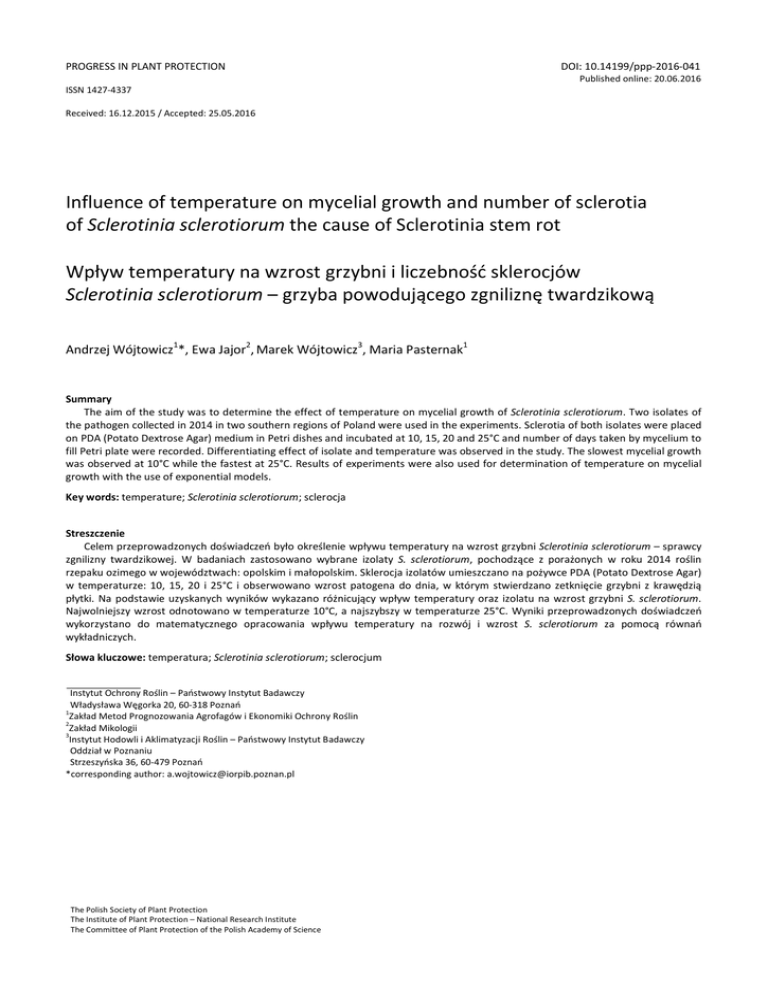 PROGRESS IN PLANT PROTECTION 55 (4): xxx-xxx, 2015 ISSN 1427-4337 DOI: 10.14199/ppp-2016-041 Published online: 20.06.2016 Received: 16.12.2015 / Accepted: 25.05.2016 Influence of temperature on mycelial growth and number of sclerotia of Sclerotinia sclerotiorum the cause of Sclerotinia stem rot Wpływ temperatury na wzrost grzybni i liczebność sklerocjów Sclerotinia sclerotiorum – grzyba powodującego zgniliznę twardzikową Andrzej Wójtowicz1*, Ewa Jajor2, Marek Wójtowicz3, Maria Pasternak1 Summary The aim of the study was to determine the effect of temperature on mycelial growth of Sclerotinia sclerotiorum. Two isolates of the pathogen collected in 2014 in two southern regions of Poland were used in the experiments. Sclerotia of both isolates were placed on PDA (Potato Dextrose Agar) medium in Petri dishes and incubated at 10, 15, 20 and 25°C and number of days taken by mycelium to fill Petri plate were recorded. Differentiating effect of isolate and temperature was observed in the study. The slowest mycelial growth was observed at 10°C while the fastest at 25°C. Results of experiments were also used for determination of temperature on mycelial growth with the use of exponential models. Key words: temperature; Sclerotinia sclerotiorum; sclerocja Streszczenie Celem przeprowadzonych doświadczeń było określenie wpływu temperatury na wzrost grzybni Sclerotinia sclerotiorum – sprawcy zgnilizny twardzikowej. W badaniach zastosowano wybrane izolaty S. sclerotiorum, pochodzące z porażonych w roku 2014 roślin rzepaku ozimego w województwach: opolskim i małopolskim. Sklerocja izolatów umieszczano na pożywce PDA (Potato Dextrose Agar) w temperaturze: 10, 15, 20 i 25°C i obserwowano wzrost patogena do dnia, w którym stwierdzano zetknięcie grzybni z krawędzią płytki. Na podstawie uzyskanych wyników wykazano różnicujący wpływ temperatury oraz izolatu na wzrost grzybni S. sclerotiorum. Najwolniejszy wzrost odnotowano w temperaturze 10°C, a najszybszy w temperaturze 25°C. Wyniki przeprowadzonych doświadczeń wykorzystano do matematycznego opracowania wpływu temperatury na rozwój i wzrost S. sclerotiorum za pomocą równań wykładniczych. Słowa kluczowe: temperatura; Sclerotinia sclerotiorum; sclerocjum Instytut Ochrony Roślin – Państwowy Instytut Badawczy Władysława Węgorka 20, 60-318 Poznań 1 Zakład Metod Prognozowania Agrofagów i Ekonomiki Ochrony Roślin 2 Zakład Mikologii 3 Instytut Hodowli i Aklimatyzacji Roślin – Państwowy Instytut Badawczy Oddział w Poznaniu Strzeszyńska 36, 60-479 Poznań *corresponding author: [email protected] The Polish Society of Plant Protection The Institute of Plant Protection – National Research Institute The Committee of Plant Protection of the Polish Academy of Science 2 Influence of temperature of Sclerotinia sclerotiorum / Wpływ temperatury na Sclerotinia sclerotiorum Wstęp / Introduction Sclerotinia sclerotiorum (Lib.) de Bary występuje powszechnie na wielu kontynentach i charakteryzuje się bardzo szerokim zakresem roślin gospodarzy. Poraża około 400 gatunków roślin (Purdy 1979). Stanowi poważne zagrożenie dla roślin uprawnych o dużym znaczeniu gospodarczym, takich jak: słonecznik, ziemniak, tytoń, pomidor, rośliny z rodziny bobowatych oraz kapustowatych, w tym rzepak (Boland i Hall 1994; Hegedus i Rimmer 2005; Rimmer i wsp. 2007). Straty w plonach wywołane porażeniem roślin przez S. sclerotiorum uzależnione są od stopnia podatności odmian oraz przebiegu warunków meteorologicznych, z których temperatura, obok opadów oraz wilgotności powietrza i gleby odgrywa kluczową rolę (Koch i wsp. 2007; Wu i Subbarao 2008; Wu i wsp. 2008). Wśród doniesień naukowych na temat wpływu temperatury na rozwój grzybni S. sclerotiorum przeważają opracowania pochodzące z 20. wieku (Coe 1944; Morgan 1952; Cappellini 1960; Porth 1966; Abawi i Grogan 1975). W ostatnim dziesięcioleciu liczba publikacji uwzględniających tę tematykę jest znacznie skromniejsza (Bolton i wsp. 2006). Występują ponadto różnice w opiniach na temat optymalnej temperatury warunkującej przyrost grzybni. Według jednych optymalna temperatura dla rozwoju grzybni S. sclerotiorum nie przekracza 20°C (Coe 1944; Morgan 1952), natomiast autorzy nowszych prac uważają, że jest zbliżona do 25°C (Cuong i Dohroo 2006; Hoyte 2012). W związku z powyższym oraz z powodu braku informacji o wpływie temperatury na rozwój grzybni występujących w Polsce izolatów S. sclerotiorum zasadnym wydaje się ponowne podjęcie tej tematyki. Celem pracy było określenie w warunkach kontrolowanych wpływu temperatury na wzrost grzybni oraz liczebność sklerocjów S. sclerotiorum. Materiały i metody / Materials and methods Ze zgromadzonych w Zakładzie Mikologii Instytutu Ochrony Roślin – Państwowego Instytutu Badawczego w Poznaniu kilkudziesięciu kultur grzyba S. sclerotiorum pochodzących z różnych rejonów uprawy rzepaku w Polsce, do doświadczeń wybrano dwa izolaty. Wytypowano je na podstawie zróżnicowania pod względem budowy morfologicznej grzybni powietrznej i tempa wzrostu na pożywce PDA (Potato Dextrose Agar, Difco) oraz patogeniczności. Pierwszy izolat charakteryzował się bardzo obfitą, szybko rosnącą grzybnią, natomiast drugi izolat rósł na pożywce wolniej, a jego grzybnia powietrzna była bardzo uboga. Użyte w badaniu izolaty w przeprowadzonych wcześniej testach z zakażaniem roślin rzepaku wyróżniały się wysoką patogenicznością. Izolaty zostały zebrane z roślin rzepaku ozimego w roku 2014 w miejscowości Kubice, województwo opolskie (izolat 1) oraz w miejscowości Sidzina, województwo małopolskie (izolat 2). Izolaty inkubowano w temperaturze 18°C (Cappelli i wsp. 1998), przez 15 dni na pożywce PDA w celu uzyskania sklerocjów S. sclerotiorum. Powstałe sklerocja pobierano, następnie odkażano przez 1 minutę w 5% roztworze podchlorynu sodu i płukano pod bieżącą wodą. Po osus