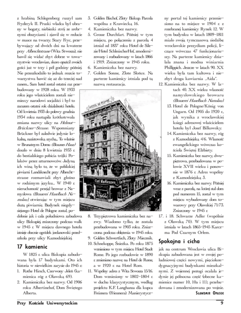z hrabin¹ Schlegenberg ruszy³ sam Fryderyk II. Pruski w³adca by³ ubrany w bogaty, niebieski strój ze srebrnymi obszyciami i zjawi³ siê w reducie w masce na twarzy. Stary Fryc, przebywaj¹cy od dwóch dni na kwaterze przy Albrechtstrasse (Wita Stwosza), nie bawi³ siê widaæ zbyt dobrze w towarzystwie wroc³awian, skoro opuci³ swoich goci ju¿ w trzy i pó³ godziny póniej. Nie przeszkodzi³o to jednak reszcie towarzystwa bawiæ siê a¿ do trzeciej nad ranem... Sam hotel zosta³ ostatni raz przebudowany w 1928 roku. W 1933 roku jego w³acicielem zostali niemieccy narodowi socjalici i by³ to zarazem ostatni rok dzia³alnoci hotelu. Od kwietnia 1933 do po³owy grudnia 1934 roku nast¹pi³a krótkotrwa³a zmiana nazwy ulicy na HelmutBrückner-Strasse. Wspomniany Brückner by³ zaledwie jedynie lokaln¹, nazistowsk¹ szych¹... To w³anie w Brunatnym Domu (Braunes Haus) dosz³o w dniu 8 kwietnia 1933 r. do bestialskiego pobicia trójki Polaków przez szturmowców. Jedyn¹ ich win¹ by³o to, ¿e w pobliskiej piwiarni Landsknecht przy Albrechtstrasse rozmawiali zbyt g³ono w rodzimym jêzyku... W 1940 r. nieruchomoæ przej¹³ browar z Namys³owa (Brauerei Haselbach Namslau), otwieraj¹c w tym miejscu du¿¹ piwiarniê. Budynek niegdysiejszego Hotel de Pologne zosta³, podobnie jak i ca³a po³udniowa zabudowa ulicy Biskupiej, zniszczony podczas walk w 1945 r. W miejscu dawnego hotelu istnieje obecnie ogródek jordanowski przedszkola przy ulicy Kaznodziejskiej. 17 kkamienic amienic W 1825 r. ulica Biskupia zabudowana by³a 17 budynkami. Oto ich historia w niewielkim zarysie do 1945 r.: 1. Rothe Hirsch, Czerwony Jeleñ (kamienica róg z O³awsk¹ 69). 2. Kamieniczka bez nazwy. Od 1906 roku Albertinehof, Dom wiêtego Alberta. Pr zy K oci el niw ersyt eckim Przy Koci ociel elee U Uniw niwersyt ersyteckim 3. Golden Bischof, Z³oty Biskup. Parcela wspólna z Krawieck¹ 16. 4. Kamieniczka bez nazwy. 5. Grosse Durchfart. Póniej w tym miejscu, po po³¹czeniu z parcel¹ 4 istnia³ od 1837 roku Hotel de Silezie/Hotel SchlesischerHof, zmodernizowany i rozbudowany w latach 1866 i 1919. Zniszczony w 1945 roku. 6. Kamieniczka bez nazwy. 7. Golden Sonne, Z³ote S³oñce. Na parterze kamienicy istnia³a pod t¹ nazw¹ restauracja. 8. Trzypiêtrowa kamieniczka bez nazwy. Wiadomo tylko, ¿e zosta³a przebudowana w 1903 roku. Zniszczona podczas oblê¿enia w 1945 roku. 9. Golden Schwertfisch, Z³oty Miecznik. 10. Schnekoppe, nie¿ka. Po roku 1875 wzniesiono w tym miejscu Hotel Stadt Rome. Po jego rozbudowie w 1890 r. zmieniono nazwê na Hotel de Rome, a w 1920 r. na Hotel Rom. 11. Wspólny adres z Wita Stwosza 15/16. Dom wzniesiony w 1802-1804 r. w duchu klasycystycznym, wed³ug projektu K.F. Langhansa dla kupca Freisnera (Friessnera). Manierystycz- ny portal tej kamienicy przeniesiono na to miejsce w 1904 r. z rozebranej kamienicy Rynek 12. W tym budynku w latach 1809-1811 mia³o swoj¹ tymczasow¹ siedzibê wroc³awskie prezydium policji, licz¹ce wówczas 47 funkcjonariuszy. Na parterze kamienicy dzia³a³a znana i modna winiarnia Phillippich. Jeszcze w latach 90. XX wieku by³a tam kultowa i niezbyt droga kawiarnia Aida. 12. Kamieniczka bez nazwy. W latach 40. XX wieku w³asnoæ namys³owskiego browaru (Brauerei Haselbach Namslau). 13. Hotel de Pologne/König von Ungarn. Od 1905 do 1920 r., jak wynika z wroc³awskiej ksiêgi adresowej w³acicielem hotelu by³ Josef Bilkowsky. 14. Kamieniczka bez nazwy, róg z Kaznodziejsk¹ 4/6. W³asnoæ ewangelickiego wówczas kocio³a wiêtej El¿biety. 15. Kamieniczka bez nazwy, dwupiêtrowa, przebudowana w po³owie XVII wieku i ponownie w 1876 r. Adres wspólny z Kaznodziejsk¹ 3. 16. Kamieniczka bez nazwy. Póniej wraz z parcel¹, na której sta³ dom pod numerem 15, zosta³ w tym miejscu wybudowany dom towarowy przy O³awskiej 71/73. Zniszczony w 1945 r. 17. i 18. Schwarze Adler (wspólnie z O³awsk¹ 70). W tym miejscu istnia³a w latach 1865-1945 Karczma Pod Czarnym Or³em. Spok ojna i cicha Spokojna jak na centrum Wroc³awia ulica Biskupia zabudowana jest w swojej po³udniowej czêci nowymi, piêciokondygnacyjnymi budynkami mieszkalnymi. Z wojennej po¿ogi ocala³a jedynie jej pó³nocna czêæ (obecne kamienice numer 10, 10a i 11), przebudowana i zmodernizowana po wojnie. S £A W OMIR O P ASEK £AW 9