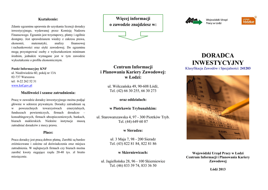 Kształcenie: Zdanie egzaminu uprawnia do uzyskania licencji doradcy inwestycyjnego, wydawanej przez Komisję Nadzoru Finansowego. Egzamin jest trzyetapowy, płatny i ogólnie dostępny. Jest sprawdzianem wiedzy z zakresu prawa, ekonomii, matematyki, analizy finansowej i rachunkowości oraz etyki zawodowej. Do egzaminu mogą przystępować osoby z wykształceniem minimum średnim, jednakŜe wymagane jest w tym zawodzie wykształcenie o profilu ekonomicznym. Punkt Informacyjny KNF ul. Niedźwiedzia 6E; pokój nr 13A 02-737 Warszawa tel: 0-22 262 52 31 www.knf.gov.pl MoŜliwości i szanse zatrudnienia: Pracę w zawodzie doradcy inwestycyjnego moŜna podjąć głównie w sektorze prywatnym. Doradcy zatrudniani są w powszechnych towarzystwach emerytalnych, funduszach powierniczych, firmach doradczo – konsultingowych, firmach ubezpieczeniowych, bankach, biurach maklerskich. Niektóre instytucje muszą zatrudniać doradców z mocy prawa. Płace: Praca doradcy jest pracą dobrze płatną. Zarobki są bardzo zróŜnicowane i zaleŜne od doświadczenia oraz miejsca zatrudnienia. W najlepszych firmach czy biurach moŜna zarobić kwoty sięgające rzędu 20-40 tys. zł brutto miesięcznie. Więcej informacji o zawodzie znajdziesz w: Centrum Informacji i Planowania Kariery Zawodowej: w Łodzi: DORADCA INWESTYCYJNY Klasyfikacja Zawodów i Specjalności: 241203 ul. Wólczańska 49, 90-608 Łódź, Tel. (42) 66 30 255, 66 30 273 oraz oddziałach: w Piotrkowie Trybunalskim: ul. Starowarszawska 4, 97 - 300 Piotrków Tryb. Tel. (44) 649 60 87 w Sieradzu: ul. 3 Maja 7, 98 - 200 Sieradz Tel. (43) 822 81 84, 822 81 86 w Skierniewicach: ul. Jagiellońska 28, 96 - 100 Skierniewice Tel. (46) 833 39 74, 833 36 50 Wojewódzki Urząd Pracy w Łodzi Centrum Informacji i Planowania Kariery Zawodowej Łódź 2013 Doradca inwestycyjny - w ramach usług domu maklerskiego świadczy pomoc, udzielając odpłatnie informacji dotyczących obrotu papierami wartościowymi oraz zarządza na zlecenie cudzym pakietem papierów wartościowych. Zadania zawodowe: Celem pracy doradcy inwestycyjnego jest lokowanie środków na rynkach kapitałowych. Rynki kapitałowe to rynki finansowe związane z obrotem instrumentami finansowymi, którymi są: akcje, obligacje, bony skarbowe, towary i waluty. Istnieją dwa zasadnicze obszary działalności doradcy inwestycyjnego. Pierwszym z nich, jest doradztwo polegające na wydawaniu rekomendacji dotyczących papierów wartościowych w następstwie, których klient moŜe samodzielnie inwestować własne pieniądze. Wymaga to ustalenia celu inwestycyjnego czyli zapoznania się z oczekiwaniami klienta dotyczącymi formy i czasu pomnaŜania kapitału. Po zebraniu niezbędnych informacji doradca opracowuje strategię inwestycyjną i proponuje najbardziej korzystne dla klienta opcje inwestowania, poprzez dobór i konstrukcję portfela instrumentów finansowych mogących przynieść maksymalny zysk przy minimalizacji ryzyka. Drugim obszarem działalności doradcy inwestycyjnego jest zarządzanie portfelem instrumentów finansowych na zlecenie osób trzecich czyli inwestorów indywidualnych i instytucjonalnych. Zarządzanie jest usługą odpłatną. Doradca inwestycyjny, aby móc odpowiednio zarządzać powierzonym kapitałem, musi doskonale znać prawa rządzące rynkiem papierów wartościowych, kontrolować sytuację na giełdzie oraz pilnie śledzić wydarzenia gospodarcze w kraju i na świecie. O tym, co kupić, co sprzedać, a co zatrzymać, decyduje doradca na własną odpowiedzialność, ale ryzyko finansowe zawsze ponosi inwestor. Przy podejmowaniu decyzji pomocne są doradcy tabele i wykresy opisujące zmienność wartości akcji i obligacji w czasie. Jednym z waŜniejszych obowiązków doradcy inwestycyjnego jest przewidywanie, jak będą kształtowały się ceny papierów wartościowych w dłuŜszej perspektywie czasowej. Doradca zarządzający funduszem, w odróŜnieniu od zarządzającego portfelem, nie musi uzgadniać z klientem metody działania. W swej pracy doradca współpracuje z maklerem, który realizuje decyzje doradcy i dokonuje transakcji papierami wartościowymi na giełdzie. Celem doradcy zarządzającego funduszem jest zysk, ale przy zachowaniu zasady ograniczonego ryzyka. NajwaŜniejszą bowiem sprawą jest ochrona majątku funduszu tak, aby posiadacze jednostek uczestnictwa czyli klienci - nie ponieśli strat. Warunki podjęcia pracy w zawodzie: Tytuł zawodowy doradcy inwestycyjnego podlega ochronie prawnej. Oznacza to, Ŝe prawo wykonywania zawodu przysługuje osobom, które są wpisane na listę doradców prowadzoną przez Komisję Nadzoru Finansowego. Aby zostać wpisanym na listę niezbędne jest: • posiadanie pełnej zdolności do czynności prawnych, • korzystanie w pełni z praw publicznych, • brak uznania prawomocnym orzeczeniem za winnego przestępstwa skarbowego, przestępstwa przeciwko wiarygodności dokumentów, mieniu, obrotowi gospodarczemu, obrotowi pieniędzmi i papierami wartościowymi, • zdanie z wynikiem pozytywnym egzaminu państwowego organizowanego przez Komisję Nadzoru Finansowego. Wymagania psychologiczne: Doradca inwestycyjny musi umieć ocenić sytuację gospodarczą i polityczną oraz formułować właściwe wnioski. Dlatego najwaŜniejszymi cechami osoby wykonującej ten zawód powinny być dokładność oraz umiejętność logicznego myślenia. WaŜne są takŜe cierpliwość i umiejętność pracy w warunkach monotonnych oraz umiejętność przeprowadzania analiz. Czasami doradca musi kilkanaście godzin spędzić na analizie tabel i wykresów, aby w końcu podjąć właściwą decyzję. W zawodzie tym niezbędne jest zrównowaŜenie psychiczne, umiejętność nieulegania emocjom oraz odporność na stres. Zmienność informacji oraz notowań na giełdzie ma niejednokrotnie wpływ na całkowitą zmianę wcześniej przygotowanej analizy finansowej. W takim przypadku trzeba wykazać się szybkim refleksem, ocenić sytuację, dokona