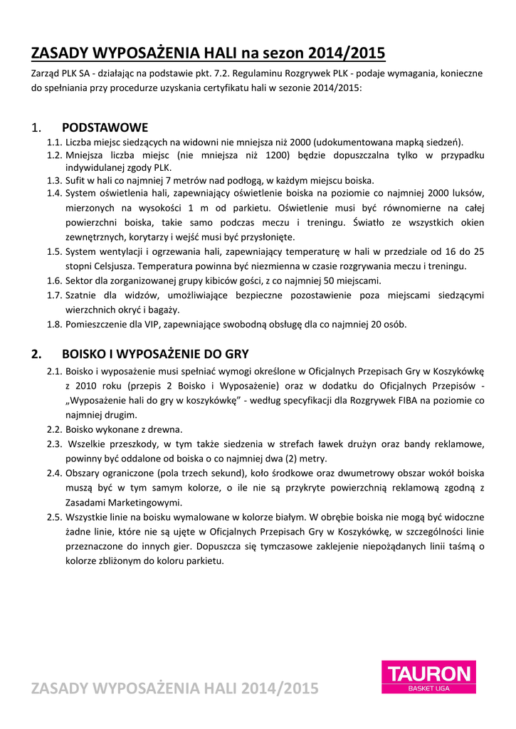 ZASADY WYPOSAŻENIA HALI na sezon 2014/2015 Zarząd PLK SA - działając na podstawie pkt. 7.2. Regulaminu Rozgrywek PLK - podaje wymagania, konieczne do spełniania przy procedurze uzyskania certyfikatu hali w sezonie 2014/2015: 1. PODSTAWOWE 1.1. Liczba miejsc siedzących na widowni nie mniejsza niż 2000 (udokumentowana mapką siedzeń). 1.2. Mniejsza liczba miejsc (nie mniejsza niż 1200) będzie dopuszczalna tylko w przypadku indywidulanej zgody PLK. 1.3. Sufit w hali co najmniej 7 metrów nad podłogą, w każdym miejscu boiska. 1.4. System oświetlenia hali, zapewniający oświetlenie boiska na poziomie co najmniej 2000 luksów, mierzonych na wysokości 1 m od parkietu. Oświetlenie musi być równomierne na całej powierzchni boiska, takie samo podczas meczu i treningu. Światło ze wszystkich okien zewnętrznych, korytarzy i wejść musi być przysłonięte. 1.5. System wentylacji i ogrzewania hali, zapewniający temperaturę w hali w przedziale od 16 do 25 stopni Celsjusza. Temperatura powinna być niezmienna w czasie rozgrywania meczu i treningu. 1.6. Sektor dla zorganizowanej grupy kibiców gości, z co najmniej 50 miejscami. 1.7. Szatnie dla widzów, umożliwiające bezpieczne pozostawienie poza miejscami siedzącymi wierzchnich okryć i bagaży. 1.8. Pomieszczenie dla VIP, zapewniające swobodną obsługę dla co najmniej 20 osób. 2. BOISKO I WYPOSAŻENIE DO GRY 2.1. Boisko i wyposażenie musi spełniać wymogi określone w Oficjalnych Przepisach Gry w Koszykówkę z 2010 roku (przepis 2 Boisko i Wyposażenie) oraz w dodatku do Oficjalnych Przepisów „Wyposażenie hali do gry w koszykówkę” - według specyfikacji dla Rozgrywek FIBA na poziomie co najmniej drugim. 2.2. Boisko wykonane z drewna. 2.3. Wszelkie przeszkody, w tym także siedzenia w strefach ławek drużyn oraz bandy reklamowe, powinny być oddalone od boiska o co najmniej dwa (2) metry. 2.4. Obszary ograniczone (pola trzech sekund), koło środkowe oraz dwumetrowy obszar wokół boiska muszą być w tym samym kolorze, o ile nie są przykryte powierzchnią reklamową zgodną z Zasadami Marketingowymi. 2.5. Wszystkie linie na boisku wymalowane w kolorze białym. W obrębie boiska nie mogą być widoczne żadne linie, które nie są ujęte w Oficjalnych Przepisach Gry w Koszykówkę, w szczególności linie przeznaczone do innych gier. Dopuszcza się tymczasowe zaklejenie niepożądanych linii taśmą o kolorze zbliżonym do koloru parkietu. ZASADY WYPOSAŻENIA HALI 2014/2015 2.6. Dwa jednakowe kosze najazdowe z tablicami do gry w koszykówkę posiadającymi aktualny atest FIBA. 2.7. Zapasowa tablica do gry w koszykówkę i zapasowa obręcz z siatką do gry w koszykówkę. 3. ŁAWKI I STOLIKI 3.1. Stolik sędziowski o długości co najmniej 5 metrów, zapewniający dogodne warunki pracy dla pięciu osób (sekretarz, asystent sekretarza, komisarz PLK, mierzący czas gry, mierzący czas 24 s.). W razie użycia band reklamowych o wysokości 100 cm lub wyższych przed stolikiem, stolik należy umieścić na odpowiednim podwyższeniu, tak aby zza stolika widoczne było całe boisko. 3.2. Ławki drużyn (ławki z oparciem lub krzesełka) powinny być umiejscowione po tej samej stronie, co stolik sędziowski, i zapewnić miejsce dla czternastu (14) osób. 3.3. Krzesełka lub inne elementy do siedzenia dla zmienników, po dwa z obu stron stolika sędziowskiego, umieszczone poza strefą 2 metrów. 3.4. Stanowisko dla spikera zawodów, umiejscowione w pobliżu stolika sędziowskiego, ale od niego oddzielone, zapewniające dogodne warunki pracy dla co najmniej jednej osoby. 3.5. Stanowisko statystyczne, umiejscowione w pobliżu stolika sędziowskiego, ale od niego oddzielone, zapewniające dogodne warunki pracy dla dwóch osób, wyposażone w komputer o wymaganiach minimalnych określonych przez firmę, z którą PLK ma umowę na obsługę statystyk, skaner formatu A4, drukarkę (o możliwościach drukowania minimum 20 stron na minutę) oraz co najmniej dwa niezależne systemy łączenia się z internetem - szerokopasmowy DSL-ISDN lub WiFi oraz awaryjny mobilny (BlueConnect, iPlus, Orange Free lub podobny). 4. ZEGARY I TABLICE 4.1. Dwie tablice wyników, wyświetlające wynik meczu, liczbę fauli drużynowych w kwarcie, wykorzystane przerwy na żądanie i odmierzające czas przerwy na żądanie. Co najmniej jedna z tablic powinna wyświetlać zdobyte punkty i popełnione faule poszczególnych zawodników wraz z właściwą numeracją (wyłącznie taką, jak w protokole meczu). Doskonale widoczne z każdego miejsca boiska, ławek rezerwowych i stolika sędziowskiego. 4.2. Zegar główny zawodów i zegar zapasowy, odmierzające co najmniej ostatnią minutę z dokładnością do 0,1 sekundy. Doskonale widoczne z każdego miejsca boiska, ławek rezerwowych i stolika sędziowskiego. 4.3. Działające zgodnie z Oficjalnymi Przepisami Gry w Koszykówkę dwa zegary do pomiaru czasu 24 sekund, znajdujące się nad tablicą kosza, czterostronne lub trójstronne, pokazujące jednocześnie czas główny zawodów i wyposażone w lampkę czerwoną, zapalającą się w momencie jego zatrzymania i przekroczenia czasu 24 s. Kolory cyfr czasu zawodów i czasu 24 sekund powinny być różne. 4.4. Zapasowy zegar 24 sekund. 4.5. Wskaźniki fauli zawodników, z wymalowanymi cyframi (1-5) o wysokości 20 cm. 4.6. Wskaźniki fauli drużyny. ZASADY WYPOSAŻENIA HALI 2014/2015 4.7. Wskaźnik naprzemiennego posiadania piłki, z przełącznikiem na pulpicie stolika sędziowskiego i sygnalizacją widoczną przez sędziów stolikowych i Komisarza PLK. 4.8. Dwa stopery ręczne, jako rezerwa na wypadek awarii. 4.9. Dwa oddzielne, wyraźnie odmienne, głośne i dobrze słyszalne w każdym punkcie boiska i ławek rezerwowych sygnały dźwiękowe, pierwszy dla sekretarza i mierzącego czas gry, drugi dla mierzącego czas 24 sekund. Minimalna głośność - 120 DBA, mierzonych na wysokości 1 m od parkietu. Sygnały powinny być połączone z systemem nag