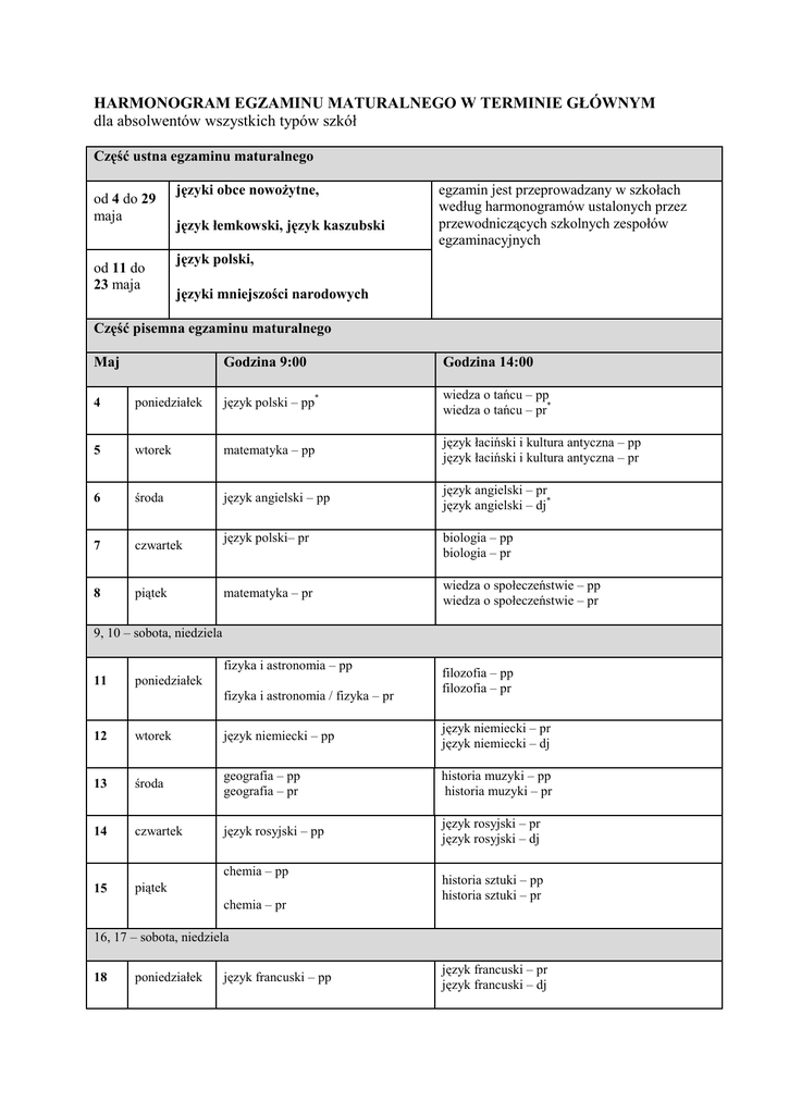 HARMONOGRAM EGZAMINU MATURALNEGO W TERMINIE GŁÓWNYM dla absolwentów wszystkich typów szkół Część ustna egzaminu maturalnego od 4 do 29 maja od 11 do 23 maja języki obce nowożytne, język łemkowski, język kaszubski egzamin jest przeprowadzany w szkołach według harmonogramów ustalonych przez przewodniczących szkolnych zespołów egzaminacyjnych język polski, języki mniejszości narodowych Część pisemna egzaminu maturalnego Maj Godzina 9:00 Godzina 14:00 4 poniedziałek język polski – pp* wiedza o tańcu – pp wiedza o tańcu – pr* 5 wtorek matematyka – pp język łaciński i kultura antyczna – pp język łaciński i kultura antyczna – pr 6 środa język angielski – pp język angielski – pr język angielski – dj* 7 czwartek 8 piątek język polski– pr matematyka – pr biologia – pp biologia – pr wiedza o społeczeństwie – pp wiedza o społeczeństwie – pr 9, 10 – sobota, niedziela fizyka i astronomia – pp 11 poniedziałek fizyka i astronomia / fizyka – pr filozofia – pp filozofia – pr 12 wtorek język niemiecki – pp język niemiecki – pr język niemiecki – dj 13 środa geografia – pp geografia – pr historia muzyki – pp historia muzyki – pr 14 czwartek język rosyjski – pp język rosyjski – pr język rosyjski – dj 15 piątek chemia – pp chemia – pr historia sztuki – pp historia sztuki – pr 16, 17 – sobota, niedziela 18 poniedziałek język francuski – pp język francuski – pr język francuski – dj 19 informatyka – pp historia – pp informatyka – pr historia – pr wtorek język hiszpański – pr 20 środa język hiszpański – pp język hiszpański – dj język włoski – pr 21 czwartek język włoski – pp język włoski – dj języki mniejszości narodowych – pp język kaszubski – pp język kaszubski – pr języki mniejszości narodowych – pr język łemkowski – pp język łemkowski – pr 22 piątek godz. 9:00 – matematyka w języku obcym dla absolwentów oddziałów dwujęzycznych (pp)** godz. 10:35 – historia w języku obcym dla absolwentów oddziałów dwujęzycznych (pr) ** godz. 12:10 – geografia w języku obcym dla absolwentów oddziałów dwujęzycznych (pr) ** godz. 13:45 – biologia w języku obcym dla absolwentów oddziałów dwujęzycznych (pr) ** godz. 15:20 – chemia w języku obcym dla absolwentów oddziałów dwujęzycznych (pr) ** godz. 16:55 – fizyka i astronomia / fizyka w języku obcym dla absolwentów oddziałów dwujęzycznych (pr)** * pp – poziom podstawowy; pr – poziom rozszerzony; dj – poziom dwujęzyczny ** Dodatkowe zadania egzaminacyjne w języku obcym z biologii, chemii, fizyki i astronomii / fizyki, geografii, historii, matematyki mogą rozwiązywać absolwenci oddziałów dwujęzycznych, w których przedmioty te były nauczane w języku obcym nowożytnym. HARMONOGRAM EGZAMINU MATURALNEGO W TERMINIE DODATKOWYM* dla zdających (absolwentów wszystkich typów szkół), którzy uzyskali zgodę dyrektora okręgowej komisji egzaminacyjnej na przystąpienie do egzaminu maturalnego w dodatkowym terminie Część ustna egzaminu maturalnego od 1 do 17 czerwca od 8 do 13 czerwca języki obce nowożytne, język łemkowski, język kaszubski język polski, egzamin jest przeprowadzany w szkołach według harmonogramów ustalonych przez przewodniczących szkolnych zespołów egzaminacyjnych języki mniejszości narodowych Część pisemna egzaminu maturalnego Czerwiec Godzina 9:00 Godzina 14:00 1 poniedziałek język polski – pp** język polski – pr** 2 wtorek matematyka – pp matematyka – pr 3 środa język angielski – pp język angielski – pr język angielski – dj** 4 – czwartek 5 piątek wiedza o społeczeństwie – pp, pr fizyka i astronomia – pp, pr / fizyka – pr język łaciński i kultura antyczna – pp, pr wiedza o tańcu – pp, pr 6, 7 – sobota, niedziela 8 poniedziałek biologia – pp, pr filozofia – pp, pr historia muzyki – pp, pr historia sztuki – pp, pr 9 wtorek język niemiecki – pp język niemiecki – pr język niemiecki – dj 10 środa chemia – pp, pr geografia – pp, pr przedmioty zdawane w języku obcym*** język rosyjski – pr 11 czwartek język rosyjski – pp język rosyjski – dj 12 piątek 13, 14 – sobota, niedziela informatyka – pp, pr historia – pp, pr język francuski – pr 15 poniedziałek język francuski pp język francuski – dj języki mniejszości narodowych – pp języki mniejszości narodowych – pr język kaszubski – pp, pr 16 wtorek język łemkowski – pp, pr język hiszpański – pp język hiszpański – pr język hiszpański – dj język włoski – pr 17 środa język włoski – pp język włoski – dj * Informacja o miejscach egzaminu zostanie umieszczona na stronie internetowej właściwej okręgowej komisji egzaminacyjnej w ostatnim tygodniu maja 2015 r. ** pp – poziom podstawowy; pr – poziom rozszerzony; dj – poziom dwujęzyczny *** Dodatkowe zadania egzaminacyjne w języku obcym z biologii, chemii, fizyki i astronomii / fizyki, geografii, historii, matematyki mogą rozwiązywać absolwenci oddziałów dwujęzycznych, w których przedmioty te były nauczane w języku obcym nowożytnym. Przekazanie przez okręgowe komisje egzaminacyjne świadectw do szkół – 30 czerwca 2015 r. (data wydania świadectw dojrzałości i aneksów do świadectw dojrzałości z egzaminu maturalnego przeprowadzanego w maju i w czerwcu: 30 czerwca 2015 r.). HARMONOGRAM EGZAMINU MATURALNEGO W TERMINIE POPRAWKOWYM* dla zdających (absolwentów wszystkich typów szkół), którzy przystąpili do egzaminu maturalnego ze wszystkich przedmiotów obowiązkowych i nie zdali egzaminu tylko z jednego przedmiotu w części ustnej albo w części pisemnej 1. Część pisemna – 25 sierpnia 2015 r. (wtorek), godz. 9:00 2. Część ustna (język polski, języki mniejszości narodowych, języki obce nowożytne) – 24– 28 sierpnia 2015 r. * Informacja o miejscu egzaminu i