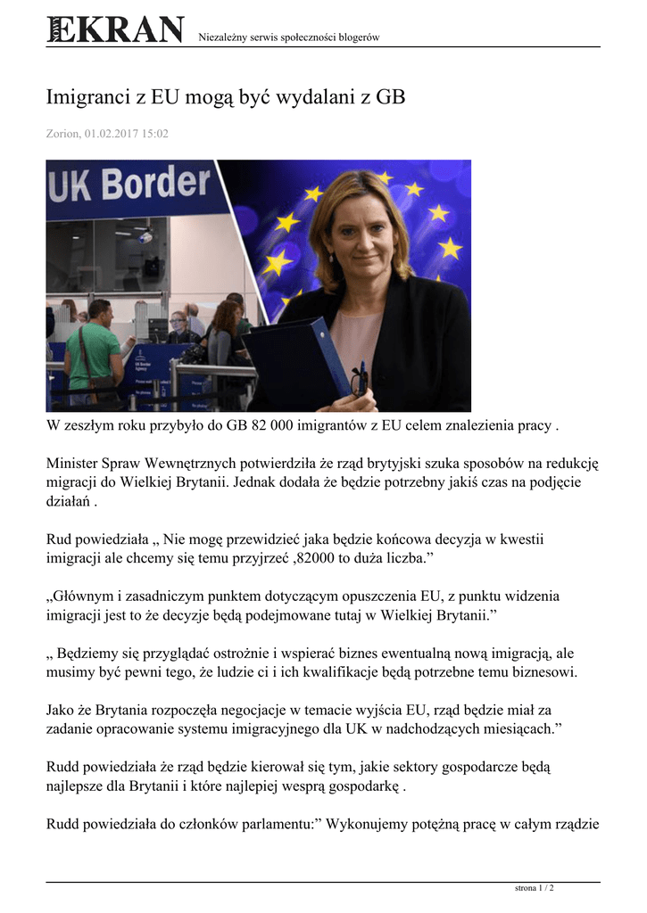 Niezależny serwis społeczności blogerów Imigranci z EU mogą być wydalani z GB Zorion, 01.02.2017 15:02 W zeszłym roku przybyło do GB 82 000 imigrantów z EU celem znalezienia pracy . Minister Spraw Wewnętrznych potwierdziła że rząd brytyjski szuka sposobów na redukcję migracji do Wielkiej Brytanii. Jednak dodała że będzie potrzebny jakiś czas na podjęcie działań . Rud powiedziała „ Nie mogę przewidzieć jaka będzie końcowa decyzja w kwestii imigracji ale chcemy się temu przyjrzeć ,82000 to duża liczba.” „Głównym i zasadniczym punktem dotyczącym opuszczenia EU, z punktu widzenia imigracji jest to że decyzje będą podejmowane tutaj w Wielkiej Brytanii.” „ Będziemy się przyglądać ostrożnie i wspierać biznes ewentualną nową imigracją, ale musimy być pewni tego, że ludzie ci i ich kwalifikacje będą potrzebne temu biznesowi. Jako że Brytania rozpoczęła negocjacje w temacie wyjścia EU, rząd będzie miał za zadanie opracowanie systemu imigracyjnego dla UK w nadchodzących miesiącach.” Rudd powiedziała że rząd będzie kierował się tym, jakie sektory gospodarcze będą najlepsze dla Brytanii i które najlepiej wesprą gospodarkę . Rudd powiedziała do członków parlamentu:” Wykonujemy potężną pracę w całym rządzie strona 1 / 2 Niezależny serwis społeczności blogerów aby zagwarantować systemy potrzebne dla biznesu w różnych obszarach i różnych regionach.” „ Możemy mieć kontrolę nad decyzjami które podejmujemy, w terminach które chcielibyśmy osiągnąć i poziomie umiejętności jakich będziemy wymagać” Oświadczenie biura Brexit Alliance; ”Proponujemy dwa zbliżenia post Brexitowej polityki w temacie imigracji . Po pierwsze, uważamy że rząd powinien rozważyć kwestię imigracji poprzez określenie rzeczywistych potrzeb dla gospodarki co dałoby wytyczne dla polityki imigracyjnej.” „Po drugie proponujemy aby rząd określił rozmiar tej potrzeby a następnie rozważył możliwość spożytkowania obecnych nadwyżek imigracyjnych . ” http://www.express.co.uk/news/uk/761530/britain-brexit-border strona 2 / 2 Powered by TCPDF (www.tcpdf.org)