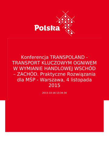 Konferencja TRANSPOLAND TRANSPORT KLUCZOWYM OGNIWEM W WYMIANIE HANDLOWEJ WSCHÓD – ZACHÓD. Praktyczne Rozwiązania dla MŚP - Warszawa, 4 listopada 2015 2015-10-16 13:34:34 2 3 4 listopada 2015 odbędzie się w Warszawie konferencja TRANS POLAND 2015. TRANSPORT KLUCZOWYM OGNIWEM W WYMIANIE HANDLOWEJ WSCHÓD – ZACHÓD. Praktyczne Rozwiązania dla Małych i Średnich Przedsiębiorstw. Konferencja jest adresowana do MŚP zainteresowanych rozpoczęciem lub już prowadzących wymianę handlową ze Wschodem (Rosja, Białoruś, Ukraina, Kazachstan). 4 listopada 2015 odbędzie się w Warszawie konferencja TRANS POLAND 2015. TRANSPORT KLUCZOWYM OGNIWEM W WYMIANIE HANDLOWEJ WSCHÓD – ZACHÓD. Praktyczne Rozwiązania dla Małych i Średnich Przedsiębiorstw. Konferencja jest adresowana do MŚP zainteresowanych rozpoczęciem lub już prowadzących wymianę handlową ze Wschodem (Rosja, Białoruś, Ukraina, Kazachstan). Organizatorzy dodatkowo przewidzieli Punkty / Stoliki Konsultacji Handlowych dla wymienionych rynków. Wezmą w nich udział przedstawiciele spedytorów, instytucji certyfikujących dopuszczenie produktów do obrotu na poszczególnych rynkach, dużych i średnich firm logistycznych oraz specjalistów z zakresu ceł, którzy na miejscu udzielać będą praktycznych porad uczestnikom Konferencji. To rzadka okazja by zainteresowany przedsiębiorca mógł skorzystać z takiej bezpośredniej formy pozyskania informacji. Konferencja ta ma charakter niekomercyjny i będzie towarzyszyć III edycji Międzynarodowych Targów Transportu i Logistyki - TransPoland (4-6 listopada br.), odbywających się na Expo XXI. ul. Prądzyńskiego 12/14. Wstęp na konferencję jest bezpłatny po wcześniejszej rejestracji. Więcej Informacji: http://trans-poland.pl/transport-wschod-zachod/ WEST-EAST TRADE EXCHANGE November 4th, 2015 a conference is going to be held in Warsaw. TRANS POLAND 2015. TRANSPORT AS A KEY LINK IN EAST - WEST TRADE EXCHANGE: Useful solutions for Small and Medium-sized Enterprises The conference addresses SME’s either interested in East-West Trade Exchange or already present on eastern markets (Russia, Belarus, Kazakhstan, Ukraine). Along the conference, the organizers have appointed Trade Exchange Consultation Points for those markets. The entrepreneurs will have a chance to meet representatives of accredited certifiers , big and medium-sized logistics operators and customs brokers, who are going to provide useful and practical information on pointed markets. It constitutes a unique opportunity to grasp specific know-how and business knowledge. The conference is a non-profit event held alongside the 3rd edition of TransPoland - International Transport and Logistics Exhibition in Warsaw (4-6 November 2015, EXPO XXI, 12/14 Pradzynskiego Street, Warsaw). Free admission upon previous registration. More information: http://trans-poland.pl/east-west-trade-exchange/ 4