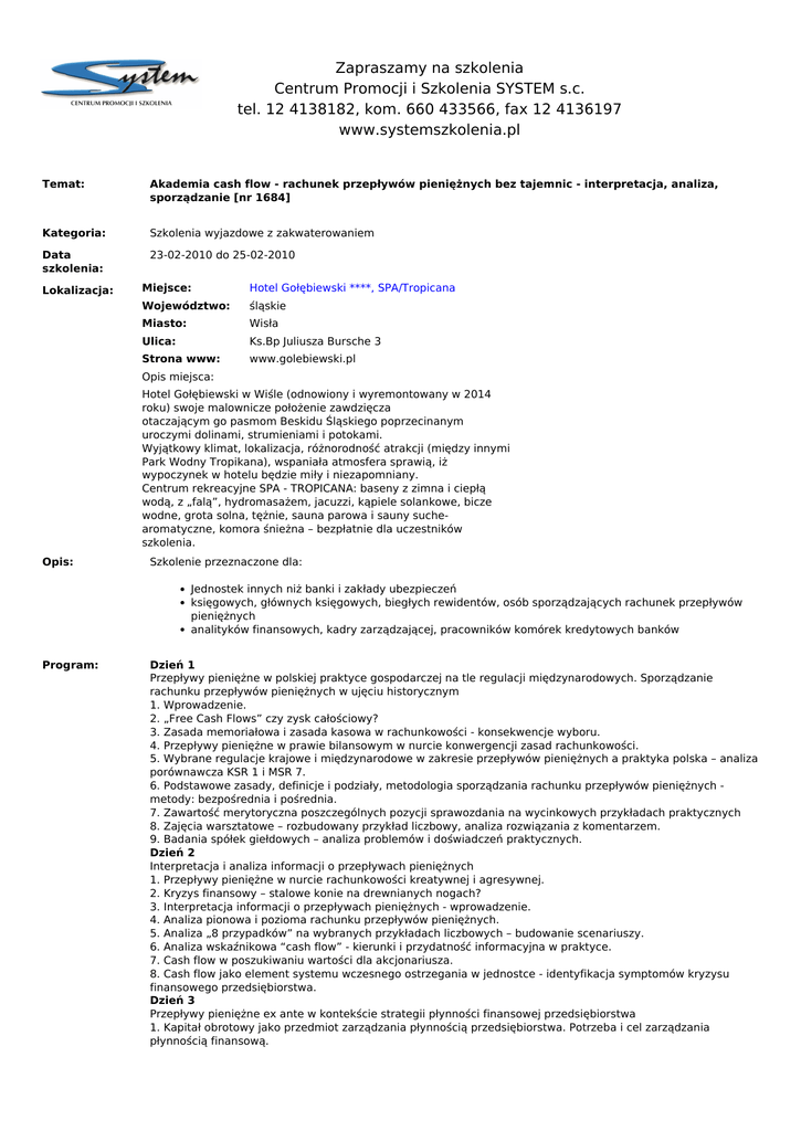 Zapraszamy na szkolenia Centrum Promocji i Szkolenia SYSTEM s.c. tel. 12 4138182, kom. 660 433566, fax 12 4136197 www.systemszkolenia.pl Temat: Akademia cash flow - rachunek przepływów pieniężnych bez tajemnic - interpretacja, analiza, sporządzanie [nr 1684] Kategoria: Szkolenia wyjazdowe z zakwaterowaniem Data szkolenia: 23-02-2010 do 25-02-2010 Lokalizacja: Miejsce: Hotel Gołębiewski ****, SPA/Tropicana Miejsce: Hotel Gołębiewski ****, SPA/Tropicana Województwo: śląskie Województwo: śląskie Miasto: Wisła Miasto: Wisła Ulica: Ulica: Strona www: Strona www: Ks.Bp Juliusza Bursche 33 Ks.Bp Juliusza Bursche www.golebiewski.pl www.golebiewski.pl Opis miejsca: Opis miejsca: Hotel Gołębiewski ww Wiśle (odnowiony i wyremontowany ww 2014 Hotel Gołębiewski Wiśle (odnowiony i wyremontowany 2014 roku) swoje malownicze położenie zawdzięcza roku) swoje malownicze położenie zawdzięcza otaczającym gogo pasmom Beskidu Śląskiego poprzecinanym otaczającym pasmom Beskidu Śląskiego poprzecinanym uroczymi dolinami, strumieniami i potokami. uroczymi dolinami, strumieniami i potokami. Wyjątkowy klimat, lokalizacja, różnorodność atrakcji (między innymi Wyjątkowy klimat, lokalizacja, różnorodność atrakcji (między innymi Park Wodny Tropikana), wspaniała atmosfera sprawią, iż iż Park Wodny Tropikana), wspaniała atmosfera sprawią, wypoczynek ww hotelu będzie miły i niezapomniany. wypoczynek hotelu będzie miły i niezapomniany. Centrum rekreacyjne SPA - TROPICANA: baseny z zimna i ciepłą Centrum rekreacyjne SPA - TROPICANA: baseny z zimna i ciepłą wodą, z „falą”, hydromasażem, jacuzzi, kąpiele solankowe, bicze wodą, z „falą”, hydromasażem, jacuzzi, kąpiele solankowe, bicze wodne, grota solna, tężnie, sauna parowa i sauny suchewodne, grota solna, tężnie, sauna parowa i sauny suchearomatyczne, komora śnieżna – bezpłatnie dla uczestników aromatyczne, komora śnieżna – bezpłatnie dla uczestników szkolenia. szkolenia. Opis: Szkolenie przeznaczone dla: Jednostek innych niż banki i zakłady ubezpieczeń księgowych, głównych księgowych, biegłych rewidentów, osób sporządzających rachunek przepływów pieniężnych analityków finansowych, kadry zarządzającej, pracowników komórek kredytowych banków Program: Dzień 1 Przepływy pieniężne w polskiej praktyce gospodarczej na tle regulacji międzynarodowych. Sporządzanie rachunku przepływów pieniężnych w ujęciu historycznym 1. Wprowadzenie. 2. „Free Cash Flows” czy zysk całościowy? 3. Zasada memoriałowa i zasada kasowa w rachunkowości - konsekwencje wyboru. 4. Przepływy pieniężne w prawie bilansowym w nurcie konwergencji zasad rachunkowości. 5. Wybrane regulacje krajowe i międzynarodowe w zakresie przepływów pieniężnych a praktyka polska – analiza porównawcza KSR 1 i MSR 7. 6. Podstawowe zasady, definicje i podziały, metodologia sporządzania rachunku przepływów pieniężnych metody: bezpośrednia i pośrednia. 7. Zawartość merytoryczna poszczególnych pozycji sprawozdania na wycinkowych przykładach praktycznych 8. Zajęcia warsztatowe – rozbudowany przykład liczbowy, analiza rozwiązania z komentarzem. 9. Badania spółek giełdowych – analiza problemów i doświadczeń praktycznych. Dzień 2 Interpretacja i analiza informacji o przepływach pieniężnych 1. Przepływy pieniężne w nurcie rachunkowości kreatywnej i agresywnej. 2. Kryzys finansowy – stalowe konie na drewnianych nogach? 3. Interpretacja informacji o przepływach pieniężnych - wprowadzenie. 4. Analiza pionowa i pozioma rachunku przepływów pieniężnych. 5. Analiza „8 przypadków” na wybranych przykładach liczbowych – budowanie scenariuszy. 6. Analiza wskaźnikowa “cash flow” - kierunki i przydatność informacyjna w praktyce. 7. Cash flow w poszukiwaniu wartości dla akcjonariusza. 8. Cash flow jako element systemu wczesnego ostrzegania w jednostce - identyfikacja symptomów kryzysu finansowego przedsiębiorstwa. Dzień 3 Przepływy pieniężne ex ante w kontekście strategii płynności finansowej przedsiębiorstwa 1. Kapitał obrotowy jako przedmiot zarządzania płynnością przedsiębiorstwa. Potrzeba i cel zarządzania płynnością finansową. 2. Strategie płynności finansowej w ujęciu dochód – ryzyko: - istota oraz charakterystyka rodzajów strategii płynności finansowej w ujęciu dochód – ryzyko, - procedury tworzenia oraz strategie płynności finansowej. 3. Ustalanie i budżetowanie zapotrzebowania na kapitał obrotowy: - istota kalkulacji zapotrzebowania na kapitał obrotowy metodą procentu od sprzedaży, - warianty metody procentu od sprzedaży, - problemy praktyczne metody procentu od sprzedaży oraz ujęcie podejścia „dochód – ryzyko” - metody budżetowania (planowania) kapitału obrotowego. Kapitał obrotowy – koncepcje oceny i planowania w zakresie: należności, analizy przyjętej przez przedsiębiorstwo polityki kredytowej, zapasów, zobowiązań, środków pieniężnych. - problemy prognozowania sprawozdań finansowych w warunkach ryzyka 4. Metody oceny efektywności strategii płynności finansowej: - metody analizy wskaźnikowej, ocena strategii płynności oraz wypłacalności finansowej za pomocą specjalistycznych narzędzi. Forma szkolenia: Szkolenie o powyższej tematyce możemy zrealizować na Państwa potrzeby w formie szkolenia zamkniętego. Zainteresowane osoby prosimy o kontakt z naszym biurem tel. (012) 413-81-82 Certyfikaty: tak Cena: Cena zawiera: Warunki uczestnictwa: CENA DATA REJESTRACJI 2 245.00 netto zł./osobę (2 761.35 zł. brutto) do: 13-02-2010 2 445.00 netto zł./osobę (3 007.35 zł. brutto) od: 14-02-2010 RABAT 200.00 zł./osobę Cena szkolenia: w zależności od wybranego wariantu WARIANT ekonomiczny - szkolenie 3-dniowe z dwoma noclegami Cena: 2.445 złotych / 2.245 złotych z RABATEM 200 zł. przy zgłoszeniu do dnia 13 lutego Przyjazd uczestników i zakwaterowanie: Od dnia 23 luteg
