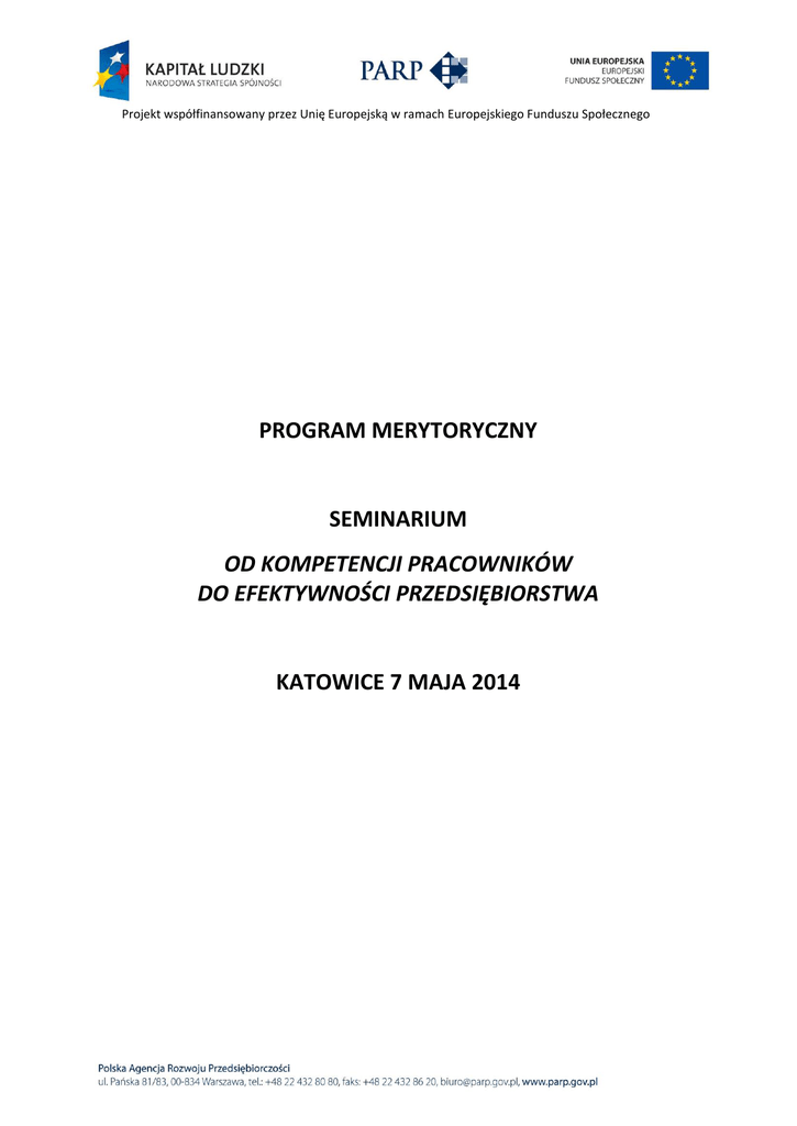 Projekt współfinansowany przez Unię Europejską w ramach Europejskiego Funduszu Społecznego PROGRAM MERYTORYCZNY SEMINARIUM OD KOMPETENCJI PRACOWNIKÓW DO EFEKTYWNOŚCI PRZEDSIĘBIORSTWA KATOWICE 7 MAJA 2014 Projekt współfinansowany przez Unię Europejską w ramach Europejskiego Funduszu Społecznego SPIS TREŚCI 1. Ramowy harmonogram seminarium ................................................................................ 3 2. Elementy networkingu podczas seminarium.................................................................... 5 3. Sesja ekspercka dot. zarządzania kompetencjami ............................................................ 7 4. Sesja ekspercka dot. employer branding.......................................................................... 9 5. Sesja case study ............................................................................................................. 10 6. Panel dyskusyjny ............................................................................................................ 12 Projekt współfinansowany przez Unię Europejską w ramach Europejskiego Funduszu Społecznego 1. Ramowy harmonogram seminarium Godziny Od kompetencji pracowników do efektywności przedsiębiorstwa Rejestracja & networking Ekspert ds. networkingu Wprowadzenie organizacyjne i merytoryczne Moderator 9.30 – 9.40 Informacje o projekcie „Zarządzanie kompetencjami w MSP” Przedstawiciel Polskiej Agencji Rozwoju Przedsiębiorczości 9:40 – 10:55 SESJA EKSPERCKA 1: Efektywność pracowników z perspektywy kompetencyjnej Ekspert merytoryczny ds. zarządzania przez kompetencje – Monika Ziaja Czym dla organizacji jest wdrożenie modelu kompetencyjnego – podstawowe definicje, cele i metody Paradygmat efektywności z perspektywy zarządzania kompetencjami Uwarunkowania efektywności pracowników, zespołów i organizacji Znaczenie kompetencji w podnoszeniu efektywności Kiedy rozwój kompetencji przyczynia się do wzrostu efektywności Przerwa kawowa & networking 10:55 - 11:20 Ekspert ds. networkingu 11:20 - 12:00 SESJA EKSPERCKA 2: Budowanie marki pracodawcy (Employer Branding) na bazie polityki zarządzania zasobami ludzkimi Ekspert merytoryczny ds. employer branding – Joanna Piec-Gajewska, Kobold Public Relations Kogo cenią pracownicy i dlaczego? Korzyści z pozytywnego wizerunku firmy na rynku pracy Co można zrobić, aby być (najbardziej) pożądanym pracodawcą - proste działania, wymierne efekty Wykorzystanie inicjatyw regionalnych i ponadregionalnych dla budowania marki firmy jako pracodawcy 12.00 - 12.50 SESJA 3: W tym szaleństwie jest metoda - nieszablonowe rozwiązania employer brandingowe w JCommerce Przedsiębiorca – Jcommerce S.A, Katarzyna Musialska, HR Business Partner Narzędzia komunikacji wewnętrznej: newslettery, blogi pracownicze itp. Materiały dla nowych pracowników Jak budować ogłoszenia rekrutacyjne Jak budować i prowadzić profil pracodawcy / jak promować markę pracodawcy 8.30 – 9.30 Projekt współfinansowany przez Unię Europejską w ramach Europejskiego Funduszu Społecznego 12.50 - 13.40 SESJA 4: Case study Przerwa kawowa & networking Ekspert ds. networkingu 14:05 - 15:00 PANEL DYSKUSYJNY 5: Rozwój kompetencji pracowników: potrzeby vs. realne możliwości Wnioski z badań dotyczących potrzeb pracodawców w zakresie kompetencji pracowników (wykorzystanie m.in. wyników takich badań jak: Bilans Kapitału Ludzkiego i inne) Specyfika rynku lokalnego – kogo potrzebujemy a kogo mamy Jak lepiej przygotować potencjalnych pracowników do pełnienia swoich ról w organizacji Rola pracodawców, instytucji wspierających i edukacyjnych oraz firm doradczo – szkoleniowych 13:40 - 14:05 Moderator Ekspert merytoryczny ds. zarządzania przez kompetencje – Monika Ziaja Ekspert merytoryczny ds. employer branding – Joanna Piec-Gajewska, Kobold Public Relations Ekspert ds. networkingu – Artur Hofman Ekspert regionalny – Agata Hagno, Dyrektor Zarządzający, DPM Sp. z o.o. Przedsiębiorca – Jcommerce S.A, Katarzyna Musialska, HR Business Partner Przedsiębiorca 15:00 - 15:15 Podsumowanie i zakończenie Moderator Obiad i networking 15:15 - 16:30 Ekspert ds. networkingu Projekt współfinansowany przez Unię Europejską w ramach Europejskiego Funduszu Społecznego 2. Elementy networkingu podczas seminarium Podczas seminarium będą wykorzystywane elementy networkingu służące integracji i nawiązywaniu kontaktów między uczestnikami. Celem networkingu będzie: - pomoc uczestnikom "przełamać lody" czyli bezpiecznie wyjść ze swojej strefy komfortu i nawiązać wartościowe kontakty, - wsparcie w nawiązywaniu rozmów - przedstawianie się innym uczestnikom, wymiana wiedzy i doświadczenia, - połączenie osób, które niejednokrotnie są trochę zagubione, ponieważ nie mają znajomych wśród profesjonalistów na seminarium. Prosimy uczestników o zabranie ze sobą na seminarium ok. 60-70 wizytówek. Wizytówki służą do szybkiego i sprawnego przekazania sobie podstawowych danych kontaktowych. Są nośnikiem informacji. W czasie konferencji rozmawiać będziemy z wieloma osobami. Wizytówka ułatwia nam zapamiętanie i kojarzenie poznanej osoby. Na wizytówce możemy też zrobić krótką notatkę. Po seminarium warto wysłać e-mail z podziękowaniem za rozmowę. Jeżeli działamy w organizacjach zrzeszających specjalistów podobnych do poznanego rozmówcy, wówczas warto poinformować poznaną osobę o spotkaniach otwartych swojej organizacji. Podczas każdej sesji będziemy zachęcać wszystkich uczestników seminarium do zmiany swoich miejsc, tak aby każdy uczestnik mógł poznać jak najwięcej nowych osób celem wymiany swojej wiedzy i doświadczenia. Dodatkowo wszyscy uczestnicy otrzymają identyfikatory z widocznym nadrukiem imienia i nazwiska, firmy oraz zajmowanego stanowiska, dzięki tym podstawowym informacjom uczestnikom będzie łatwiej nawiązać rozmowę. Projekt współfinansowany przez Uni
