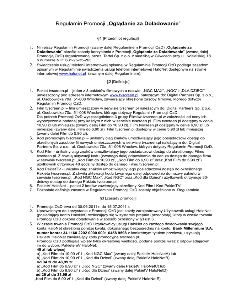 Regulamin Promocji „Oglądanie za Doładowanie” §1 [Przedmiot regulacji] 1. Niniejszy Regulamin Promocji (zwany dalej Regulaminem Promocji OzD) „Oglądanie za 2. Doładowanie” określa zasady korzystania z Promocji „Oglądanie za Doładowanie” (zwaną dalej Promocją OzD) organizowanej przez Tartel Sp. z o.o. z siedzibą w Gliwicach przy ul. Kozielskiej 18 o numerze NIP: 631-25-35-263. Świadczenie usługi telefonii internetowej opisanej w Regulaminie Promocji OzD podlega zasadom opisanym w Regulaminie świadczenia usługi telefonii internetowej HaloNet dostępnym na stronie internetowej www.halonet.pl (zwanym dalej Regulaminem). §2 [Definicje] 1. Pakiet tvscreen.pl – jeden z 3 pakietów filmowych o nazwie: „NGC MAX”, „NGC” i „DLA DZIECI” umieszczony pod adresem internetowym www.tvscreen.pl należącym do: Digital Partners Sp. z o.o., ul. Osobowicka 70a, 51-008 Wrocław, zawierający określone zasoby filmowe, którego dotyczy Regulamin Promocji OzD. 2. Film tvscreen.pl – film umieszczony w serwisie tvscreen.pl należącym do: Digital Partners Sp. z o.o., ul. Osobowicka 70a, 51-008 Wrocław, którego dotyczy Regulamin Promocji OzD. Dla potrzeb Promocji OzD wyszczególniono 3 grupy Filmów tvscreen.pl w zależności od ceny ich wypożyczenia podanej przy każdym z nich w serwisie tvscreen.pl. Film tvscreen.pl dostępny w cenie 10,90 zł lub mniejszej (zwany dalej Film do 10,90 zł). Film tvscreen.pl dostępny w cenie 6,90 zł lub mniejszej (zwany dalej Film do 6,90 zł). Film tvscreen.pl dostępny w cenie 5,90 zł lub mniejszej (zwany dalej Film do 5,90 zł). 3. Kod promocyjny tvscreen.pl – unikalny ciąg znaków umożliwiający jego posiadaczowi dostęp do określonych zasobów filmowych umieszczonych w serwisie tvscreen.pl należącym do: Digital Partners Sp. z o.o., ul. Osobowicka 70a, 51-008 Wrocław, których dotyczy Regulamin Promocji OzD. 4. Kod Film - unikalny ciąg znaków umożliwiający jego posiadaczowi dostęp do określonego Filmu tvscreen.pl. Z chwilą aktywacji kodu (zwanego dalej odpowiednio do cen za dostęp do danego filmu w serwisie tvscreen.pl „Kod Film do 10,90 zł”, „Kod Film do 6,90 zł” oraz „Kod Film do 5,90 zł”) użytkownik otrzymuje 48 godziny dostęp do danego Filmu tvscreen.pl. 5. Kod PakietTV - unikalny ciąg znaków umożliwiający jego posiadaczowi dostęp do określonego Pakietu tvscreen.pl. Z chwilą aktywacji kodu (zwanego dalej odpowiednio do nazwy pakietu w serwisie tvscreen.pl: „Kod NGC Max”, „Kod NGC” oraz „Kod dla Dzieci”) użytkownik otrzymuje 30dniowy dostęp do danego Pakietu tvscreen.pl. 6. PakietV HaloNet – pakiet 2 kodów zawierający określony Kod Film i Kod PakietTV. 7. Pozostałe definicje zawarte w Regulaminie Promocji OzD zostały objaśnione w Regulaminie. §3 [Zasady promocji] 1. Promocja OzD trwa od 30.06.2011 r. do 15.07.2011 r. 2. Uprawnionym do korzystania z Promocji OzD jest każdy zarejestrowany Użytkownik usługi HaloNet (posiadający konto HaloNet) rozliczający się w systemie prepaid (przedpłaty), który w czasie trwania Promocji OzD dokona doładowania w sposób określony w §3 ust.3. 3. W czasie trwania Promocji OzD Użytkownicy usługi HaloNet do każdego doładowania swojego konta HaloNet określoną poniżej kwotą, dokonanego bezpośrednio na konto: Bank Millennium S.A. numer konta: 34 1160 2202 0000 0001 6458 9598 z konkretnym tytułem przelewu, uzyskają PakietV HaloNet zawierający kody promocyjne tvscreen.pl. Promocji OzD podlegają wpłaty tylko określonej wielkości, podane poniżej wraz z odpowiadającym im do wyboru PakietemV HaloNet: 49 zł lub więcej a) „Kod Film do 10,90 zł” i „Kod NGC Max” (zwany dalej PakietV HaloNetA) lub b) „Kod Film do 10,90 zł” i „Kod dla Dzieci” (zwany dalej PakietV HaloNetB) od 34 zł do 48,99 zł a) „Kod Film do 6,90 zł” i „Kod NGC” (zwany dalej PakietV HaloNetC) lub b) „Kod Film do 6,90 zł” i „Kod dla Dzieci” (zwany dalej PakietV HaloNetD) od 29 zł do 33,99 zł „Kod Film do 5,90 zł” i „Kod dla Dzieci” (zwany dalej PakietV HaloNetE) 4. Konkretny tytuł przelewu, o którym mowa w §3 ust. 3, powinien zawierać nazwę Profilu użytkownika HaloNet oraz nazwę konkretnego wybranego pakietuV HaloNet, odpowiadającego dokonanej wpłacie. Przykładowo: prawidłowy tytuł przelewu dla użytkownika, którego nazwa profilu to „Nowak” a dokonana wpłata to 49 zł powinien brzmieć „Nowak PakietV HaloNetA” lub (jeśli wybór dotyczy PakietV HaloNetB) „Nowak PakietV HaloNetB”. 5. Realizacja doładowania na podane konto z określonym tytułem przelewu, o których mowa w §3 ust. 3, jest jednoznaczna z zapoznaniem się i przyjęciem warunków Regulaminu Promocji OzD. 6. Doładowanie, o którym mowa w §3 ust.3, może być wykorzystane na dowolne usługi telekomunikacyjne dostępne w ramach HaloNet. 7. Za datę doładowania, o którym mowa §3 ust.2, uznaje się datę zarejestrowania konkretnej kwoty doładowania na podanym w §3 ust. 3 koncie bankowym. 8. Pakiet HaloNetV zostanie przesłany na odpowiadający danemu Profilowi Użytkownika HaloNet adres e-mail w ciągu 48 godzin (dotyczy dni roboczych) od daty doładowania, o której mowa w §3 ust. 7. 9. Ilość doładowań, o których mowa w §3 ust.2, zrealizowanych przez konkretnego Użytkownika usługi HaloNet nie podlega ograniczeniom. Każde doładowanie spełniające wymogi określone w §3 ust. 3 nadaje danemu Użytkownikowi usługi HaloNet uprawnienia do skorzystania z Promocji OzD. §4 [Zasady korzystania z kodów] 1. Kod z każdego PakietuV HaloNet musi zostać aktywowany nie później niż 31.08.2011 r. 2. Przez aktywację kodu rozumie się zalogowanie w serwisie tvscreen.pl, następnie wybór konkretnego zasobu filmowego i jego odtworzenie przy użycie kodu promocyjnego z PakietuV HaloNet Szczegóły dotyczące aktywacji danego kodu są dostępne pod adresem internetowym: http://www.halonet.pl/promocje/ogladanie-za-