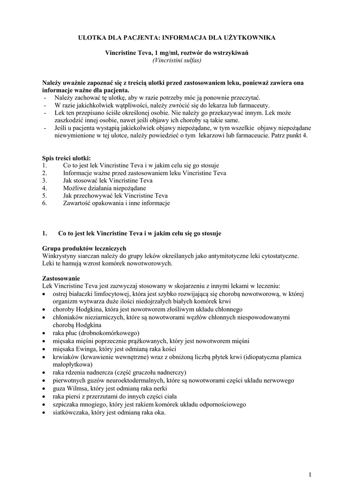 ULOTKA DLA PACJENTA: INFORMACJA DLA UŻYTKOWNIKA Vincristine Teva, 1 mg/ml, roztwór do wstrzykiwań (Vincristini sulfas) Należy uważnie zapoznać się z treścią ulotki przed zastosowaniem leku, ponieważ zawiera ona informacje ważne dla pacjenta. - Należy zachować tę ulotkę, aby w razie potrzeby móc ją ponownie przeczytać. - W razie jakichkolwiek wątpliwości, należy zwrócić się do lekarza lub farmaceuty. - Lek ten przepisano ściśle określonej osobie. Nie należy go przekazywać innym. Lek może zaszkodzić innej osobie, nawet jeśli objawy ich choroby są takie same. - Jeśli u pacjenta wystąpią jakiekolwiek objawy niepożądane, w tym wszelkie objawy niepożądane niewymienione w tej ulotce, należy powiedzieć o tym lekarzowi lub farmaceucie. Patrz punkt 4. Spis treści ulotki: 1. Co to jest lek Vincristine Teva i w jakim celu się go stosuje 2. Informacje ważne przed zastosowaniem leku Vincristine Teva 3. Jak stosować lek Vincristine Teva 4. Możliwe działania niepożądane 5. Jak przechowywać lek Vincristine Teva 6. Zawartość opakowania i inne informacje 1. Co to jest lek Vincristine Teva i w jakim celu się go stosuje Grupa produktów leczniczych Winkrystyny siarczan należy do grupy leków określanych jako antymitotyczne leki cytostatyczne. Leki te hamują wzrost komórek nowotworowych. Zastosowanie Lek Vincristine Teva jest zazwyczaj stosowany w skojarzeniu z innymi lekami w leczeniu: ostrej białaczki limfocytowej, która jest szybko rozwijającą się chorobą nowotworową, w której organizm wytwarza duże ilości niedojrzałych białych komórek krwi choroby Hodgkina, która jest nowotworem złośliwym układu chłonnego chłoniaków nieziarniczych, które są nowotworami węzłów chłonnych niespowodowanymi chorobą Hodgkina raka płuc (drobnokomórkowego) mięsaka mięśni poprzecznie prążkowanych, który jest nowotworem mięśni mięsaka Ewinga, który jest odmianą raka kości krwiaków (krwawienie wewnętrzne) wraz z obniżoną liczbą płytek krwi (idiopatyczna plamica małopłytkowa) raka rdzenia nadnercza (część gruczołu nadnerczy) pierwotnych guzów neuroektodermalnych, które są nowotworami części układu nerwowego guza Wilmsa, który jest odmianą raka nerki raka piersi z przerzutami do innych części ciała szpiczaka mnogiego, który jest rakiem komórek układu odpornościowego siatkówczaka, który jest odmianą raka oka. 1 2. Informacje ważne przed zastosowaniem leku Vincristine Teva Kiedy NIE STOSOWAĆ leku Vincristine Teva: jeśli u pacjenta stwierdzono uczulenie (nadwrażliwość) na winkrystyny siarczan lub którykolwiek z pozostałych składników tego leku (wymienionych w punkcie 6) jeśli u pacjenta występują zaburzenia nerwowo-mięśniowe znane pod nazwą choroby CharcotaMariego-Tootha jeśli u pacjenta występują ciężkie zaburzenia czynności wątroby jeśli u pacjenta występują zaparcia lub ryzyko wystąpienia blokady (niedrożności) jelit, szczególnie u dzieci jeśli pacjent otrzymuje radioterapię obejmującą wątrobę. Ostrzeżenia i środki ostrożności Lek Vincristine Teva powinien być stosowany wyłącznie pod ścisłym nadzorem lekarzy doświadczonych w leczeniu cytostatykami (lekami stosowanymi w nowotworach). Lek Vincristine Teva powinien być podawany wyłącznie drogą dożylną (do żyły) i nie może być podawany żadną inną drogą. Inne sposoby podania leku mogą doprowadzić do zgonu pacjenta. Należy unikać kontaktu siarczanu winkrystyny z oczami. W przypadku, gdy dojdzie do kontaktu z oczami, należy natychmiast przepłukać oczy dużą ilością wody. Jeżeli podrażnienie utrzymuje się, należy skontaktować się z lekarzem. Należy skontaktować się z lekarzem, jeżeli którekolwiek z poniższych ostrzeżeń dotyczy pacjenta lub dotyczyło go w przeszłości: u pacjenta występują zaburzenia układu nerwowego u pacjenta występują zaburzenia czynności wątroby, patrz również punkt “Jak stosować lek Vincristine Teva” pacjent przyjmuje leki, które mogą mieć szkodliwe działanie na układ nerwowy; lekarz będzie prowadził ścisłą obserwację pacjenta w trakcie leczenia w wyniku leczenia wystąpią zaparcia; lekarz zastosuje środki zapobiegające zaparciom, np. dostosowanie diety lub środki poprawiające ruchliwość jelit (środki przeczyszczające, zwłaszcza laktulozę) u pacjenta występują choroby serca, w tym zaburzenia o charakterze niedokrwiennym (problemy związane z sercem i krążeniem) istniejące zakażenie lub zakażenie rozwijające się w trakcie leczenia; należy poinformować o tym lekarza jeśli pacjent jest aktywny seksualnie; w trakcie leczenia oraz przez 6 miesięcy po jego zakończeniu, zarówno pacjent, jak i jego partner/partnerka powinni stosować środki zapobiegające ciąży. Winkrystyna a inne leki Uwaga: Poniższe uwagi mogą odnosić się do leków stosowanych obecnie przez pacjenta, przyjmowanych w ciągu ostatnich kilku tygodni lub leków, które pacjent może zacząć zażywać po kilku tygodniach od zakończenia leczenia lekiem Vincristine Teva. Leki wymienione w tej sekcji mogą być znane pacjentowi pod inną nazwą, często nazwą handlową. W tej części ulotki, podana jest wyłącznie nazwa substancji czynnej lub grupy substancji czynnych danego leku, a nie nazwa handlowa. Należy sprawdzić na opakowaniu lub w ulotce wszystkich zażywanych leków, jaka jest nazwa ich substancji czynnej. W przypadku jednoczesnego stosowania kilku leków, mogą one czasami wpływać wzajemnie na swoje działanie i (lub) działania niepożądane. Mówimy wówczas o interakcji. Interakcja może wystąpić, gdy ten lek stosowany jest jednocześnie z: niektórymi lekami hamującymi aktywność enzymów wątrobowych, na przykład rytonawir (stosowany w leczeniu HIV), nelfinawir (stosowany w leczeniu HIV), ketokonazol (stosowany 2 w leczeniu zakażeń grzybiczych), itrakonazol (stosowany w leczeniu zakażeń grzybiczych), erytromycyna (stos