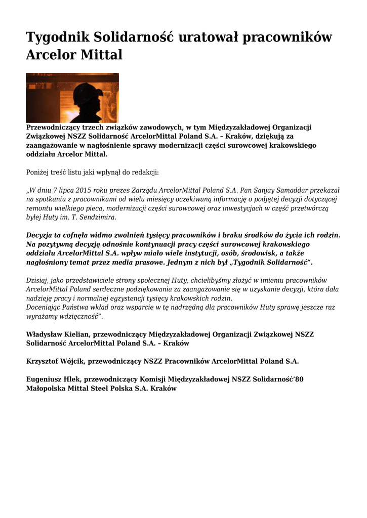 Tygodnik Solidarność uratował pracowników Arcelor Mittal Przewodniczący trzech związków zawodowych, w tym Międzyzakładowej Organizacji Związkowej NSZZ Solidarność ArcelorMittal Poland S.A. – Kraków, dziękują za zaangażowanie w nagłośnienie sprawy modernizacji części surowcowej krakowskiego oddziału Arcelor Mittal. Poniżej treść listu jaki wpłynął do redakcji: „W dniu 7 lipca 2015 roku prezes Zarządu ArcelorMittal Poland S.A. Pan Sanjay Samaddar przekazał na spotkaniu z pracownikami od wielu miesięcy oczekiwaną informację o podjętej decyzji dotyczącej remontu wielkiego pieca, modernizacji części surowcowej oraz inwestycjach w część przetwórczą byłej Huty im. T. Sendzimira. Decyzja ta cofnęła widmo zwolnień tysięcy pracowników i braku środków do życia ich rodzin. Na pozytywną decyzję odnośnie kontynuacji pracy części surowcowej krakowskiego oddziału ArcelorMittal S.A. wpływ miało wiele instytucji, osób, środowisk, a także nagłośniony temat przez media prasowe. Jednym z nich był „Tygodnik Solidarność”. Dzisiaj, jako przedstawiciele strony społecznej Huty, chcielibyśmy złożyć w imieniu pracowników ArcelorMittal Poland serdeczne podziękowania za zaangażowanie się w uzyskanie decyzji, która dała nadzieję pracy i normalnej egzystencji tysięcy krakowskich rodzin. Doceniając Państwa wkład oraz wsparcie w tę nadrzędną dla pracowników Huty sprawę jeszcze raz wyrażamy wdzięczność”. Władysław Kielian, przewodniczący Międzyzakładowej Organizacji Związkowej NSZZ Solidarność ArcelorMittal Poland S.A. – Kraków Krzysztof Wójcik, przewodniczący NSZZ Pracowników ArcelorMittal Poland S.A. Eugeniusz Hlek, przewodniczący Komisji Międzyzakładowej NSZZ Solidarność’80 Małopolska Mittal Steel Polska S.A. Kraków