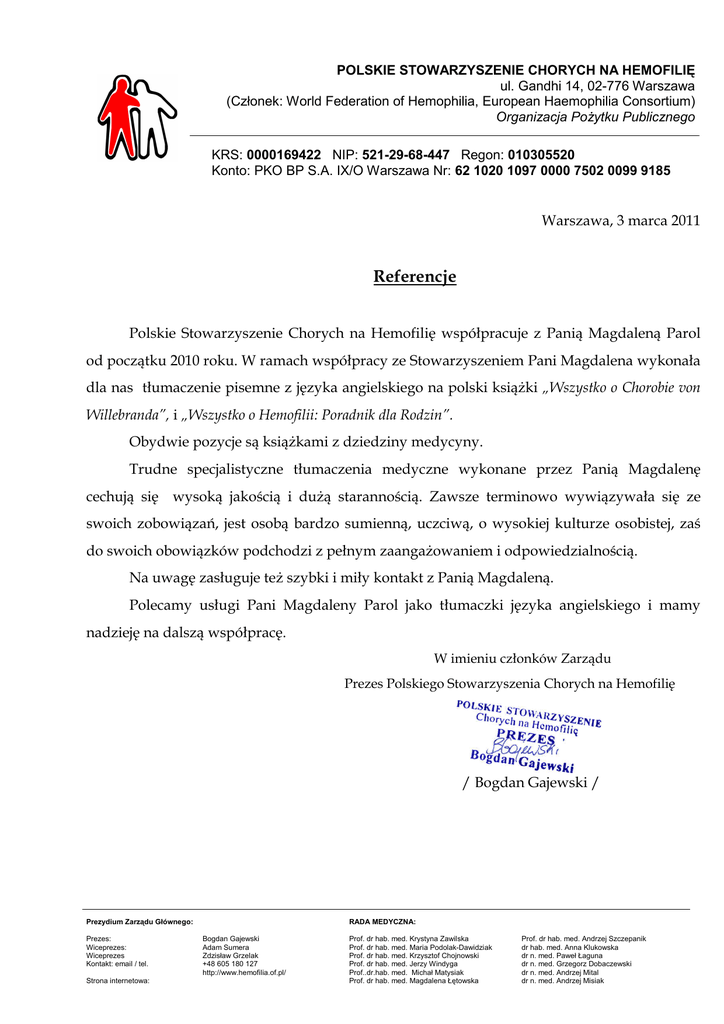 POLSKIE STOWARZYSZENIE CHORYCH NA HEMOFILIĘ ul. Gandhi 14, 02-776 Warszawa (Członek: World Federation of Hemophilia, European Haemophilia Consortium) Organizacja Pożytku Publicznego KRS: 0000169422 NIP: 521-29-68-447 Regon: 010305520 Konto: PKO BP S.A. IX/O Warszawa Nr: 62 1020 1097 0000 7502 0099 9185 Warszawa, 3 marca 2011 Referencje Polskie Stowarzyszenie Chorych na Hemofilię współpracuje z Panią Magdaleną Parol od początku 2010 roku. W ramach współpracy ze Stowarzyszeniem Pani Magdalena wykonała dla nas tłumaczenie pisemne z języka angielskiego na polski książki „Wszystko o Chorobie von Willebranda”, i „Wszystko o Hemofilii: Poradnik dla Rodzin”. Obydwie pozycje są książkami z dziedziny medycyny. Trudne specjalistyczne tłumaczenia medyczne wykonane przez Panią Magdalenę cechują się wysoką jakością i dużą starannością. Zawsze terminowo wywiązywała się ze swoich zobowiązań, jest osobą bardzo sumienną, uczciwą, o wysokiej kulturze osobistej, zaś do swoich obowiązków podchodzi z pełnym zaangażowaniem i odpowiedzialnością. Na uwagę zasługuje też szybki i miły kontakt z Panią Magdaleną. Polecamy usługi Pani Magdaleny Parol jako tłumaczki języka angielskiego i mamy nadzieję na dalszą współpracę. W imieniu członków Zarządu Prezes Polskiego Stowarzyszenia Chorych na Hemofilię / Bogdan Gajewski / Prezydium Zarządu Głównego: Prezes: Wiceprezes: Wiceprezes Kontakt: email / tel. Strona internetowa: RADA MEDYCZNA: Bogdan Gajewski Adam Sumera Zdzisław Grzelak +48 605 180 127 http://www.hemofilia.of.pl/ Prof. dr hab. med. Krystyna Zawilska Prof. dr hab. med. Maria Podolak-Dawidziak Prof. dr hab. med. Krzysztof Chojnowski Prof. dr hab. med. Jerzy Windyga Prof..dr.hab. med. Michał Matysiak Prof. dr hab. med. Magdalena Łętowska Prof. dr hab. med. Andrzej Szczepanik dr hab. med. Anna Klukowska dr n. med. Paweł Łaguna dr n. med. Grzegorz Dobaczewski dr n. med. Andrzej Mital dr n. med. Andrzej Misiak