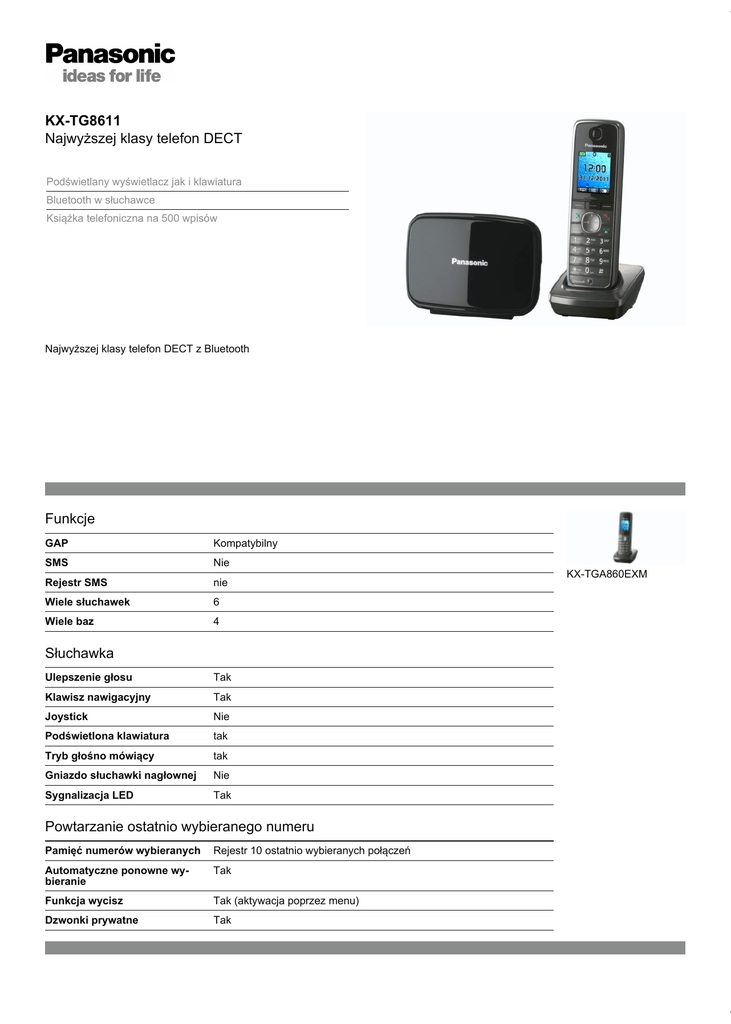 KX-TG8611 Najwyższej klasy telefon DECT Podświetlany wyświetlacz jak i klawiatura Bluetooth w słuchawce Książka telefoniczna na 500 wpisów Najwyższej klasy telefon DECT z Bluetooth Funkcje GAP Kompatybilny SMS Nie Rejestr SMS nie Wiele słuchawek 6 Wiele baz 4 Słuchawka Ulepszenie głosu Tak Klawisz nawigacyjny Tak Joystick Nie Podświetlona klawiatura tak Tryb głośno mówiący tak Gniazdo słuchawki nagłownej Nie Sygnalizacja LED Tak Powtarzanie ostatnio wybieranego numeru Pamięć numerów wybieranych Rejestr 10 ostatnio wybieranych połączeń Automatyczne ponowne wybieranie Tak Funkcja wycisz Tak (aktywacja poprzez menu) Dzwonki prywatne Tak KX-TGA860EXM Identyfikacja numeru abonenta wywołującego Prezentacja numeru aboneneta Tak wywołującego Rejestr połączeń tak Głosowa prezentacja numeru abonenta wywołującego nie Książka telefoniczna Liczba wpisów 500 wpisów (3 numery w każdym) Wybieranie jednoprzyciskowe (liczba wpisów) 9 Dzwonek Możliwość wgrywania własnych Nie dzwonków Liczba melodii dzwonka 30 Liczba sygnałów dzwonka (wbu- 10 dowane) Pobieranie melodii dzwonka nie Poziom dzwonka (7 kroków) Tak Poziomy dzwonka Tak Poziomy głośności dzwonka 6 poziomów + "wyłączony" LCD Rodzaj LCD 1,8 cala (TFT, 65,000 kolorów) Podświetlany LCD biały Zegar Data i Czas (zegar) tak Alarm tak Filtrowanie połączeń nie Restrykcje połączeń Tak Połączenie konferencyjne Tak Blokada klawiatury Tak Odbiór dowolnym klawiszem Tak Wielojęzyczny wyświetlacz tak (14) Tryb nocny Tak Tryb Walkie-Talkie Nie Wprowadzanie SMS-ów tekstowych nie Głosowe przeszukiwanie książki Nie telefonicznej Regulacja głośności słuchawki(3 Nie poziomy) Regulacja głośności słuchawki 4 kroki Elektroniczna niania Tak Połączenie z komputerem nie Podczerwień nie Akumulator Typ baterii akumulatory Ni-MH (2 x AAA) Czas ładowania 7 godzin Czas oczekiwania Do 250 godzin gotowości Czas rozmowy Czas rozmowy do 12 godzin Opcjonalna słuchawka KX-TGA860FXM Baza Klawiatura Nie Przycisk nawigacyjny Nie Książka telefoniczna nie LCD nie Sygnał dzwonka nie Mocowanie na ścianie Tak Oddzwanianie Nie Identyfikacja numeru abonenta wywołującego Prezentacja numeru aboneneta Nie wywołującego Rejestr połączeń nie Flash (ms) nie Pauza nie Lokalizator tak Automat zgłoszeniowy Łączny czas nagrywania 18 Nagrywanie rozmowy Nie Podsłuch nagrywanych wiadomości Nie Wymiary Baza (mm) Szerokość 119.0 Wysokość 88.0 Głębokość 45.0 Słuchawka (mm) Szerokość 48.0 Wysokość 154.0 Głębokość 24.0 Ładowarka (mm) Szerokość 72.0 Wysokość 43.0 Głębokość 76.0 Masa Baza (g) 120.0 Słuchawka (g) 110.0 Zasilacz (g) 50.0