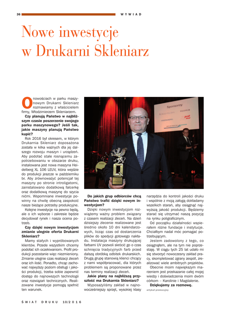 W Y W I A D 36 Nowe inwestycje w Drukarni Skleniarz O nowościach w parku maszynowym Drukarni Skleniarz rozmawiamy z właścicielem firmy, Włodzimierzem Skleniarzem. Czy planują Państwo w najbliższym czasie poszerzenie swojego parku maszynowego? Jeśli tak, jakie maszyny planują Państwo kupić? Rok 2016 był okresem, w którym Drukarnia Skleniarz doposażona została w kilka ważnych dla jej dalszego rozwoju maszyn i urządzeń. Aby podołać stale rosnącemu zapotrzebowaniu w obszarze druku, instalowana jest nowa maszyna Hei- delberg XL 106 LEUV, która wejdzie do produkcji jeszcze w październiku br. Aby zrównoważyć potencjał tej maszyny po stronie introligatorni, zainstalowano dodatkową falcerkę oraz dodatkową maszynę do szycia nićmi. Wspomniane inwestycje powinny na chwilę obecną zaspokoić nasze bieżące potrzeby produkcyjne. Kolejne inwestycje na pewno będą, ale o ich wyborze i zakresie będzie decydował rynek i nasza ocena potrzeb. Czy dzięki nowym inwestycjom zmianie ulegnie oferta Drukarni Skleniarz? Mamy stałych i wypróbowanych klientów. Przede wszystkim chcemy podołać ich oczekiwaniom. Profil produkcji pozostanie więc niezmieniony. Zmianie ulegnie czas realizacji zleceń oraz ich ilość. Ponadto, chcąc zachować najwyższy poziom obsługi i jakości produkcji, trzeba sobie zapewnić dostęp do najnowszych technologii oraz rozwiązań technicznych. Realizowane inwestycje pomogą spełnić ten warunek. Ś W I A T D R U K U 10/2 0 1 6 Do jakich grup odbiorców chcą Państwo trafić dzięki nowym inwestycjom? Dzięki nowym inwestycjom rozwiążemy ważny problem związany z czasem realizacji zleceń. Na dzień dzisiejszy zlecenie realizowane jest średnio około 10 dni kalendarzowych, licząc czas od dostarczenia plików do spedycji gotowego nakładu. Instalacja maszyny drukującej farbami UV pozwoli skrócić go o czas schnięcia tradycyjnych farb przed dalszą obróbką odbitek drukarskich. Drugą grupę stanowią klienci chcący z nami współpracować, dla których problemem są proponowane przez nas terminy realizacji zleceń. Jakie plany na najbliższą przyszłość ma Drukarnia Skleniarz? Wyposażyliśmy zakład w najnowocześniejszy sprzęt, wysokiej klasy narzędzia do kontroli jakości druku i wspólnie z moją załogą dokładamy wszelkich starań, aby osiągnąć najwyższą jakość produkcji. Będziemy starać się utrzymać naszą pozycję na rynku poligraficznym. Od początku działalności wspierałem różne fundacje i instytucje. Chciałbym nadal móc pomagać potrzebującym. Jestem zadowolony z tego, co osiągnąłem, ale na tym nie poprzestaję. W ciągu tych 25 lat udało mi się stworzyć nowoczesny zakład pracy, skompletować zgrany zespół, zrealizować wiele ambitnych projektów. Obecnie moim największym marzeniem jest przekazanie całej mojej wiedzy i doświadczenia moim dwóm córkom – Karolinie i Magdalenie. Dziękujemy za rozmowę. artykuł promocyjny