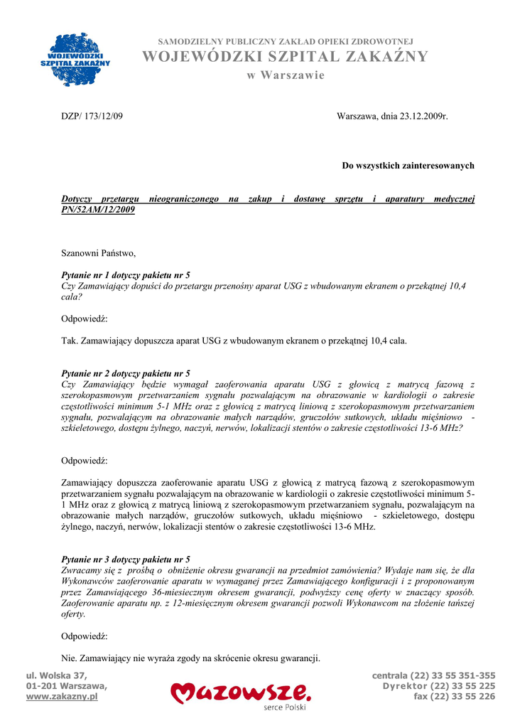 SAMODZIELNY PUBLICZNY ZAKŁAD OPIEKI ZDROWOTNEJ WOJEWÓDZKI SZPITAL ZAKAŹNY w Warszawie DZP/ 173/12/09 Warszawa, dnia 23.12.2009r. Do wszystkich zainteresowanych Dotyczy przetargu PN/52AM/12/2009 nieograniczonego na zakup i dostawę sprzętu i aparatury medycznej Szanowni Państwo, Pytanie nr 1 dotyczy pakietu nr 5 Czy Zamawiający dopuści do przetargu przenośny aparat USG z wbudowanym ekranem o przekątnej 10,4 cala? Odpowiedź: Tak. Zamawiający dopuszcza aparat USG z wbudowanym ekranem o przekątnej 10,4 cala. Pytanie nr 2 dotyczy pakietu nr 5 Czy Zamawiający będzie wymagał zaoferowania aparatu USG z głowicą z matrycą fazową z szerokopasmowym przetwarzaniem sygnału pozwalającym na obrazowanie w kardiologii o zakresie częstotliwości minimum 5-1 MHz oraz z głowicą z matrycą liniową z szerokopasmowym przetwarzaniem sygnału, pozwalającym na obrazowanie małych narządów, gruczołów sutkowych, układu mięśniowo szkieletowego, dostępu żylnego, naczyń, nerwów, lokalizacji stentów o zakresie częstotliwości 13-6 MHz? Odpowiedź: Zamawiający dopuszcza zaoferowanie aparatu USG z głowicą z matrycą fazową z szerokopasmowym przetwarzaniem sygnału pozwalającym na obrazowanie w kardiologii o zakresie częstotliwości minimum 51 MHz oraz z głowicą z matrycą liniową z szerokopasmowym przetwarzaniem sygnału, pozwalającym na obrazowanie małych narządów, gruczołów sutkowych, układu mięśniowo - szkieletowego, dostępu żylnego, naczyń, nerwów, lokalizacji stentów o zakresie częstotliwości 13-6 MHz. Pytanie nr 3 dotyczy pakietu nr 5 Zwracamy się z prośbą o obniżenie okresu gwarancji na przedmiot zamówienia? Wydaje nam się, że dla Wykonawców zaoferowanie aparatu w wymaganej przez Zamawiającego konfiguracji i z proponowanym przez Zamawiającego 36-miesiecznym okresem gwarancji, podwyższy cenę oferty w znaczący sposób. Zaoferowanie aparatu np. z 12-miesięcznym okresem gwarancji pozwoli Wykonawcom na złożenie tańszej oferty. Odpowiedź: Nie. Zamawiający nie wyraża zgody na skrócenie okresu gwarancji. ul. Wolska 37, 01-201 Warszawa, www.zakazny.pl centrala (22) 33 55 351-355 Dyr e k to r (22) 33 55 225 fax (22) 33 55 226 Pytanie nr 4 dotyczy pakietu nr 5 Rozumiemy, że punkt 18.8 SIWZ tzn. „Wykonawca przed realizacją zamówienia zobowiązany jest do przedstawienia Zamawiającemu palety kolorów do wyboru” nie dotyczy pakietu nr 5 – aparat do USG przyłóżkowy. Nasza firma nie będąc producentem oferowanego sprzętu nie ma wpływu na wybór koloru aparatu. Odpowiedź: Tak, punkt 18.8 SIWZ nie dotyczy pakietu nr 5. Pytanie nr 5 dotyczy pakietu nr 5 Z uwagi na fakt, że przełom roku jest okresem kiedy u większości producentów sprzętu medycznego trwa inwentaryzacja, zwracamy się z prośbą o wydłużenie terminu dostawy przedmiotu zamówienia do 05.02.2010r.? Dodatkowym utrudnieniem dotyczącym spełnienia terminu dostawy jest okres świąteczny, kiedy to większość przewoźników nie pracuje i nie ma możliwości podjęcia towaru od producenta. Odpowiedź: Nie. Zamawiający nie wyraża zgody na wydłużenie terminu dostawy sprzętu medycznego. Pytanie nr 6 dotyczy pakietu nr 1 Czy Zamawiający zgodzi się na zaoferowanie komory laminarnej ze sterowaniem mikroprocesowym oraz z panelem sterowania z intuicyjnymi przyciskami służącymi do włączania/wyłączania laminarnego nawiewu powietrza oraz oświetlenia w komorze , bez wyświetlacza LCD? Komora wyposażona jest ponadto w godzinowy licznik czasu pracy oraz diodę „alarmu” znajdującą się na panelu kontrolnym, zapalającą się podczas nieprawidłowej pracy komory? Odpowiedź: Tak, Zamawiający zgadza się na zaoferowanie komory laminarnej ze sterowaniem mikroprocesowym oraz z panelem sterowania z intuicyjnymi przyciskami służącymi do włączania/wyłączania laminarnego nawiewu powietrza oraz oświetlenia w komorze, bez wyświetlacza LCD. Pytanie nr 7 dotyczy pakietu nr 1 Czy Zamawiający zgodzi się na zaoferowanie komory laminarnej, w której po włączeniu ustawione są automatycznie zaprogramowane parametry pracy (szybkość przepływu powietrza 0,45 m/sekundę) z możliwością regulacji oświetlenia za pomocą przycisku na panelu sterowania (włączanie/wyłączanie)oraz z alarmem włączającym się w przypadku nieprawidłowej pracy komory, jednak bez możliwości ustawiania indywidualnych parametrów pracy? Odpowiedź: Tak. Zamawiający zgodzi się na zaoferowanie komory laminarnej, w której po włączeniu ustawione są automatycznie zaprogramowane parametry pracy (szybkość przepływu powietrza 0,45 m/sekundę) z możliwością regulacji oświetlenia za pomocą przycisku na panelu sterowania (włączanie/wyłączanie)oraz z alarmem włączającym się w przypadku nieprawidłowej pracy komory, jednak bez możliwości ustawiania indywidualnych parametrów pracy. Pytanie nr 8 dotyczy pakietu nr 1 Proszę o doprecyzowanie, czy minimalne oświetlenie komory roboczej o natężeniu 1200 lux, będzie dla Zamawiającego wystarczające? Odpowiedź: Tak, minimalne oświetlenie komory roboczej o natężeniu 1200 lux, będzie dla Zamawiającego wystarczające. Z poważaniem Katarzyna Mateńka –Ajdakowska Starszy Specjalista ds. Zamówień Publicznych UWAGA: Treść i pisownia pytań jest oryginalna, skopiowana z korespondencji przesyłanej przez zainteresowane firmy ww. przetargiem nieograniczonym. Zamawiający nie ponosi odpowiedzialności za błędy w treści pytań