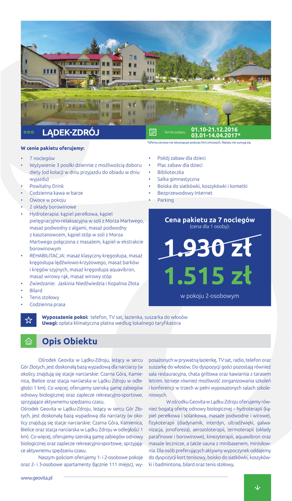 LĄDEK-ZDRÓJ Termin pobytu: 01.10-21.12.2016 03.01-14.04.2017* *Oferta cenowa nie obowiązuje podczas ferii zimowych. Rabaty nie sumują się. W cenie pakietu oferujemy: • • • • • • • • • • • • 7 noclegów Wyżywienie 3 posiłki dziennie z możliwością doboru diety (od kolacji w dniu przyjazdu do obiadu w dniu wyjazdu) Powitalny Drink Codzienna kawa w barze Owoce w pokoju 2 okłady borowinowe Hydroterapia: kąpiel perełkowa, kąpiel pielęgnacyjno-relaksacyjna w soli z Morza Martwego, masaż podwodny z algami, masaż podwodny z kasztanowcem, kąpiel stóp w soli z Morza Martwego połączona z masażem, kąpiel w ekstrakcie borowinowym REHABILITACJA: masaż klasyczny kręgosłupa, masaż kręgosłupa lędźwiowo-krzyżowego, masaż barków i kręgów szyjnych, masaż kręgosłupa aquavibron, masaż wirowy rąk, masaż wirowy stóp Zwiedzanie: Jaskinia Niedźwiedzia i Kopalnia Złota Bilard Tenis stołowy Codzienna prasa • • • • • • • Pokój zabaw dla dzieci Plac zabaw dla dzieci Biblioteczka Salka gimnastyczna Boiska do siatkówki, koszykówki i kometki Bezprzewodowy Internet Parking Cena pakietu za 7 noclegów (cena dla 1 osoby): 1.930 zł 1.515 zł w pokoju 2-osobowym Wyposażenie pokoi: telefon, TV sat, łazienka, suszarka do włosów Uwagi: opłata klimatyczna płatna według lokalnego taryfikatora Opis Obiektu Ośrodek Geovita w Lądku-Zdroju, leżący w sercu Gór Złotych, jest doskonałą bazą wypadową dla narciarzy (w okolicy znajdują się stacje narciarskie: Czarna Góra, Kamienica, Bielice oraz stacja narciarska w Lądku Zdroju w odległości 1 km). Co więcej, oferujemy szeroką gamę zabiegów odnowy biologicznej oraz zaplecze rekreacyjno-sportowe, sprzyjające aktywnemu spędzaniu czasu. Ośrodek Geovita w Lądku-Zdroju, leżący w sercu Gór Złotych, jest doskonałą bazą wypadową dla narciarzy (w okolicy znajdują się stacje narciarskie: Czarna Góra, Kamienica, Bielice oraz stacja narciarska w Lądku Zdroju w odległości 1 km). Co więcej, oferujemy szeroką gamę zabiegów odnowy biologicznej oraz zaplecze rekreacyjno-sportowe, sprzyjające aktywnemu spędzaniu czasu. Naszym gościom oferujemy 1- i 2-osobowe pokoje oraz 2- i 3-osobowe apartamenty (łącznie 111 miejsc), wywww.geovita.pl posażonych w prywatną łazienkę, TV sat, radio, telefon oraz suszarkę do włosów. Do dyspozycji gości pozostają również sala restauracyjna, chata grillowa oraz kawiarnia z tarasem letnim. Istnieje również możliwość zorganizowania szkoleń i konferencji w trzech w pełni wyposażonych salach szkoleniowych. W ośrodku Geovita w Lądku-Zdroju oferujemy również bogatą ofertę odnowy biologicznej – hydroterapii (kąpiel perełkowa i solankowa, masaże podwodne i wirowe), fizykoterapii (diadynamik, interdyn, ultradźwięki, galwanizacja, jonoforeza), aerozoloterapii, termoterapii (okłady parafinowe i borowinowe), kinezyterapii, aquawibron oraz masaże lecznicze, a także sauna z minibasenem, minisiłownia. Dla osób preferujących aktywny wypoczynek oddajemy do dyspozycji kort tenisowy, boisko do siatkówki, koszykówki i badmintona, bilard oraz tenis stołowy.