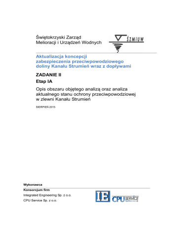 Świętokrzyski Zarząd Melioracji i Urządzeń Wodnych Aktualizacja koncepcji zabezpieczenia przeciwpowodziowego doliny Kanału Strumień wraz z dopływami ZADANIE II Etap IA Opis obszaru objętego analizą oraz analiza aktualnego stanu ochrony przeciwpowodziowej w zlewni Kanału Strumień SIERPIEŃ 2015 Wykonawca Konsorcjum firm Integrated Engineering Sp. z o.o. CPU Service Sp. z o.o. Aktualizacja koncepcji zabezpieczenia przeciwpowodziowego doliny Kanału Strumień wraz z dopływami ZADANIE II Etap IA: Opis obszaru objętego analizą oraz analiza aktualnego stanu ochrony przeciwpowodziowej w zlewni Kanału Strumień Spis Treści 1 Strona Jednostka zadaniowa - Kanał Strumień........................................................................2 1.1 1.2 1.3 Podjednostka zadaniowa Z01............................................................................3 Podjednostka zadaniowa Z03............................................................................4 Podjednostka zadaniowa Z09............................................................................1 Tabele Tabela 1. Podstawowe dane dotyczące Kanału Strumień................................................................2 Tabela 2. Ważniejsze dopływy Kanału Strumień ............................................................................2 Tabela 3. Podstawowe dane dotyczące Rowu w Zofiówce .............................................................1 Tabela 4. Podstawowe dane dotyczące Dopływu z Czarzyzny .......................................................1 Rysunki Rysunek 1. Hydrografia jednostki zadaniowej Z01 – Kanał Strumień ...........................................3 Rysunek 2. Hydrografia jednostki zadaniowej Z03 - Kanał Strumień od Cieku od Gadawy do Rząski ..............................................................................................................................................4 Rysunek 3. Hydrografia jednostki zadaniowej Z09 - Kanał Strumień od Rząski do ujścia do Wisły................................................................................................................................................1 Aktualizacja koncepcji zabezpieczenia przeciwpowodziowego doliny Kanału Strumień wraz z dopływami ZADANIE II Etap IA: Opis obszaru objętego analizą oraz analiza aktualnego stanu ochrony przeciwpowodziowej w zlewni Kanału Strumień 1 Jednostka zadaniowa - Kanał Strumień Kanał Strumień podzielony jest na 3 jednostki zadaniowe: Z01, Z03, Z09. Kanał Strumień jest lewym dopływem Wisły. Całkowita długość rzeki wynosi 46,83 km, a całkowita powierzchnia zlewni 309 km2. Dorzecze Kanału Strumień graniczy od północy ze zlewnią Czarnej, od zachodu ze zlewnią Nidy, od południa i wschodu z dorzeczem Wisły. Kanał Strumień jest typową rzeką nizinną o bardzo małym spadku. Ma szeroką terasę zalewową pokrytą głównie łąkami. Tabela 1. Podstawowe dane dotyczące Kanału Strumień Charakterystyka rzeki Kanał Strumień Długość cieku [km] Powierzchnia zlewni [km2] Położenie źródła - Kanału Strumień [m n.p.m.] Spadek podłużny cieku [‰] 46,83 309 194,9 19,24 Źródło: Mapa podziału hydrograficznego Polski 2010; Tabela 2. Ważniejsze dopływy Kanału Strumień Nazwa dopływu źródła Ciek od Gadawy (L) Km Powierzchnia zlewni [km2] 46+830 36+815 24,90 29+190 24+898 23+380 20+672 20+633 17+380 14+260 13+525 7+621 1+448 47,10 12,86 33,63 14,84 11,79 17,02 17,57 9,60 20,13 10,98 Jednostka zadaniowa Z01 Z03 Rząska (L) Kanał Nida (L) Dopływ spod Zborowa (L) Dopływ z Chrzanowa (L) Dopływ z Trzebicy (P) Dopływ spod Oblekonia (P) Dopływ ze Sroczkowa (L) Struga Komorowska (P) Ciek od Beszowej (L) Dopływ spod Grabowa (L) Źródło: Mapa podziału hydrograficznego Polski 2010; Z09 Aktualizacja koncepcji zabezpieczenia przeciwpowodziowego doliny Kanału Strumień wraz z dopływami ZADANIE II Etap IA: Opis obszaru objętego analizą oraz analiza aktualnego stanu ochrony przeciwpowodziowej w zlewni Kanału Strumień 1.1 Podjednostka zadaniowa Z01 Długość rzeki i powierzchnia zlewni w obrębie zlewni zadaniowej Z01 wynosi odpowiednio: 10,01 km i 20,91 km2. Rysunek 1. Hydrografia jednostki zadaniowej Z01 – Kanał Strumień Aktualizacja koncepcji zabezpieczenia przeciwpowodziowego doliny Kanału Strumień wraz z dopływami ZADANIE II Etap IA: Opis obszaru objętego analizą oraz analiza aktualnego stanu ochrony przeciwpowodziowej w zlewni Kanału Strumień 1.2 Podjednostka zadaniowa Z03 Długość rzeki i powierzchnia zlewni w obrębie jednostki zadaniowej Z03 wynosi ok. 7,62 km i 19,64 km2. Rysunek 2. Hydrografia jednostki zadaniowej Z03 - Kanał Strumień od Cieku od Gadawy do Rząski Aktualizacja koncepcji zabezpieczenia przeciwpowodziowego doliny Kanału Strumień wraz z dopływami ZADANIE II Etap IA: Opis obszaru objętego analizą oraz analiza aktualnego stanu ochrony przeciwpowodziowej w zlewni Kanału Strumień 1.3 Podjednostka zadaniowa Z09 Kanał Strumień Długość Kanału Strumień w obrębie jednostki zadaniowej Z09 wynosi ok. 29,19 km, a powierzchnia zlewni 61,02 km2. Rysunek 3. Hydrografia jednostki zadaniowej Z09 - Kanał Strumień od Rząski do ujścia do Wisły Aktualizacja koncepcji zabezpieczenia przeciwpowodziowego doliny Kanału Strumień wraz z dopływami ZADANIE II Etap IA: Opis obszaru objętego analizą oraz analiza aktualnego stanu ochrony przeciwpowodziowej w zlewni Kanału Strumień W obrębie jednostki zadaniowej Z09 wytypowano dwa cieki dodatkowe: Rów w Zofiówce i Dopływ z Czarzyzny. Rów w Zofiówce Rów w Zofiówce jest prawym dopływem Kanału Strumień, uchodzi do niego w km 9+680. Ciek w górnym biegu rozdziela się na dwa koryta. W związku z tym na potrzeby analiz niniejszego opracowania dokonano podziału na ciek główny i dopływ. Ciek główny, o przebiegu z zachodu na wschód, został określony jako Rów w Zofiówce A. Długość rzeki wynosi ok. 2.85 km, natomiast powierzchnia 