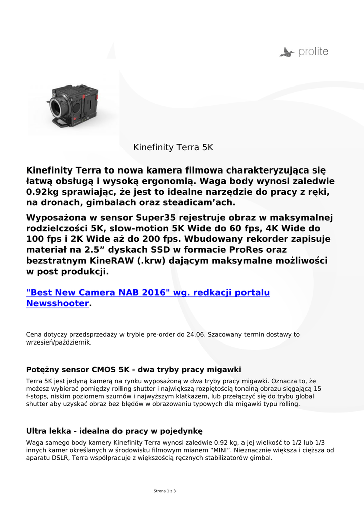 Kinefinity Terra 5K Kinefinity Terra to nowa kamera filmowa charakteryzująca się łatwą obsługą i wysoką ergonomią. Waga body wynosi zaledwie 0.92kg sprawiając, że jest to idealne narzędzie do pracy z ręki, na dronach, gimbalach oraz steadicam’ach. Wyposażona w sensor Super35 rejestruje obraz w maksymalnej rodzielczości 5K, slow-motion 5K Wide do 60 fps, 4K Wide do 100 fps i 2K Wide aż do 200 fps. Wbudowany rekorder zapisuje materiał na 2.5” dyskach SSD w formacie ProRes oraz bezstratnym KineRAW (.krw) dającym maksymalne możliwości w post produkcji. "Best New Camera NAB 2016" wg. redkacji portalu Newsshooter. Cena dotyczy przedsprzedaży w trybie pre-order do 24.06. Szacowany termin dostawy to wrzesień/październik. Potężny sensor CMOS 5K - dwa tryby pracy migawki Terra 5K jest jedyną kamerą na rynku wyposażoną w dwa tryby pracy migawki. Oznacza to, że możesz wybierać pomiędzy rolling shutter i największą rozpiętością tonalną obrazu sięgającą 15 f-stops, niskim poziomem szumów i najwyższym klatkażem, lub przełączyć się do trybu global shutter aby uzyskać obraz bez błędów w obrazowaniu typowych dla migawki typu rolling. Ultra lekka - idealna do pracy w pojedynkę Waga samego body kamery Kinefinity Terra wynosi zaledwie 0.92 kg, a jej wielkość to 1/2 lub 1/3 innych kamer określanych w środowisku filmowym mianem “MINI”. Nieznacznie większa i cięższa od aparatu DSLR, Terra współpracuje z większością ręcznych stabilizatorów gimbal. Strona 1 z 3 Dedykowane akcesoria Kinefinity daje do Twojej dyspozycji zaprojektowane specjalnie dla modelu Terra akcesoria - uchwyt boczny KineGRIP II i dedykowany monitor podglądowy KineMON-5L - które razem z kamerą tworzą najbardziej kompaktowy zestaw filmowy do pracy z ręki. Szybki workflow - ProRes + KineRAW Terra zapisuje materiał w kodeku ProRes 422HQ bezpośrednio na 2.5” dysku SSD dzięki wbudowanemu rekorderowi. Jakość 10-bitowego kodeka ProRes 422HQ gwarantuje dużo lepsze efekty niż kodeki oparte na H.264 i jest kompatybilny z oprogramowaniem do edycji NLE. Kinefinity Terra jest obecnie jedyną kamerą filmową rejestrującą materiał o rozdzielczości 5K w kodeku ProRes 422HQ. Aby zapewnić Ci maksimum możliwości w post-produkcji i kolor-korekcji, możesz użyć kodeka KineRAW (.krw) charakteryzującego się bezstratną kompresją RAW. KineRAW jest w pełni wspierany przez Scratch v8.4 i może zostać przeliczony do formatu CinemaDNG (RAW) oraz ProRes dzięki dołączonemu do każdej kamery oprogramowaniu Kinefinity KineSTATION. Profesjonalny moduł KineBACK Body kamery Terra posiada wszelkie niezbędne interfejsy, które sprostają wymaganiom niewielkiej ekipy filmowej. Dołączając moduł KineBACK, Terra zyskuje wszystkie profesjonalne porty i interfejsy niezbędne przy dużych produkcjach: KineAudio - posiada dwa wejścia mikrofonowe XLR z zasilaniem Phantom 48V, przetwornik DAC SNR do 110dB 3G-SDI do monitoringu - podwójne wyjście umożliwiające podgląd obrazu Timecode in/out - pełna synchronizacja z urządzeniami wspierającymi timecode, np. Ambient 3D Sync - synchronizacja kamer w trybie 3D/Multi-cam/VR. Wystarczy jeden przewód, aby w pełni synchronizować dwie kamery (synchornizacja odczytu matrycy CMOS, Timecode, parametry i rejestracja klatek) Wyjścia zasilające - dwa stabilizowane wyjścia 12V DC 1A do zasilania akcesoriów Adapter V-lock lub Anton-Bauer - wydajne zasilanie akumulatorowe bezpośrednio w kamerze. Wytrzymała konstrukcja adapterów została wykonana z metalu, gwarantując niezawodność w różnych warunkach. Dodatkowe 2 wyjścia D-tap umożliwią Ci podłączenie dodatkowych akcesoriów. Wyposażony w impnującą liczbę funkcji moduł KineBACK ma przy tym zaledwie 38mm długości, idealnie komponując się z niewielkim body kamery. Terra Bo Zestawy Kinefinity Terra: Kinefinity Terra Body (mocowanie A-EF lub KineMOUNT) Zapis KineRAW (.krw) HiSpeed Option KineStation + + + + + + + + + + + + Strona 2 z 3 KineBACK WiFi Option KineGRIP II KineBAT-30W Battery Pack KineMON-5L 5" monitor FullHD KineMAG 120GB 2.5" SSD Zasilacz sieciowy 110-230V AC Przewód zasilający D-tap Movcam KineKIT Terra Case transportowy Ceny brutto (z 23% VAT): Kinefinity Terra 5K Kinefinity Terra 6K + + + + + + + + + + + + + + + + 26750 zł 32100 zł 34770 zł 37450 zł 45470 zł 48150 zł Strona 3 z 3