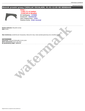 Informacje o produkcie Utworzono 04-03-2017 Błotnik przedni prawy CADILLAC ESCALADE, 01.01-12.05 OE 88980449 Cena : 1.641,71 zł (netto) 2.019,30 zł (brutto) Nr katalogowy : 215002 Producent : Zamiennik Stan magazynowy : niski Średnia ocena : brak recenzji er m ar k Rodzaj nadwozia: Wszystkie wersje Opis: prawy Stan techniczny: przedmiot jest nieużywany, fabrycznie nowy, towar posiada gwarancję oraz certyfikat jakości. w at ZASTOSOWANIE Samochód: CADILLAC ESCALADE, 01.01-12.05 Okres stosowania: Przez cały okres Nr porównawczy OEM: 88980449 Wygenerowano w programie www.oscGold.com