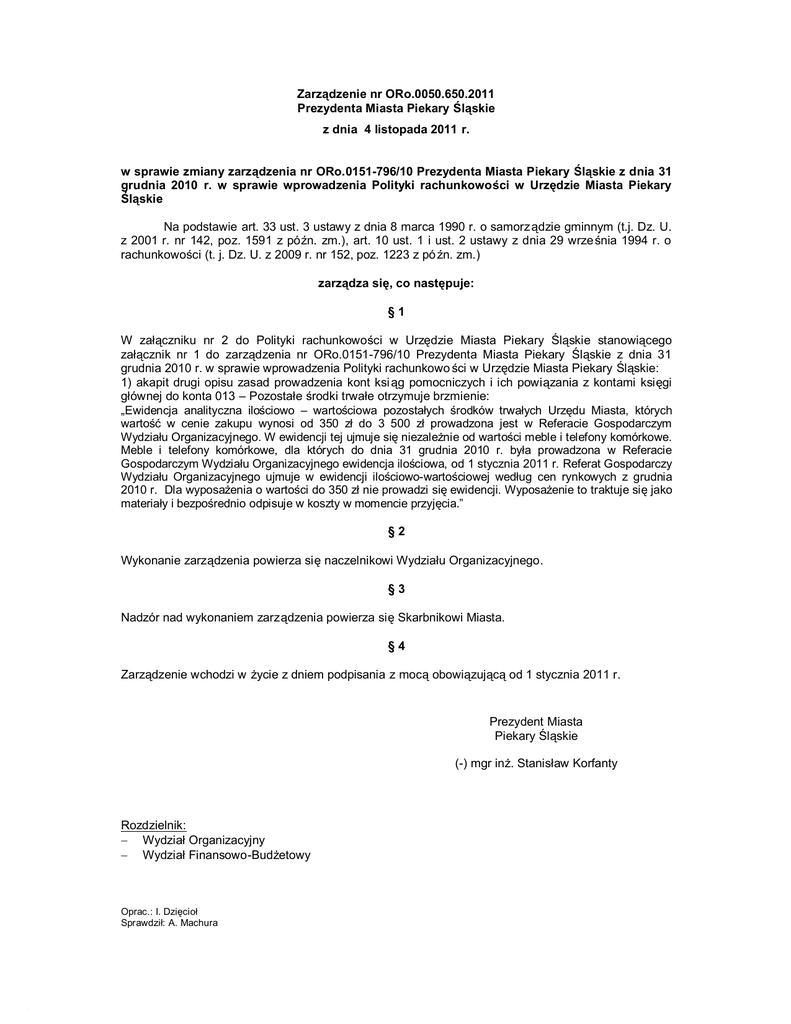 Zarządzenie nr ORo.0050.650.2011 Prezydenta Miasta Piekary Śląskie z dnia 4 listopada 2011 r. w sprawie zmiany zarządzenia nr ORo.0151-796/10 Prezydenta Miasta Piekary Śląskie z dnia 31 grudnia 2010 r. w sprawie wprowadzenia Polityki rachunkowości w Urzędzie Miasta Piekary Śląskie Na podstawie art. 33 ust. 3 ustawy z dnia 8 marca 1990 r. o samorządzie gminnym (t.j. Dz. U. z 2001 r. nr 142, poz. 1591 z późn. zm.), art. 10 ust. 1 i ust. 2 ustawy z dnia 29 wrze śnia 1994 r. o rachunkowości (t. j. Dz. U. z 2009 r. nr 152, poz. 1223 z pó źn. zm.) zarządza się, co następuje: §1 W załączniku nr 2 do Polityki rachunkowości w Urzędzie Miasta Piekary Śląskie stanowiącego załącznik nr 1 do zarządzenia nr ORo.0151-796/10 Prezydenta Miasta Piekary Śląskie z dnia 31 grudnia 2010 r. w sprawie wprowadzenia Polityki rachunkowo ści w Urzędzie Miasta Piekary Śląskie: 1) akapit drugi opisu zasad prowadzenia kont ksi ąg pomocniczych i ich powiązania z kontami księgi głównej do konta 013 – Pozostałe środki trwałe otrzymuje brzmienie: „Ewidencja analityczna ilościowo – wartościowa pozostałych środków trwałych Urzędu Miasta, których wartość w cenie zakupu wynosi od 350 zł do 3 500 zł prowadzona jest w Referacie Gospodarczym Wydziału Organizacyjnego. W ewidencji tej ujmuje się niezależnie od wartości meble i telefony komórkowe. Meble i telefony komórkowe, dla których do dnia 31 grudnia 2010 r. była prowadzona w Referacie Gospodarczym Wydziału Organizacyjnego ewidencja ilościowa, od 1 stycznia 2011 r. Referat Gospodarczy Wydziału Organizacyjnego ujmuje w ewidencji ilościowo-wartościowej według cen rynkowych z grudnia 2010 r. Dla wyposażenia o wartości do 350 zł nie prowadzi się ewidencji. Wyposażenie to traktuje się jako materiały i bezpośrednio odpisuje w koszty w momencie przyjęcia.” §2 Wykonanie zarządzenia powierza się naczelnikowi Wydziału Organizacyjnego. §3 Nadzór nad wykonaniem zarządzenia powierza się Skarbnikowi Miasta. §4 Zarządzenie wchodzi w życie z dniem podpisania z mocą obowiązującą od 1 stycznia 2011 r. Prezydent Miasta Piekary Śląskie (-) mgr inż. Stanisław Korfanty Rozdzielnik: − Wydział Organizacyjny − Wydział Finansowo-Budżetowy Oprac.: I. Dzięcioł Sprawdził: A. Machura Uzasadnienie Zgodnie z art. 10 ust. 2 ustawy z dnia 29 września 1994 r. o rachunkowości, na kierowniku jednostki ciąży obowiązek ustalenia w formie pisemnej i aktualizacji przyj ętych w jednostce zasad rachunkowości. Niniejszym zarządzeniem uaktualnia się zasady prowadzenia kont analitycznych w zakresie pozostałych środków trwałych w Urzędzie Miasta Piekary Śląskie. SKARBNIK MIASTA Piekary Śląskie mgr Ireneusz Dzięcioł