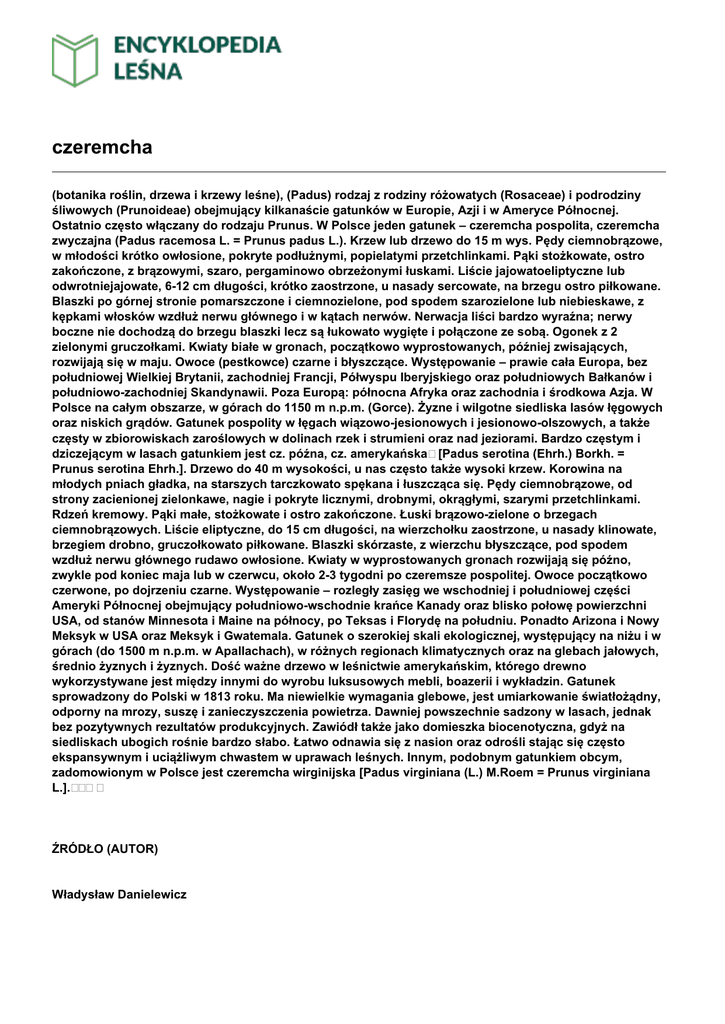 czeremcha (botanika roślin, drzewa i krzewy leśne), (Padus) rodzaj z rodziny różowatych (Rosaceae) i podrodziny śliwowych (Prunoideae) obejmujący kilkanaście gatunków w Europie, Azji i w Ameryce Północnej. Ostatnio często włączany do rodzaju Prunus. W Polsce jeden gatunek – czeremcha pospolita, czeremcha zwyczajna (Padus racemosa L. = Prunus padus L.). Krzew lub drzewo do 15 m wys. Pędy ciemnobrązowe, w młodości krótko owłosione, pokryte podłużnymi, popielatymi przetchlinkami. Pąki stożkowate, ostro zakończone, z brązowymi, szaro, pergaminowo obrzeżonymi łuskami. Liście jajowatoeliptyczne lub odwrotniejajowate, 6-12 cm długości, krótko zaostrzone, u nasady sercowate, na brzegu ostro piłkowane. Blaszki po górnej stronie pomarszczone i ciemnozielone, pod spodem szarozielone lub niebieskawe, z kępkami włosków wzdłuż nerwu głównego i w kątach nerwów. Nerwacja liści bardzo wyraźna; nerwy boczne nie dochodzą do brzegu blaszki lecz są łukowato wygięte i połączone ze sobą. Ogonek z 2 zielonymi gruczołkami. Kwiaty białe w gronach, początkowo wyprostowanych, później zwisających, rozwijają się w maju. Owoce (pestkowce) czarne i błyszczące. Występowanie – prawie cała Europa, bez południowej Wielkiej Brytanii, zachodniej Francji, Półwyspu Iberyjskiego oraz południowych Bałkanów i południowo-zachodniej Skandynawii. Poza Europą: północna Afryka oraz zachodnia i środkowa Azja. W Polsce na całym obszarze, w górach do 1150 m n.p.m. (Gorce). Żyzne i wilgotne siedliska lasów łęgowych oraz niskich grądów. Gatunek pospolity w łęgach wiązowo-jesionowych i jesionowo-olszowych, a także częsty w zbiorowiskach zaroślowych w dolinach rzek i strumieni oraz nad jeziorami. Bardzo częstym i dziczejącym w lasach gatunkiem jest cz. późna, cz. amerykańska [Padus serotina (Ehrh.) Borkh. = Prunus serotina Ehrh.]. Drzewo do 40 m wysokości, u nas często także wysoki krzew. Korowina na młodych pniach gładka, na starszych tarczkowato spękana i łuszcząca się. Pędy ciemnobrązowe, od strony zacienionej zielonkawe, nagie i pokryte licznymi, drobnymi, okrągłymi, szarymi przetchlinkami. Rdzeń kremowy. Pąki małe, stożkowate i ostro zakończone. Łuski brązowo-zielone o brzegach ciemnobrązowych. Liście eliptyczne, do 15 cm długości, na wierzchołku zaostrzone, u nasady klinowate, brzegiem drobno, gruczołkowato piłkowane. Blaszki skórzaste, z wierzchu błyszczące, pod spodem wzdłuż nerwu głównego rudawo owłosione. Kwiaty w wyprostowanych gronach rozwijają się późno, zwykle pod koniec maja lub w czerwcu, około 2-3 tygodni po czeremsze pospolitej. Owoce początkowo czerwone, po dojrzeniu czarne. Występowanie – rozległy zasięg we wschodniej i południowej części Ameryki Północnej obejmujący południowo-wschodnie krańce Kanady oraz blisko połowę powierzchni USA, od stanów Minnesota i Maine na północy, po Teksas i Florydę na południu. Ponadto Arizona i Nowy Meksyk w USA oraz Meksyk i Gwatemala. Gatunek o szerokiej skali ekologicznej, występujący na niżu i w górach (do 1500 m n.p.m. w Apallachach), w różnych regionach klimatycznych oraz na glebach jałowych, średnio żyznych i żyznych. Dość ważne drzewo w leśnictwie amerykańskim, którego drewno wykorzystywane jest między innymi do wyrobu luksusowych mebli, boazerii i wykładzin. Gatunek sprowadzony do Polski w 1813 roku. Ma niewielkie wymagania glebowe, jest umiarkowanie światłożądny, odporny na mrozy, suszę i zanieczyszczenia powietrza. Dawniej powszechnie sadzony w lasach, jednak bez pozytywnych rezultatów produkcyjnych. Zawiódł także jako domieszka biocenotyczna, gdyż na siedliskach ubogich rośnie bardzo słabo. Łatwo odnawia się z nasion oraz odrośli stając się często ekspansywnym i uciążliwym chwastem w uprawach leśnych. Innym, podobnym gatunkiem obcym, zadomowionym w Polsce jest czeremcha wirginijska [Padus virginiana (L.) M.Roem = Prunus virginiana L.]. ŹRÓDŁO (AUTOR) Władysław Danielewicz