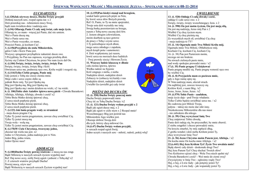ŚPIEWNIK WSPÓLNOTY MIŁOŚĆ I MIŁOSIERDZIE JEZUSA – SPOTKANIE MŁODYCH 08-11-2014 EUCHARYSTIA 1.(ś.120)Jak ożywczy deszcz, Duchu Święty przyjdź Dotknij naszych serc, rozpal ognia żar. x 2 Dziś przenikaj nas - tchnieniem mocy Swej, bądź nam światłem dnia i nadzieją serc. 2. (ś.94) Ofiaruję Panie Ci cały mój świat, całe moje życie. Ofiaruję to, co mam - więcej już Panie, dać nie umiem. Weź o Panie duszę mą. Weź o Panie serce me. Weź o Panie wszystko, co mam... Przecież Panie, ja kocham Cię!. 3. (ś.156)Przyjdźcie do stołu Miłosierdzia, gdzie Ciało i Krew Pana jest. Wszyscy spragnieni przybądźcie nakarmić dusze swe. 2.Przyjdźmy, bo Pan nas zaprasza, wyciąga przebitą dłoń. Syćmy się Ciałem Chrystusa, bo przez Nie nam życie dał On. 4. (ś.104) Święty, święty, święty, święty, święty Pan Święty, święty, święty, święty Bóg i Król. Otwieram serce me, podnoszę ręce swe, Królu wejdź i rozgość się. 5. (ś.114)Tylko Ciebie pragnę, Panie mój Gdy jestem z Tobą nie cieszy ziemia mnie. Moje ciało i serce często słabe są jednak Boże mój, Tyś jest Opoką mą. Bóg jest Opoką mą, Bóg jest Opoką mą Bóg jest Opoka mą i moim działem na wieki, x2 /na wieki. 6. (ś. 106)Tobie chór Aniołów śpiewa nową pieśń - Chwała Barankowi. Alleluja, Alleluja, Alleluja, chwała i cześć! x2 Tobie Boża Matko dzisiaj śpiewać chcę, Z serca niech popłynie pieśń. Tobie Boża Matko dzisiaj śpiewać chcę, Z serca niech popłynie pieśń. 7. (ś.123) Jak łania pragnie wody ze strumieni - moja dusza pragnie Cię. Tylko Ty jesteś moim pragnieniem, zawsze chcę uwielbiać Cię. Tylko Ty jesteś mocą mą Twoja wola - wolą mą. Tylko Ty jesteś moim pragnieniem, zawsze chcę-uwielbiać Cię. 8. (ś.170)W Ciele Chrystusa, tworzymy jedno, chociaż tak wielu nas jest. x2 Jedno w Chrystusie, jedna nadzieja jest w Nim. Jeden Bóg, jedna wiara, Jeden Ojciec nasz! ADORACJA 9. (ś.180)Duchu Święty powiej wiatrem i z mocą na nas zstąp. Bądź Miłością w naszych sercach życiem wypełnij nas! Ref: Daj nowe oczy, ześlij Swój ogień i jedność z Tobą daj! x2 2. Z czterech wiatrów przybądź Duchu! Powiej mocą, ożyw nas! Bądź Wolnością w naszych sercach Życiem wypełnij nas! 10. (ś.155)Pan kiedyś stanął nad brzegiem, szukał ludzi gotowych pójść za Nim, by łowić serca słów Bożych prawdą. Ref: O, Panie, to Ty na mnie spojrzałeś, Twoje usta dziś wyrzekły me imię. Swoją barkę pozostawiam na brzegu, razem z Tobą nowy zacznę dziś łów. 2. Jestem ubogim człowiekiem, moim skarbem są ręce gotowe do pracy z Tobą i czyste serce. 3.Ty potrzebujesz mych dłoni, mego serca młodego z zapałem, mych kropli potu i samotności. 4. Dziś wypłyniemy już razem, łowić serca na morzach dusz ludzkich - Twej prawdy siecią i Słowem Życia. 11. Wszyscy ludzie klaszczą w dłonie cała ziemia śpiewa, śpiewa Wielka radość na Syjonie Król zstępuje z nieba, z nieba Nadejdzie dzień, nadejdzie dzień Zobaczy to (zobaczy to) każdy z nas Nadejdzie dzień, nadejdzie dzień Uwielbi Go (uwielbi go) cały świat PIEŚNI DO DUCHA ŚW. 12. (ś. 550) Duchu Święty pouczaj mnie Duchu Święty poprowadź mnie Chcę iść za Tobą Duchu Święty /x2 13. (ś. 121) Duchu Święty wołam przyjdź x 2 Bądź jak ogień duszy mej, x 2 Bądź jak ogień w ciele mym x 2 Rozpal mnie! Wszechmogący Bóg jest pośród nas Miłosierdzie Jego wielkie jest. Okazuje dobroć Swoją dziś dla tych, którzy chcą miłować Go. 14.(ś.47) Duchu Święty wołam przyjdź, w sercach rozpal ogień Swój. Jedno uczyń z naszych serc - miłość, radość, pokój wlej! UWIELBIENIE 13. (ś. 520) Oddaję Ci całą chwałę i cześć, oddaję Ci całe serce swe. x 2 Święty, święty, święty wszechmogący Jezu. x 2 14. (ś. 590) On jest moim życiem, On jest moją siłą, On jest mą nadzieją, Jezus mój Pan x 2 Wielbić Cię chcę życiem mym. Wielbić Cię chcę pieśnią mą. Ze wszystkich mych sił, uwielbiać Cię chcę - moja nadzieja to TY! 15. (ś. 14) Ogarnęła mnie Twa Miłość Królu mój. Ogarnęła mnie Twa Miłość, Oblubieńcze mój. Kocham Cię, kocham Cię, kocham Cię. 16. (ś. 38) Pan jest Pasterzem moim, niczego mi nie braknie. Na niwach zielonych pasie mnie, nad wody spokojne prowadzi mnie / x2 17.(ś. 35) Panie pragnę Ci dziękować Panie pragnę modlić się. Panie pragnę wznosić ręce swe by wielbić Cię. 18. (ś. 8) Przyjaciela mam co pociesza mnie, gdy o Jego ramię oprę się. W Nim nadzieję mam, uleciał strach. On najbliżej jest, zawsze troszczy się. Królów Król, z nami Bóg. /x2 Jezus, Jezus, Jezus, Jezus. /x2 19. (ś.579) Tobie Panie - zaufałem, moje życie daje - pod Twoje władanie. Tylko Ciebie będzie uwielbiać serce me. / x2 Bo cudowna jest Miłość Twoja, jedyna – takiej nie może dać nikt inny. Nieskończone Miłosierdzie dla nas masz - nie zabraknie dla nikogo. 20. (ś. 59) Chcę wywyższać Imię Twe Chcę zaśpiewać Tobie chwałę, Panie dziś raduję się, bo przyszedłeś, by mnie zbawić. Z nieba zstąpiłeś i chcesz prowadzić mnie, Na krzyżu zmarłeś, by mój zapłacić dług, Z grobu wstałeś i dziś nieba Królem jesteś Ty, chcę wywyższać Imię Twe! 21. (ś. 56) Jezus Chrystus moim Panem jest, Alleluja. / x2 On kocha mnie On kocha mnie Alleluja. / x2 22.(s.441) Hej Jezu Królem Tyś! Życie Twe uwalnia mnie! Będę sławić cały dzień - doskonałe drogi Twe! Hej Jezu Panem Tyś! Chcę słuchać Twoich słów! Twe Królestwo ujrzeć chcę - Wola Twa niech spełni się! Chwała Barankowi cześć! - Weź mnie do ziemi swej! Zwyciężymy w Imię Twe - ogłosimy rządy Twe! Hej, o hej, o Lwie Judy - jak potężny jesteś Ty! Hej, o hej, o Lwie Judy - jak wspaniały jesteś Ty.