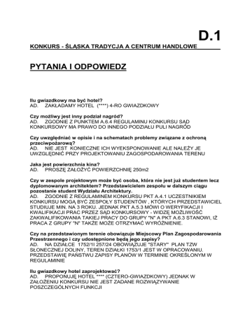 D.1 KONKURS - ŚLĄSKA TRADYCJA A CENTRUM HANDLOWE_______ PYTANIA I ODPOWIEDZ Ilu gwiazdkowy ma być hotel? AD. ZAKŁADAMY HOTEL (****) 4-RO GWIAZDKOWY Czy moŜliwy jest inny podział nagród? AD. ZGODNIE Z PUNKTEM A.6.4 REGULAMINU KONKURSU SĄD KONKURSOWY MA PRAWO DO INNEGO PODZIAŁU PULI NAGRÓD Czy uwzględniać w opisie i na schematach problemy związane z ochroną przeciwpoŜarową? AD. NIE JEST KONIECZNE ICH WYEKSPONOWANIE ALE NALEśY JE UWZGLĘDNIĆ PRZY PROJEKTOWANIU ZAGOSPODAROWANIA TERENU Jaka jest powierzchnia kina? AD. PROSZĘ ZAŁOśYĆ POWIERZCHNIĘ 250m2 Czy w zespole projektowym moŜe być osoba, która nie jest juŜ studentem lecz dyplomowanym architektem? Przedstawicielem zespołu w dalszym ciągu pozostanie student Wydziału Architektury. AD. ZGODNIE Z REGULAMINEM KONKURSU PKT A.4.1 UCZESTNIKIEM KONKURSU MOGĄ BYĆ ZESPOŁY STUDENTÓW , KTÓRYCH PRZEDSTAWICIEL STUDIUJE MIN. NA 3 ROKU. JEDNAK PKT A.5.3 MÓWI O WERYFIKACJI I KWALIFIKACJI PRAC PRZEZ SĄD KONKURSOWY - WIDZĘ MOśLIWOŚĆ ZAKWALIFIKOWANIA TAKIEJ PRACY DO GRUPY "N" A PKT A.6.3 STANOWI, Iś PRACA Z GRUPY "N" TAKśE MOśE OTRZYMAĆ WYRÓśNIENIE. Czy na przedstawionym terenie obowiązuje Miejscowy Plan Zagospodarowania Przestrzennego i czy udostępnione będą jego zapisy? AD. NA DZIAŁCE 1752/1I 257/24 OBOWIĄZUJE "STARY" PLAN TZW SŁONECZNEJ DOLINY, TEREN DZIAŁKI 1753/1 JEST W OPRACOWANIU. PRZEDSTAWIĘ PAŃSTWU ZAPISY PLANÓW W TERMINIE OKREŚLONYM W REGULAMINIE Ilu gwiazdkowy hotel zaprojektować? AD. PROPONUJĘ HOTEL **** (CZTERO-GWIAZDKOWY) JEDNAK W ZAŁOśENIU KONKURSU NIE JEST ZADANE ROZWIĄZYWANIE POSZCZEGÓLNYCH FUNKCJI Jednostka mieszkalna to pokój czy 100 osób? AD. PROSTUJĘ- HOTEL PRZEWIDZIANY JEST NA 100 MIEJSC NOCLEGOWYCH - TJ. 100 OSÓB. W PROGRAMIE PODANA JEST SUGEROWANA ILOŚĆ POSZCZEGÓLNYCH POKOI: 10-JEDNO-, 45-DWUOSOBOWYCH ORAZ DWA APARTAMENTY. JEDNAK PROSZĘ TO TRAKTOWAĆ JAKO INFORMACJĘ OKREŚLAJĄCĄ POWIERZCHNIE I KUBATURE HOTELU. Czy przewidzieć naleŜy osobny parking dla hotelu? AD. NALEśY ZAPROJEKTOWAĆ WYDZIELONY PARKING DLA HOTELU. Czy ograniczona jest liczba plansz? AD. NIE, ILOŚĆ PLANSZ JEST DOWOLNA. Czy istnieje jakaś oficjalna lista uczestników konkursu, na którą, osoba chcąca wziąć udział w konkursie, musi być wpisana? AD. NIE MA LISTY OSÓB CHĘTNYCH DO WZIĘCIA UDZIAŁU W KONKURSIE. OSOBA ZAINTERESOWANA POBIERA MATERIAŁY KONKURSOWE ZE STRONY WWW.PROINSTAL.PL LUB OD SEKRETARZA ORGANIZACYJNEGO LUB (SZCZERZE MÓWIĄC) W DOWOLNY SPOSÓB. ZASADNICZY JEST FAKT ZŁOśENIA PRACY ZGODNIE Z REGULAMINEM ZE WSZYSTKIMI ODPOWIEDNIMI PODPISANYMI ZAŁĄCZNIKAMI. Czy na strefach ochronnych gazu moŜna usytuować parkingi? Szukając odpowiedzi na pytania spotkałam się z róŜnymi opiniami, np. takimi, Ŝe takie ciągi stref ochronnych drogi mogą jedynie przecinać, a parkingów nie wolno usytuować wzdłuŜ strefy. Bardzo proszę o wyjaśnienie wątpliwości. AD. PROSZĘ NIELOKALIZOWAĆ PARKINGÓW W STREFIE OCHRONY GAZOCIĄGU. CIĄGI KOMUNIKACYJNE MOGĄ JE PRZECINAĆ, STOSUJE SIĘ WTEDY RURY OSŁONOWE Z SĄCZKAMI ZAPACHOWYMI. W jakiej skali mają być rzuty (przekroje poziome) obiektów? Czy mogą być w skali 1:200? AD. TAK RZUTY OBIEKTÓW MOGĄ BYĆ W SKALI 1:200. PROSZĘ PAMIĘTAĆ, śE NIE CHODZI NAM O ROZWIĄZANIE FUNKCJONALNE POSZCZEGÓLNYCH OBIEKTÓW A O ICH POWIĄZANIE FUNKCJONALNE. Proszę o skonkretyzowanie punktu B3/3.1/3.1.1 podpunkt d. "wybrane elewacje i charakterystyczne przekroje - skala 1:100"Rozumiem Ŝe chodzi o przekroje pionowe. Czy wszystkie charakterystyczne przekroje maja być w skali 1:100 czy spośród kilku wybrać i przedstawić je w skali 1:100, a resztę w 1:200. AD. TAK, WYSTARCZY JEDEN PRZEKRÓJ W SKALI 1;100 JEŚLI JEST CHARAKTERYSTYCZNY. PRZEKROJE 1:200 MAJĄ MIEĆ "CHARAKTER URBANISTYCZNY". MAJĄ POKAZAĆ WNĘTRZA URBANISTYCZNE I SKALĘ ZAŁOśENIA. Czy funkcje poszczególnych obiektów, zgodnie z programem funkcjonalnym moŜna przemieszać. Np. Funkcje kulturowo-rozrywkową z handlową? AD. TAK, NALEśY TYLKO UWZGLĘDNIĆ WYMÓG LOKALIZACJI ZESPOŁU HOTELOWEGO Z PRZYNAJMNIEJ FRAGMENTEM CZ. RESTAURACYJNEJ W ISZYM ETAPIE. Czy jest ograniczona liczba plansz? Z regulaminu nie wynika czy plansze mają być wydrukowane? Proszę o udzielenie odpowiedzi. AD. NIE OGRANICZAMY LICZBY PLANSZ. PLANSZE NIE MUSZĄ BYĆ DRUKOWANE, MOGĄ BYĆ WYKONANE DOWOLNĄTECHNIKĄ. WARUNKIEM REGULAMINOWYM JEST PRZEDSTAWIENIE WIZUALIZACJI - JEDNAK WYOBRAśAM SOBIE PERSPEKTYWY WYKONANE TECHNIKĄ RYSUNKOWĄ, MALARSKĄ ITP.