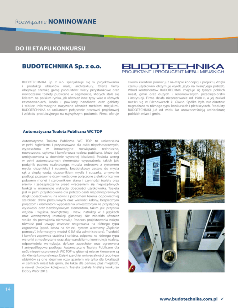 Rozwiązanie NOMINOWANE DO III ETAPU KONKURSU BUDOTECHNIKA Sp. z o.o. BUDOTECHNIKA Sp. z o.o. specjalizuje się w projektowaniu i produkcji obiektów małej architektury. Oferta firmy obejmuje szeroką gamę produktów: wiaty przystankowe oraz nowoczesne toalety publiczne w segmencie, których stała się liderem na polskim rynku, jak również inne typy wiat o różnych zastosowaniach, kioski i pawilony handlowe oraz gabloty i tablice informacyjne nazywane również meblami miejskimi. BUDOTECHNIKA to unikatowe połączenie pracowni projektowej i zakładu produkcyjnego na najwyższym poziomie. Firma oferuje swoim klientom pomoc już na etapie koncepcji i projektu, dzięki czemu użytkownik otrzymuje wyrób „szyty na miarę” jego potrzeb. Wśród kontrahentów BUDOTECHNIKI znajduje się tysiące polskich miast, gmin oraz dużych i renomowanych przedsiębiorstw i instytucji. Firma działa nieprzerwanie od 1988 r., a jej zakład mieści się w Pilchowicach k. Gliwic. Spółka była wielokrotnie nagradzana w różnego typu konkursach i plebiscytach. Produkty BUDOTECHNIKI już od wielu lat unowocześniają architekturę polskich miast i gmin. Automatyczna Toaleta Publiczna WC TOP Automatyczna Toaleta Publiczna WC TOP to uniwersalna w pełni higieniczna i przystosowana dla osób niepełnosprawnych, wyposażona w innowacyjne rozwiązania techniczne, nowoczesna, stylowa i komfortowa toaleta publiczna. Może być umiejscowiona w dowolnie wybranej lokalizacji. Posiada szereg w pełni automatycznych elementów wyposażenia, takich jak: podajnik papieru toaletowego, muszla sedesowa z systemem mycia, dezynfekcji i suszenia, bezdotykowy zestaw do mycia rąk z ciepłą wodą, dozownikiem mydła i suszarką, zmywanie podłogi, przesuwne drzwi wejściowe połączone z elektronicznym poborem monet i sterownikiem stanu i czynności toalety oraz alarmy i zabezpieczenia przed włączeniem się niepożądanych funkcji w momencie wykrycia obecności użytkownika. Toaleta jest w pełni przystosowana dla potrzeb osób niepełnosprawnych dzięki posadowieniu na równi z poziomem terenu, odpowiedniej szerokości drzwi przesuwnych oraz wielkości kabiny, bezpiecznym poręczom i elementom wyposażenia umieszczonym na przystępnej wysokości oraz bezdotykowym elementom, takim jak: przyciski wejścia i wyjścia, zewnętrznej i wew. instrukcji w 3 językach oraz wewnętrznej instrukcji głosowej. Nie zabrakło również stolika do przewijania niemowląt. Podczas projektowania wzięto również pod uwagę wczesne reagowania na różnego typu zagrożenia (ppoż. kosza na śmieci, system alarmowy „Żądanie pomocy”, informacyjny moduł GSM dla administratora). Trwałość i komfort zapewnia stabilna i solidna, odporna na różnego typu warunki atmosferyczne oraz akty wandalizmu konstrukcja toalety, odpowiednia wentylacja, dyfuzor zapachów oraz ogrzewana i antypoślizgowa podłoga. Automatyczne Toalety Publiczne dla osób niepełnosprawnych WC TOP w głównej mierze kierowane są do klienta komunalnego. Dzięki szerokiej uniwersalności tego typu obiektów są one idealnym rozwiązaniem nie tylko dla lokalizacji w centrach miast lub gmin, ale także dla parków, plaż miejskich, a nawet dworców kolejowych. Toaleta została finalistą konkursu Dobry Wzór 2013. 14 www.budotechnika.com.pl m